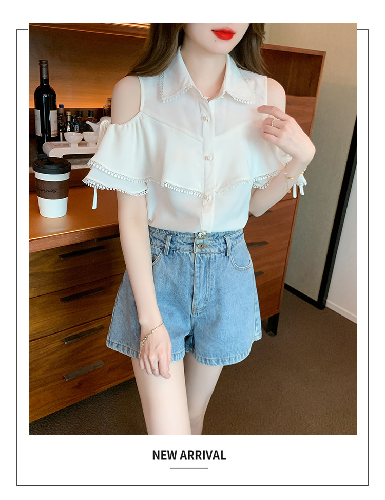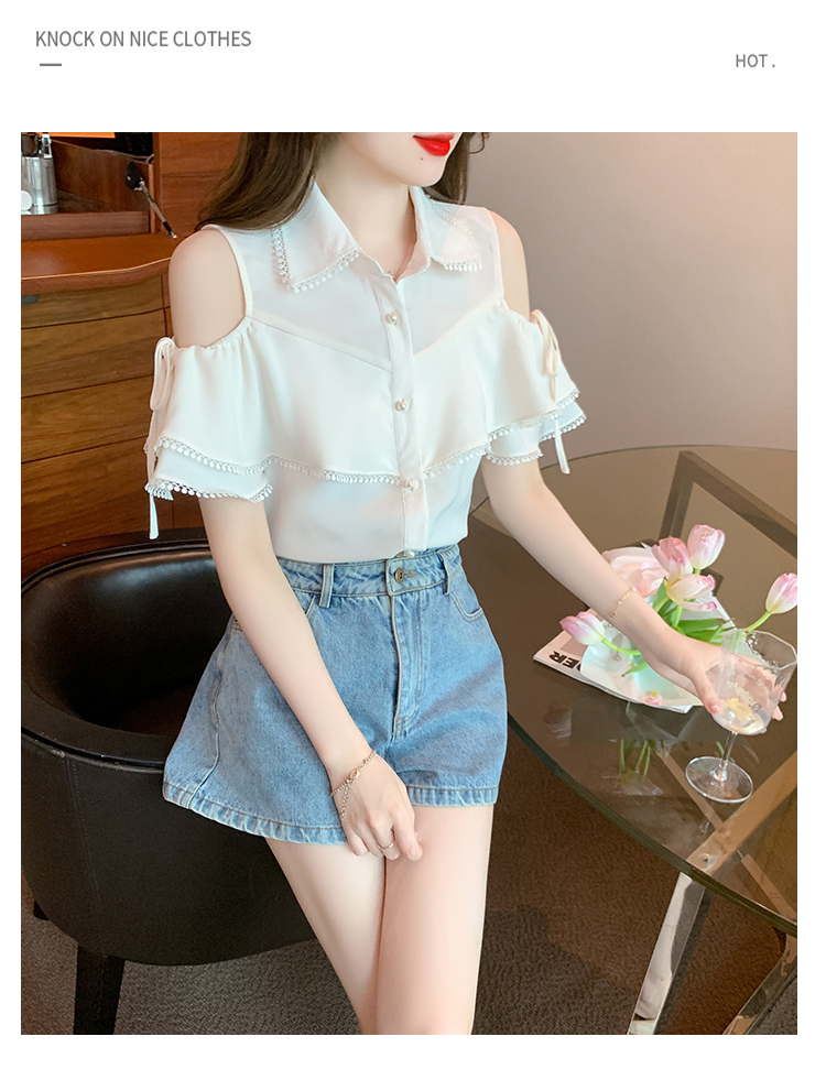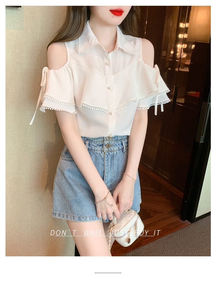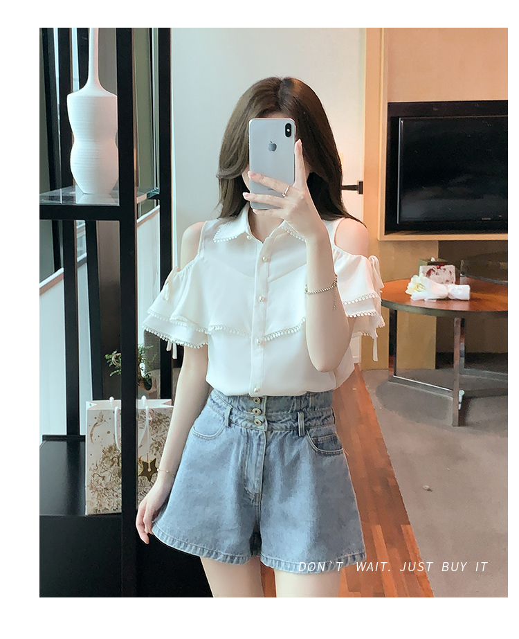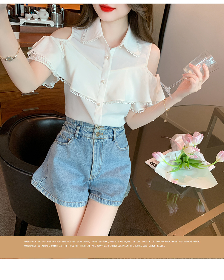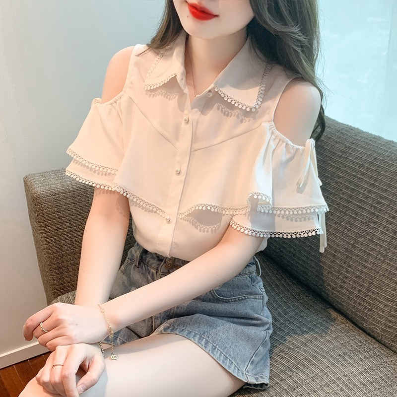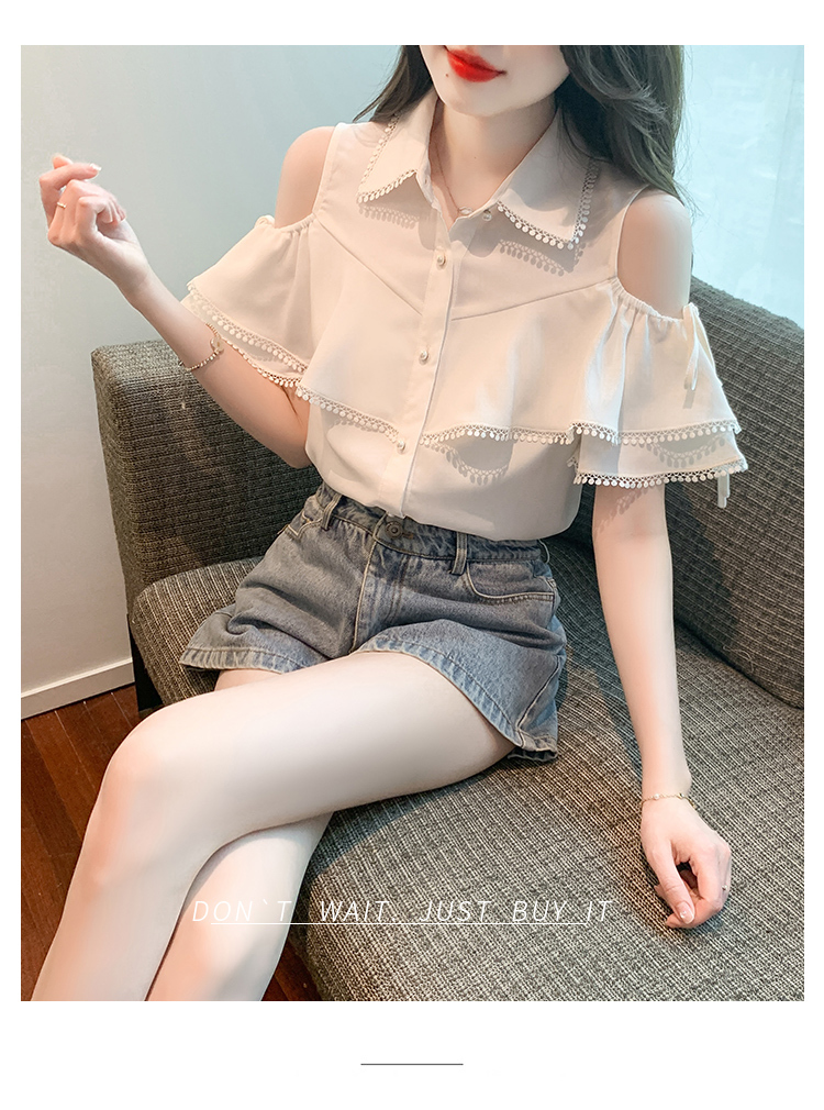 限量特惠|氣質花邊翻領露肩荷葉邊雪紡衫(05H3628)
