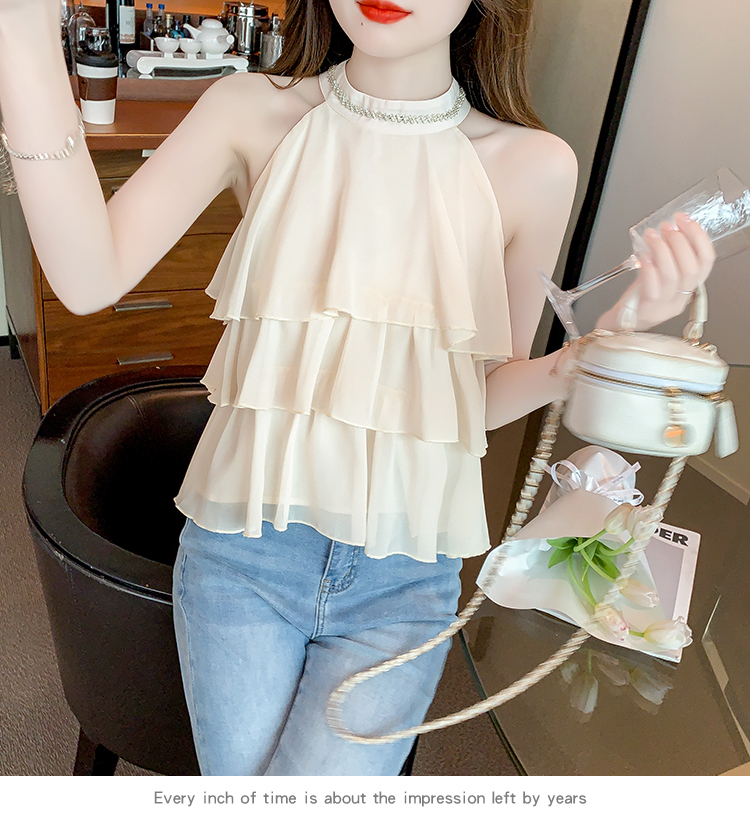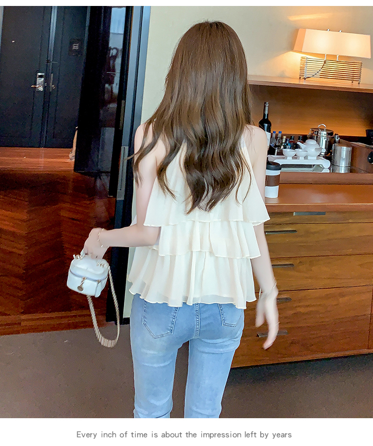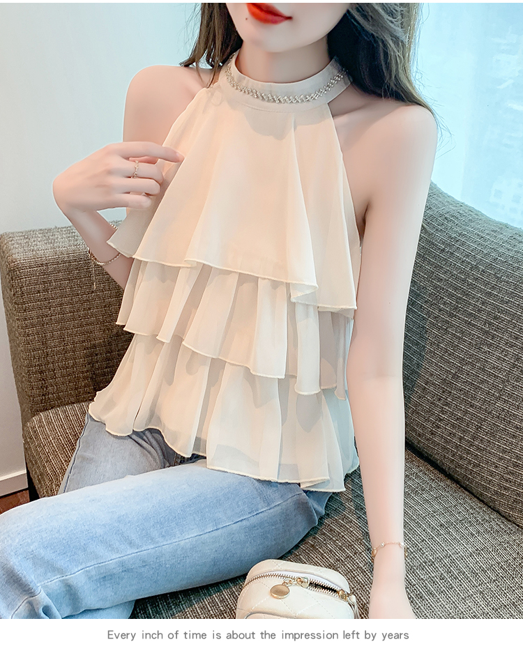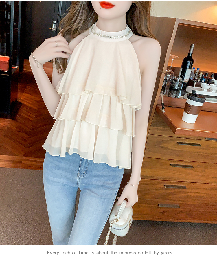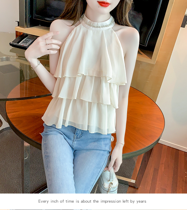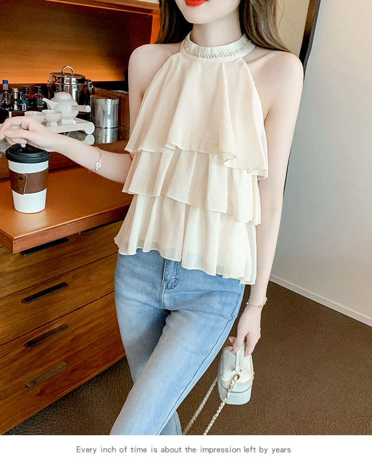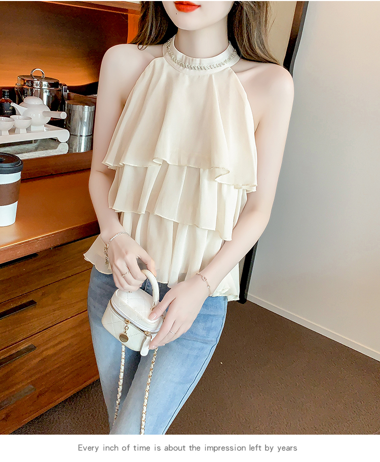 限量特惠|氣質荷葉邊掛脖露肩雪紡衫(05H3660)