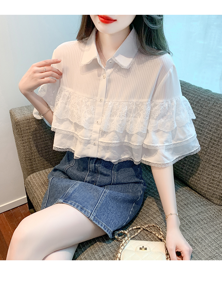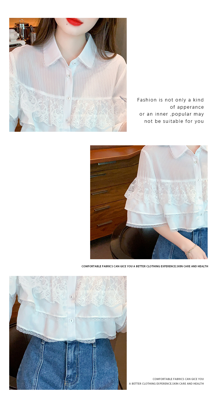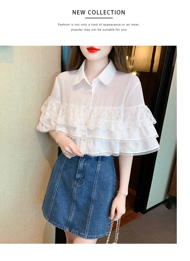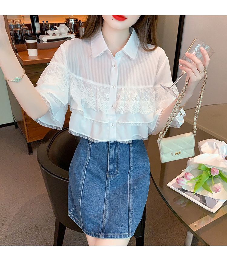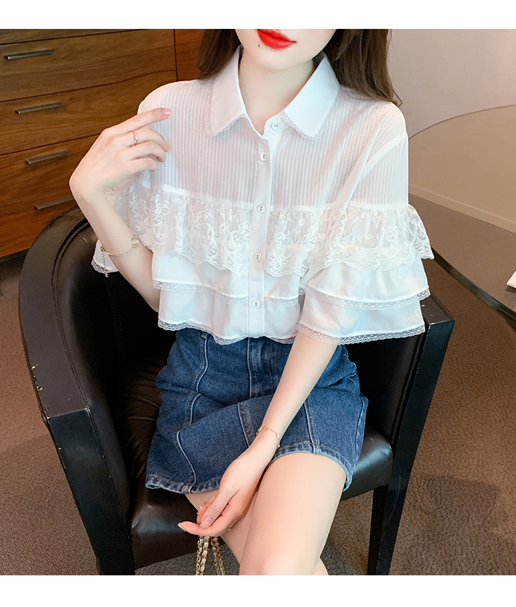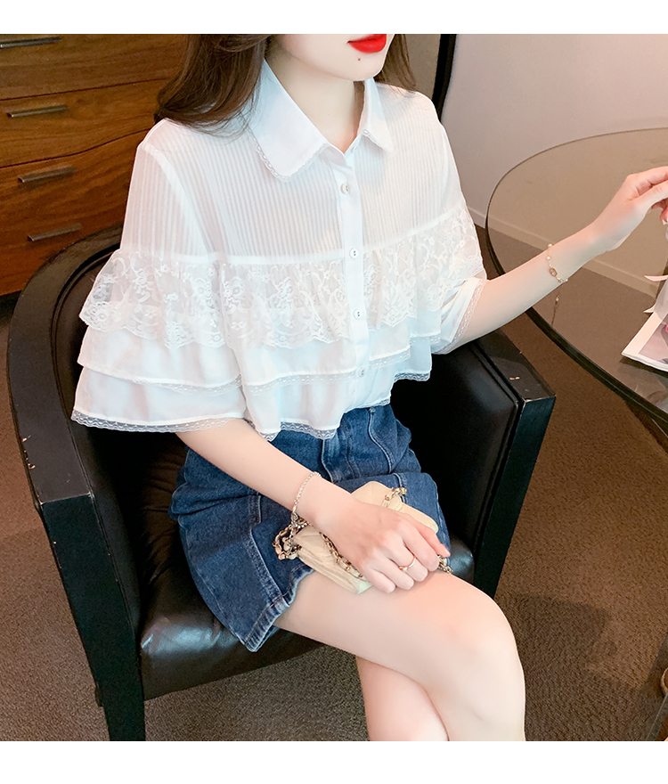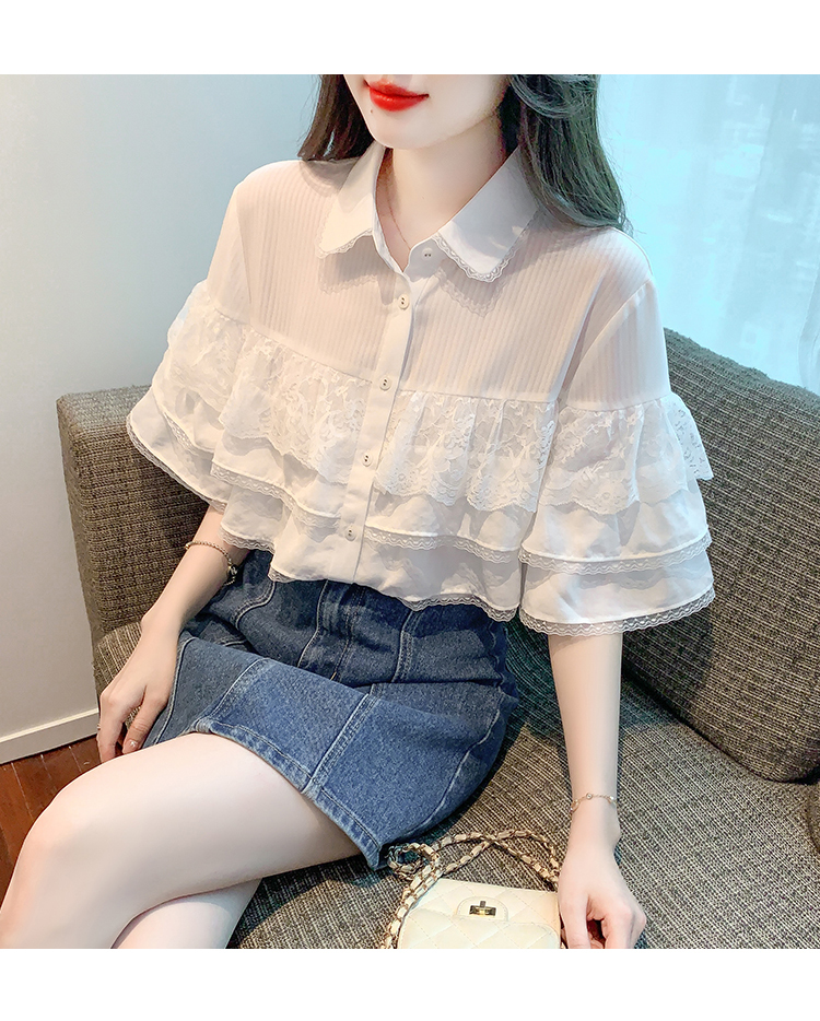 限量特惠|氣質知翻領蕾絲拼接荷葉袖雪紡衫(05H3704)