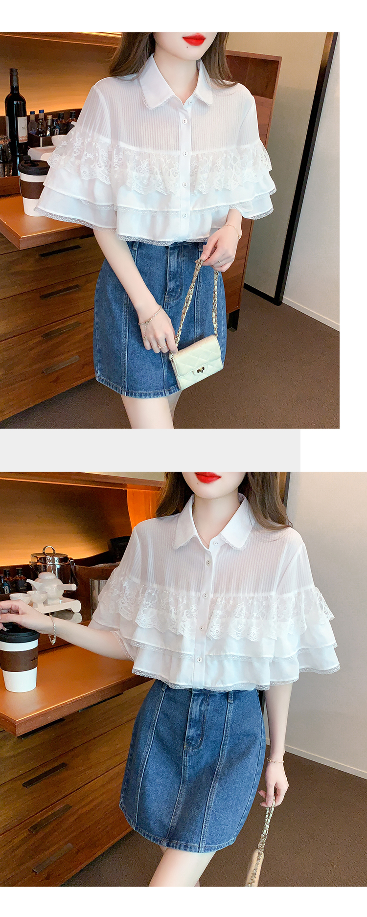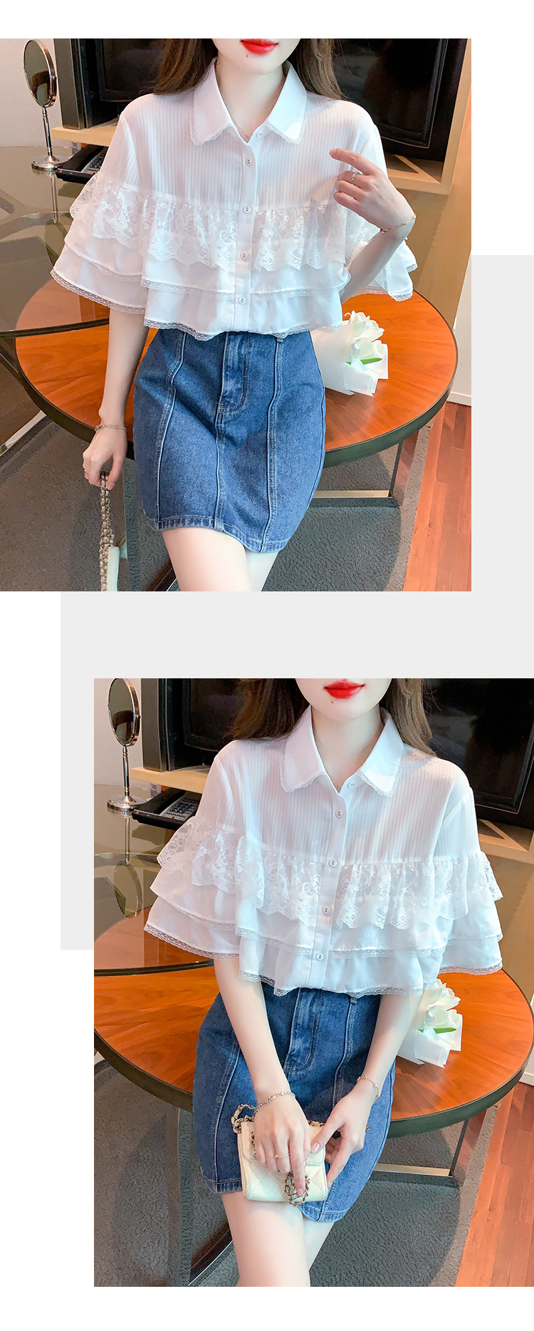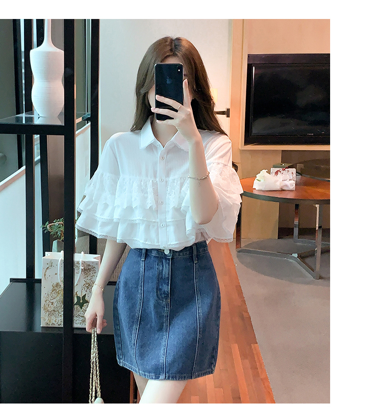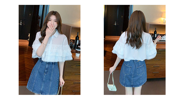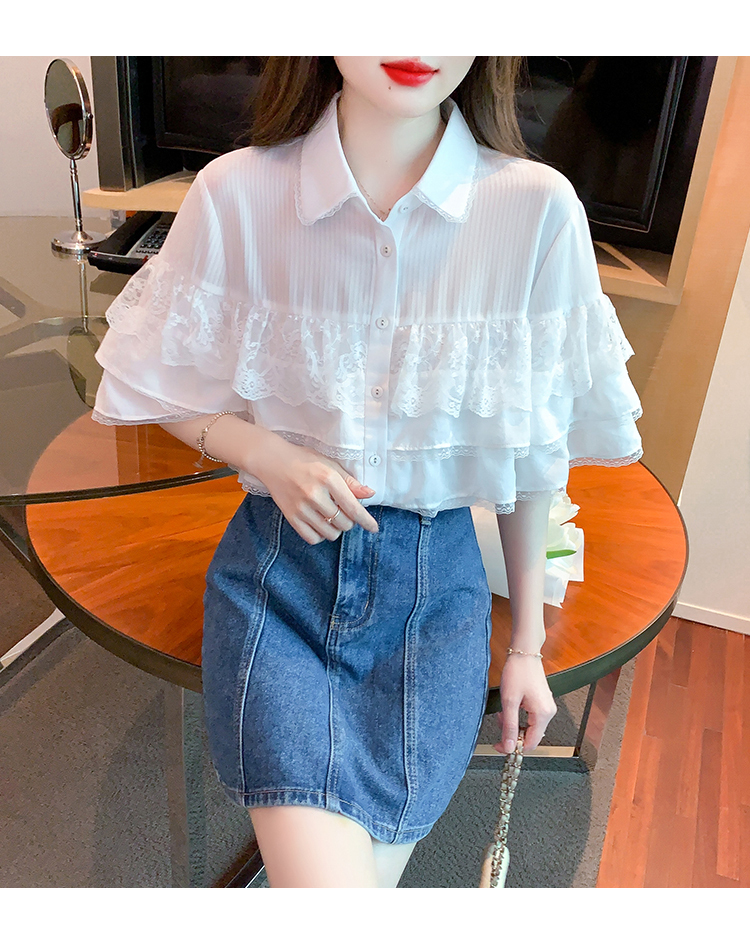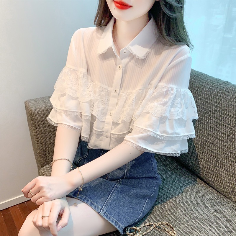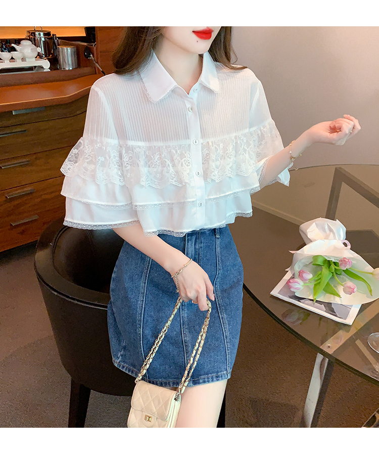 限量特惠|氣質知翻領蕾絲拼接荷葉袖雪紡衫(05H3704)