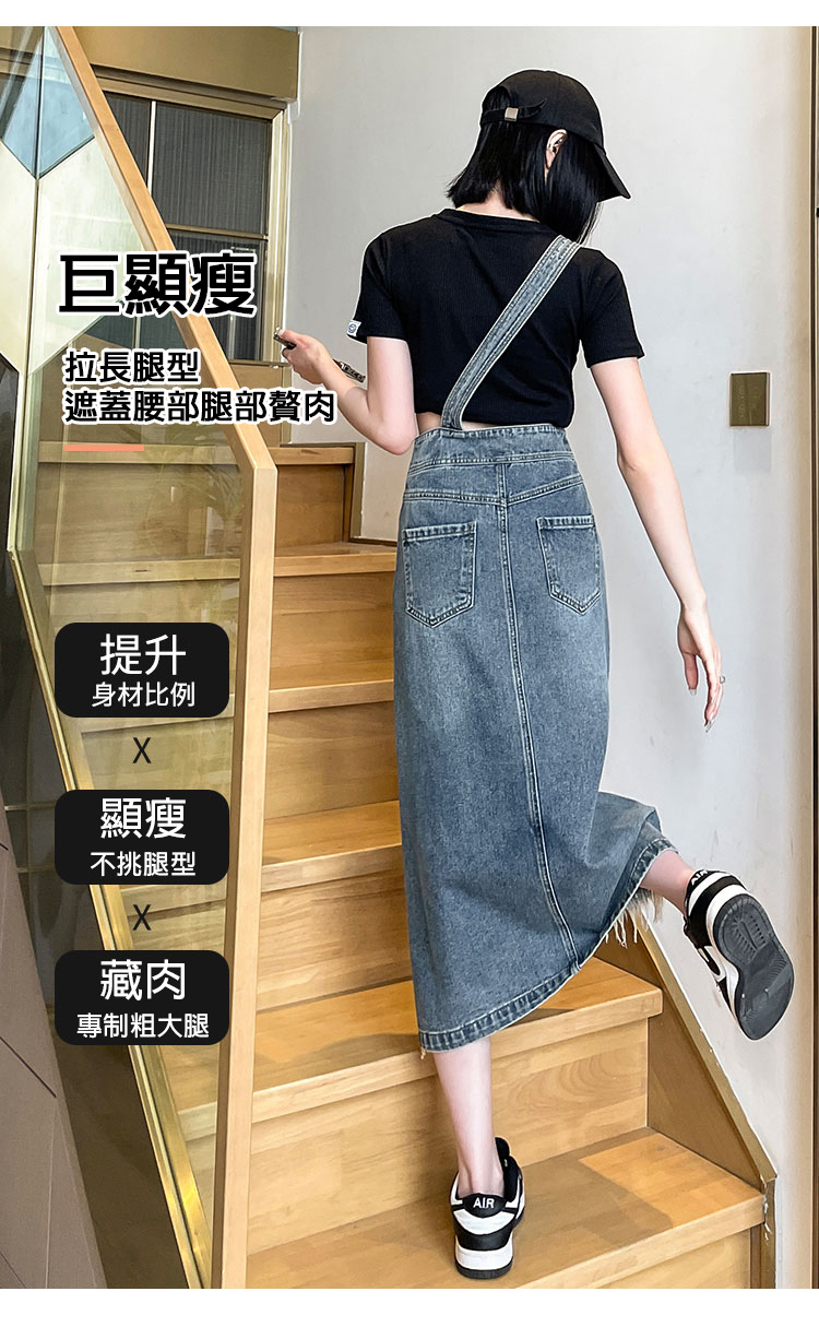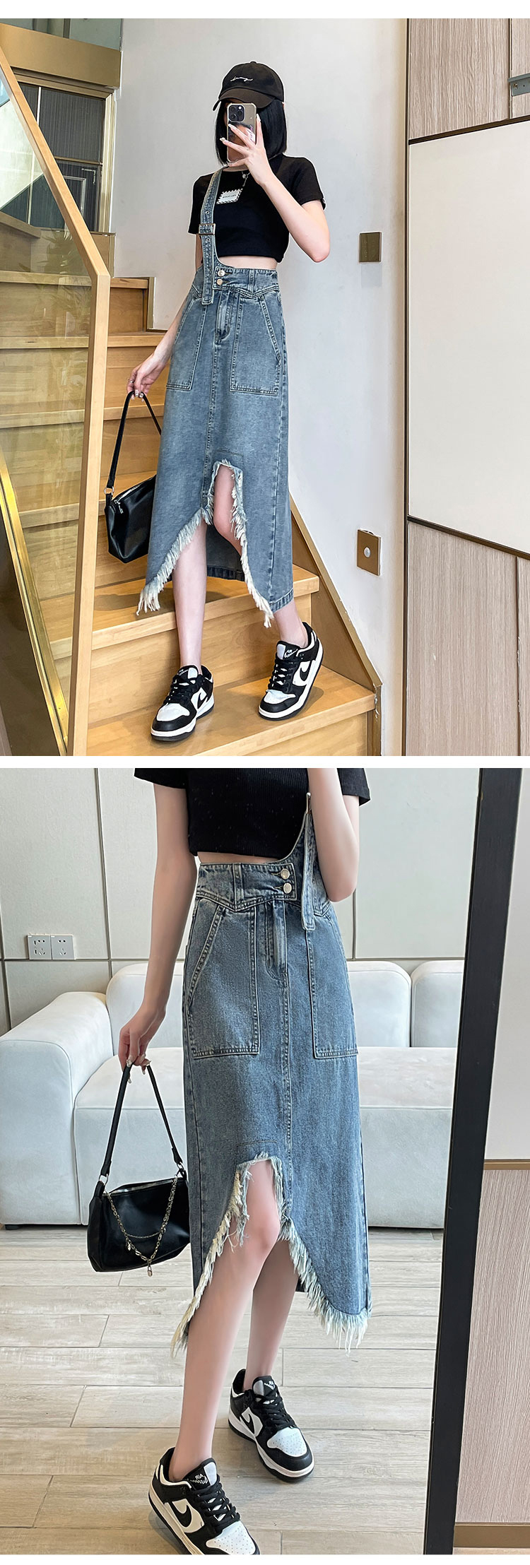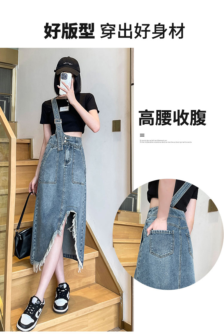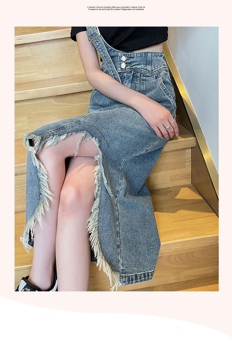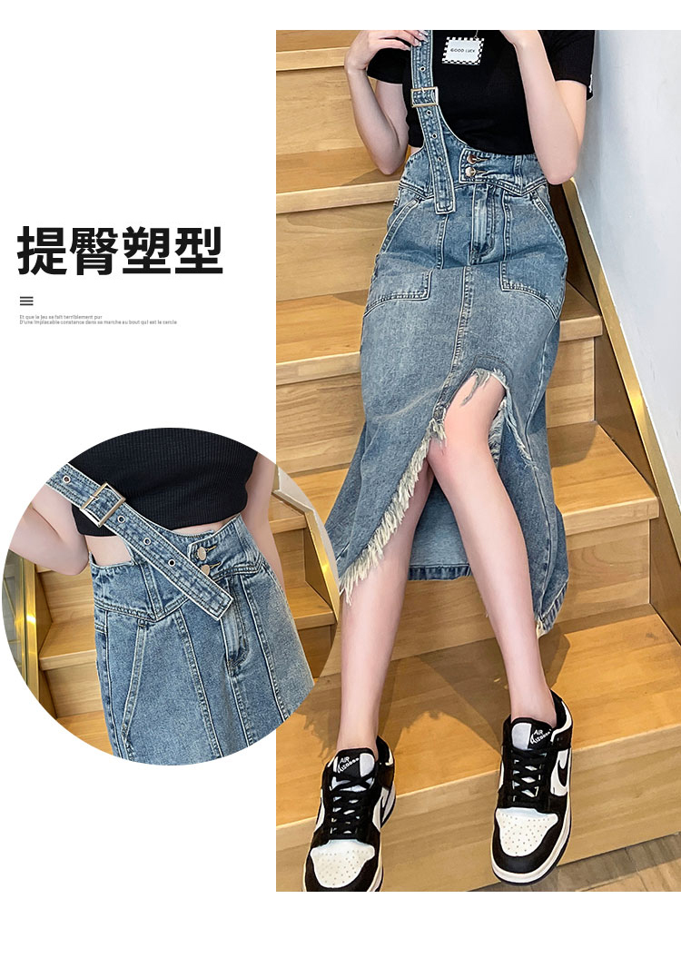 限量特惠|個性舒適裙襬開叉刷毛邊單肩帶牛仔裙(05H3758)