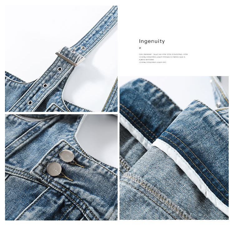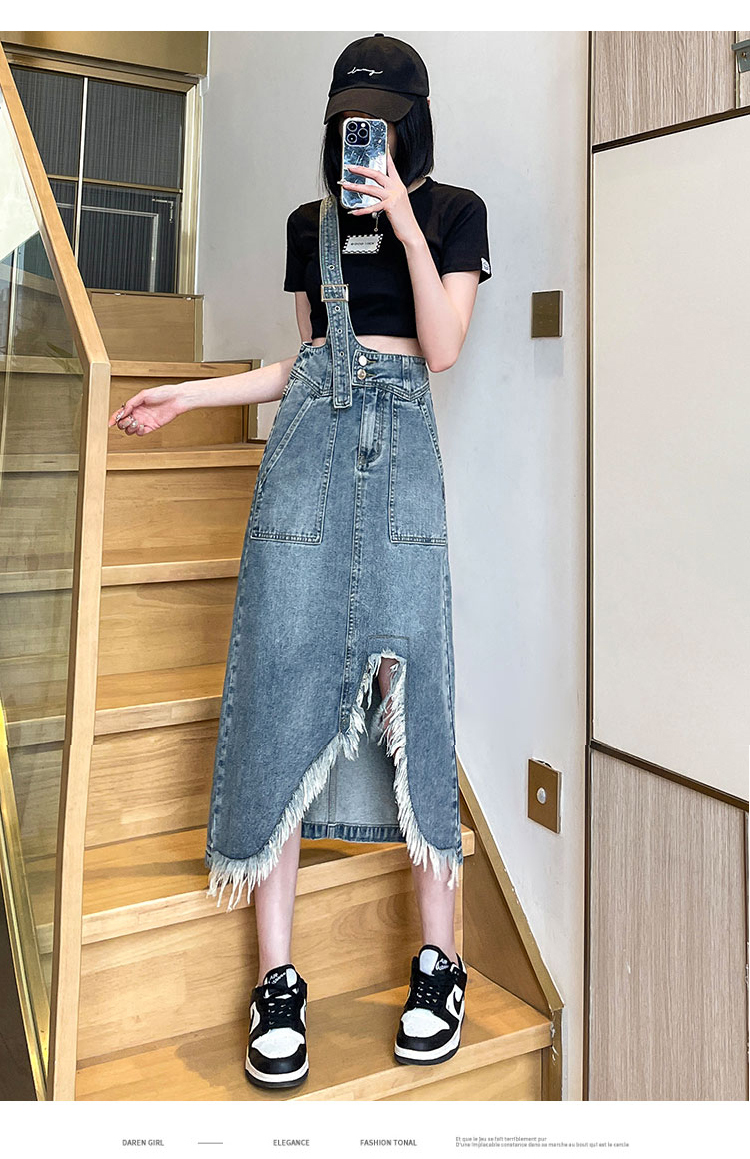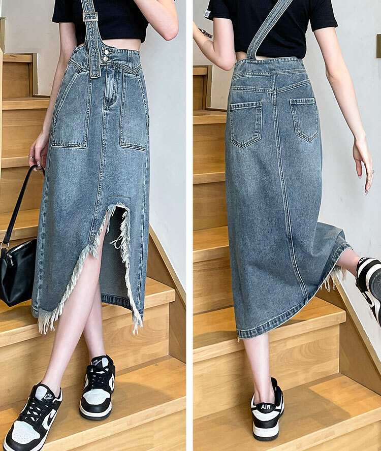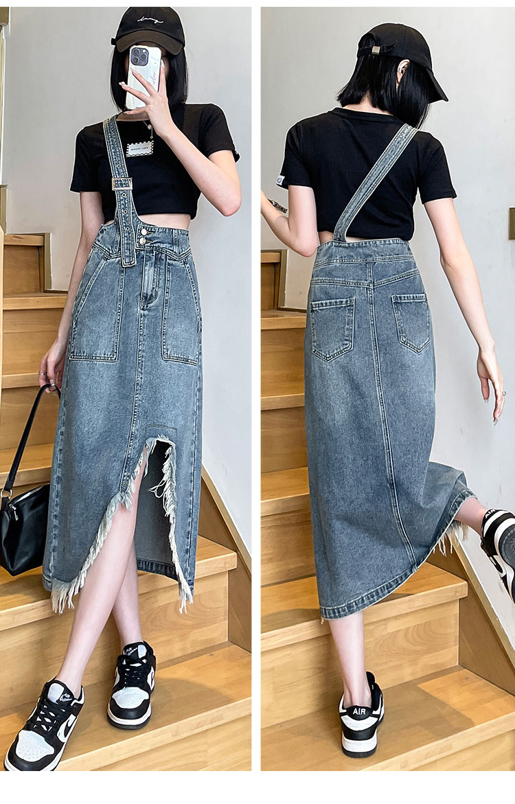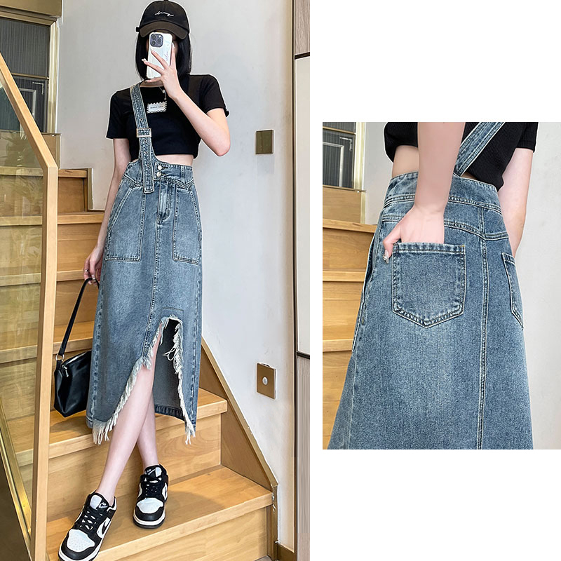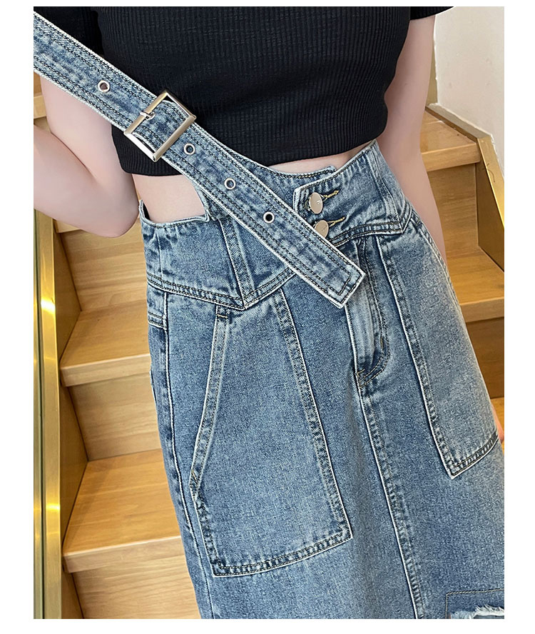限量特惠|個性舒適裙襬開叉刷毛邊單肩帶牛仔裙(05H3758)
