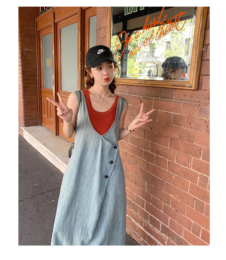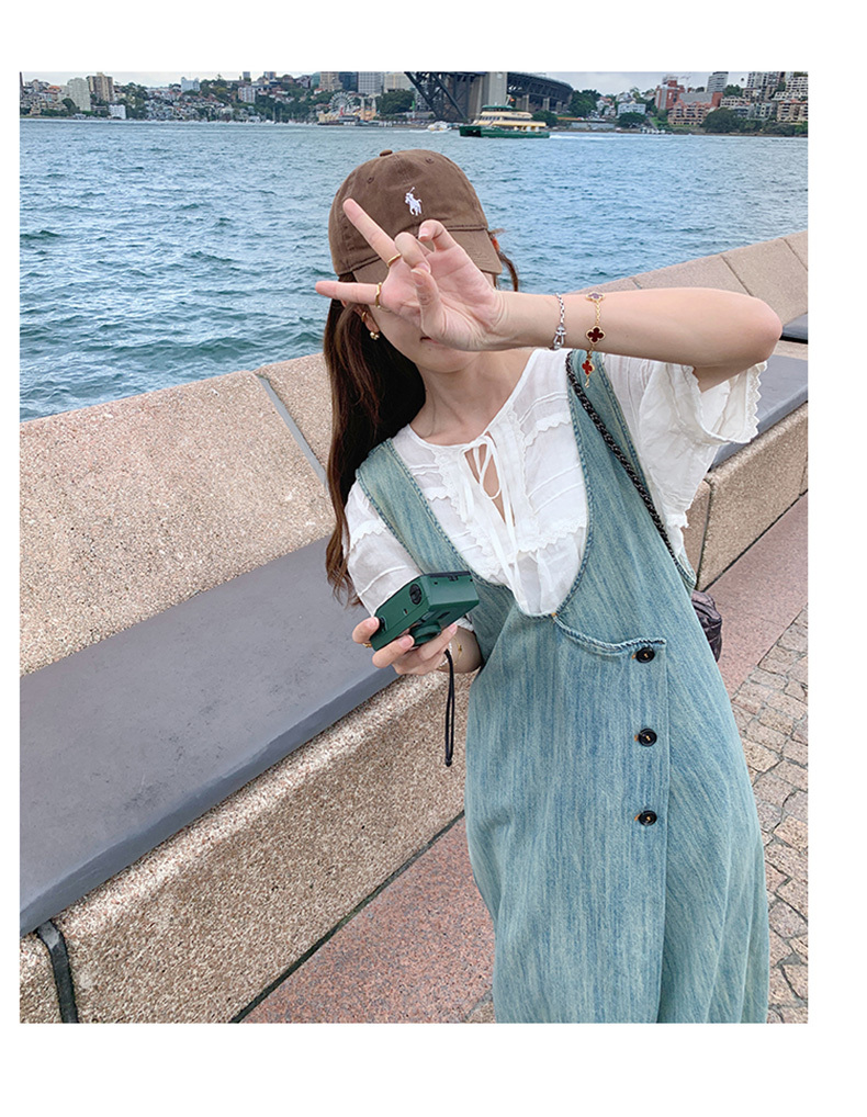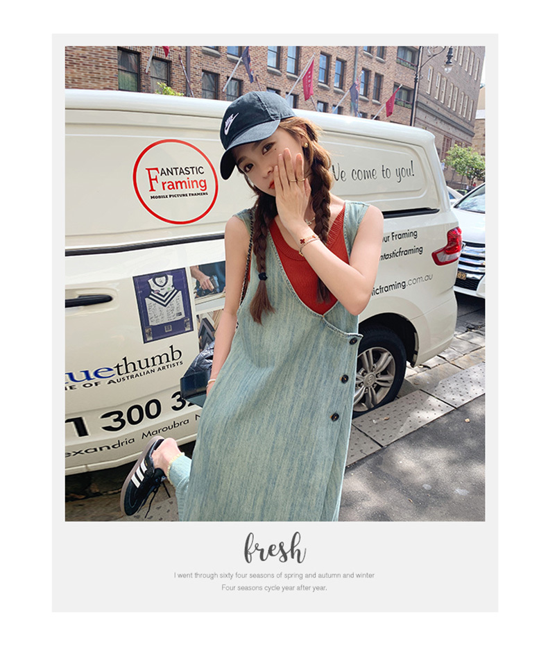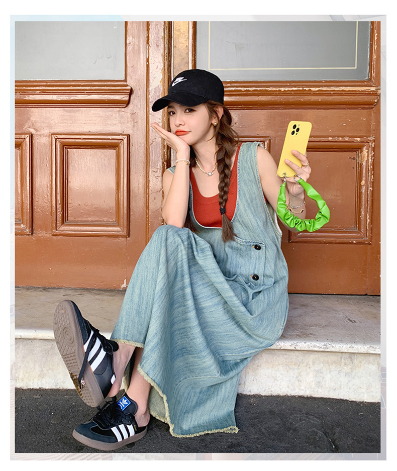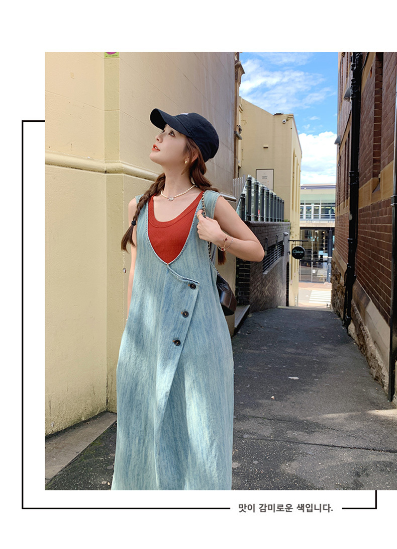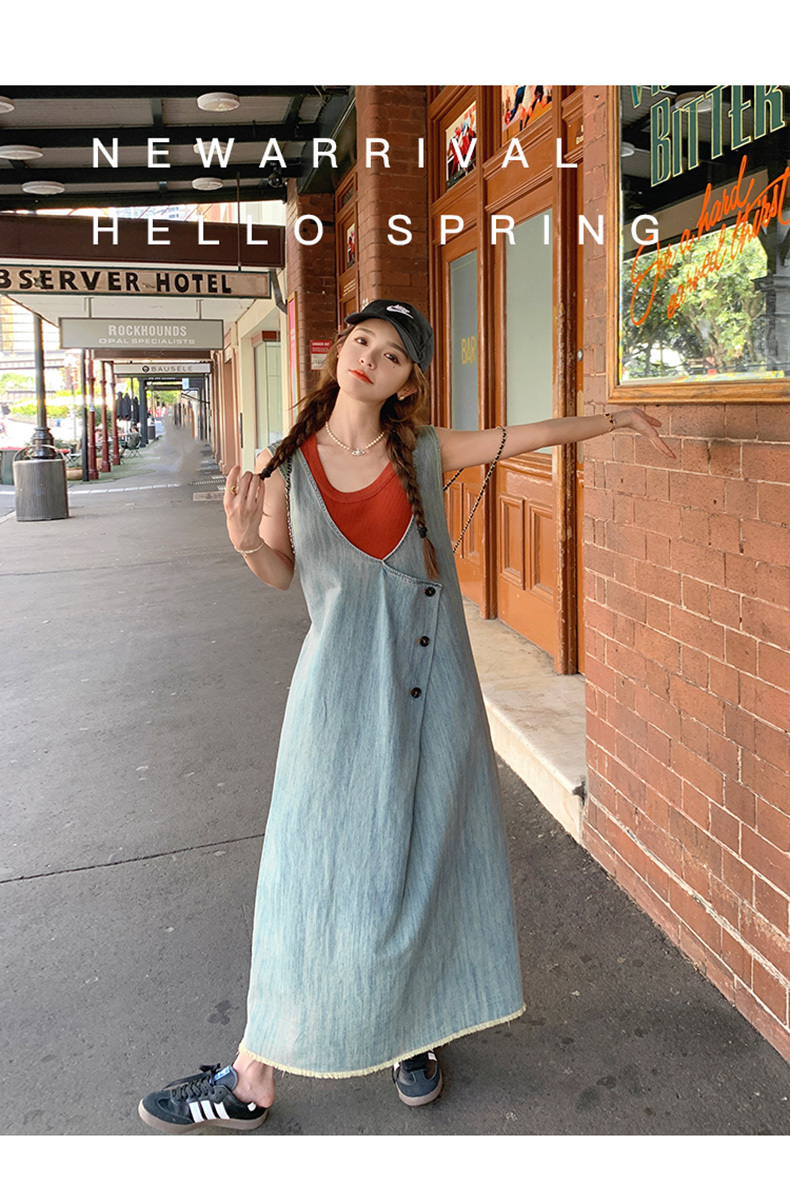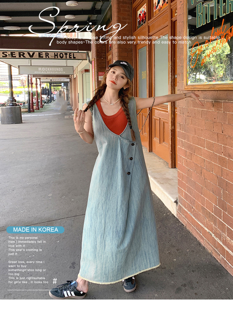獨家訂製│韓系甜酷風斜釦繫帶刷色牛仔吊帶裙(05H3822)