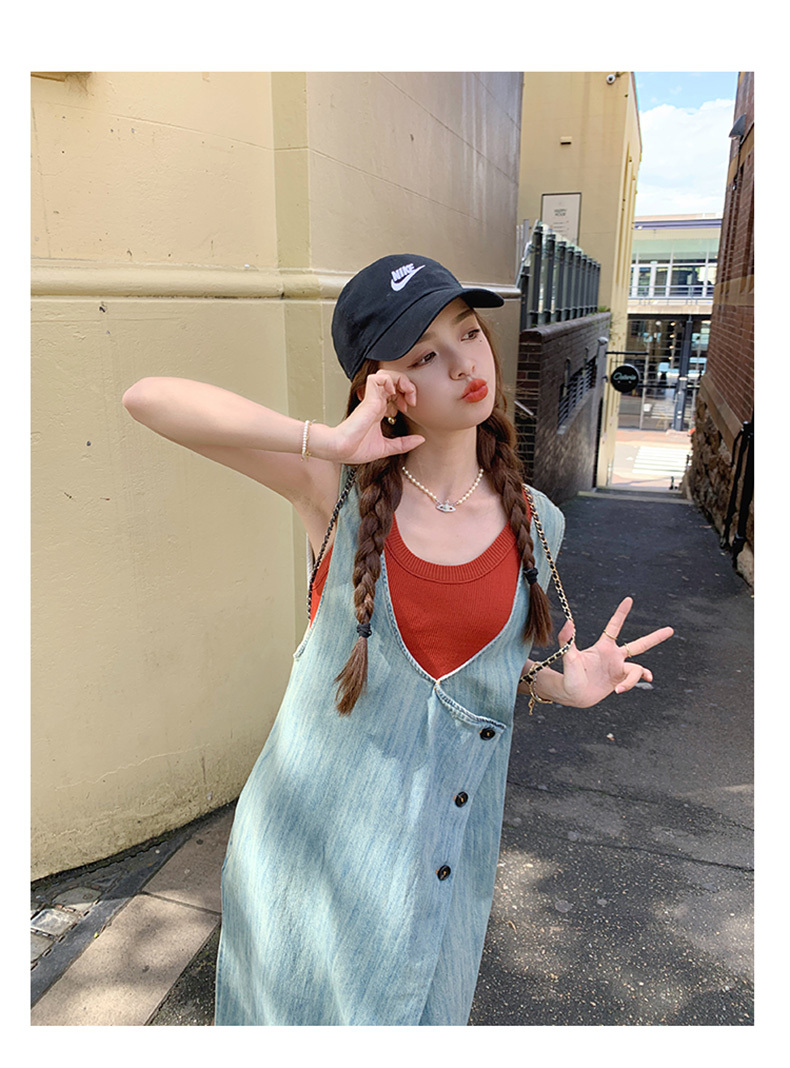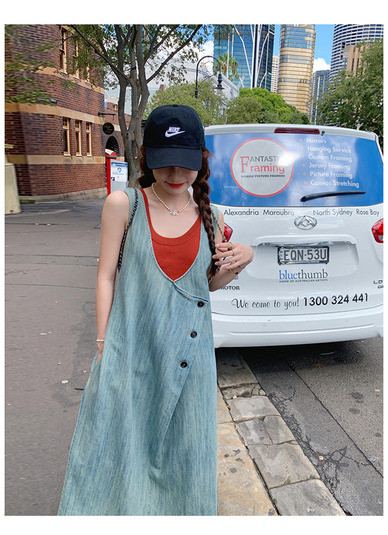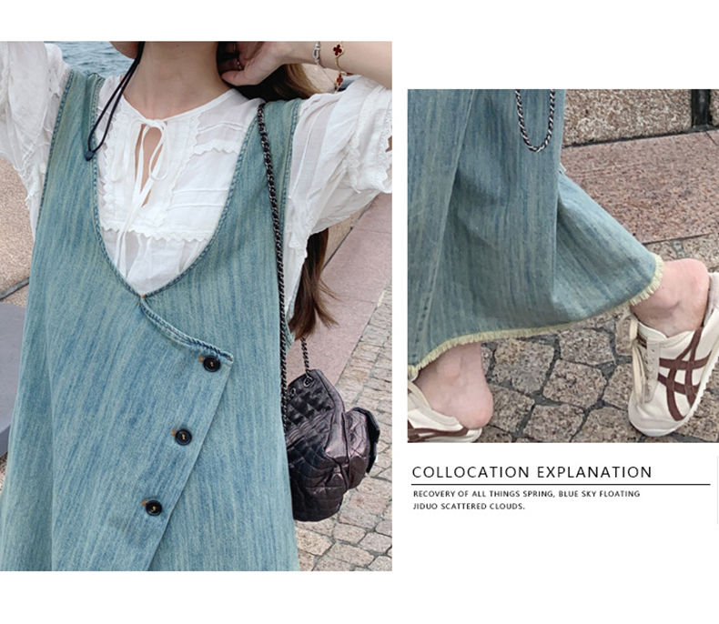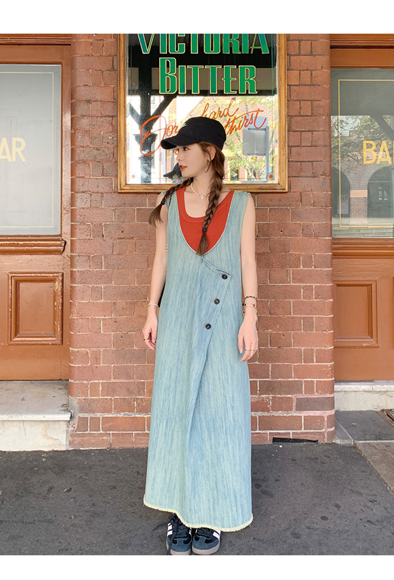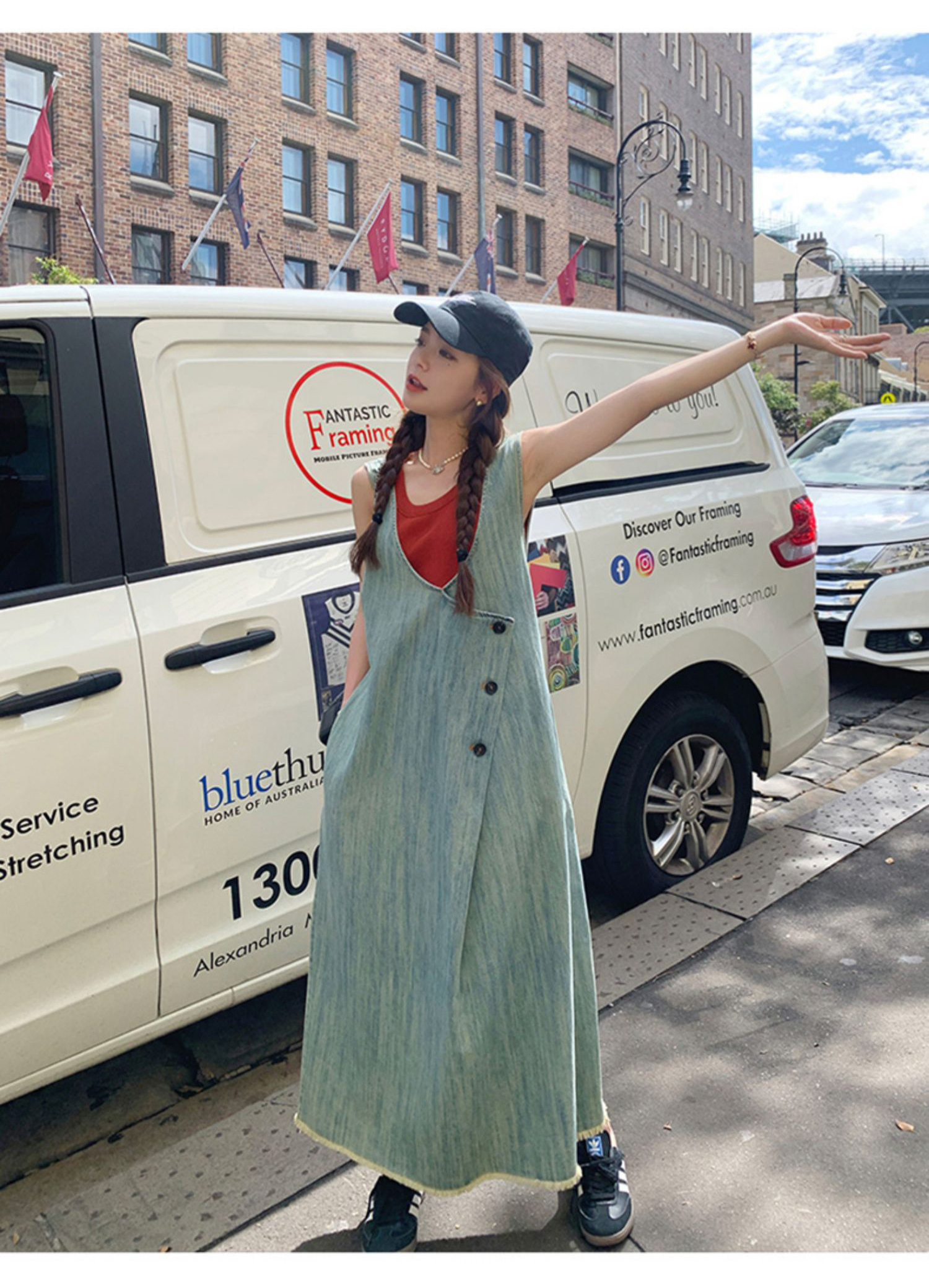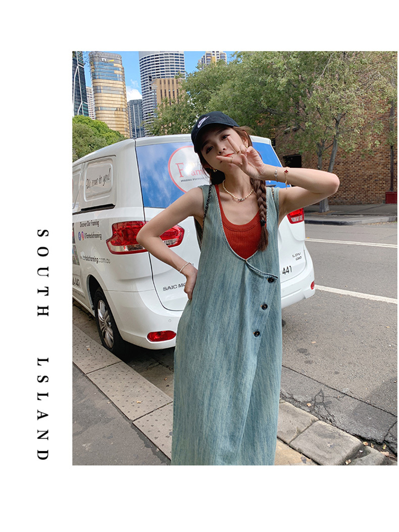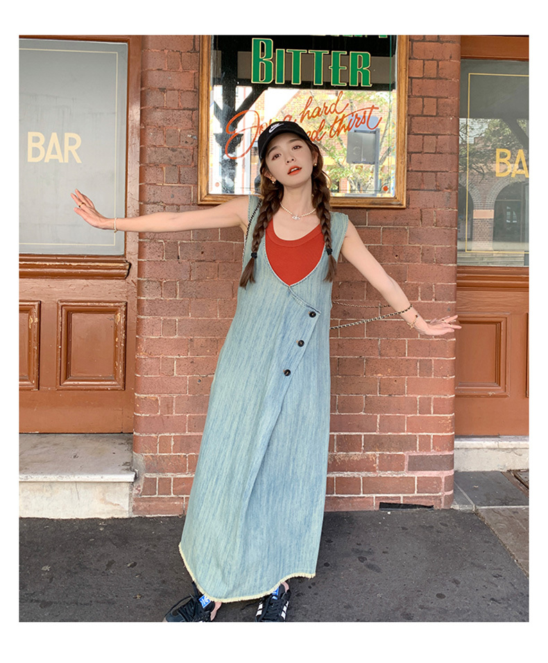 獨家訂製│韓系甜酷風斜釦繫帶刷色牛仔吊帶裙(05H3822)