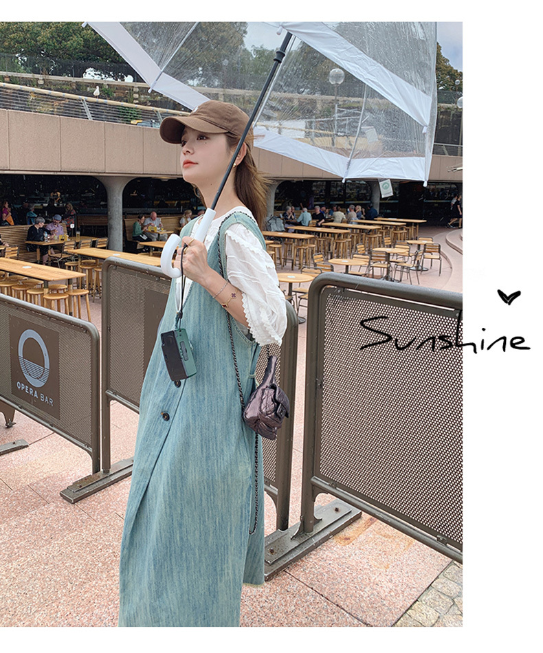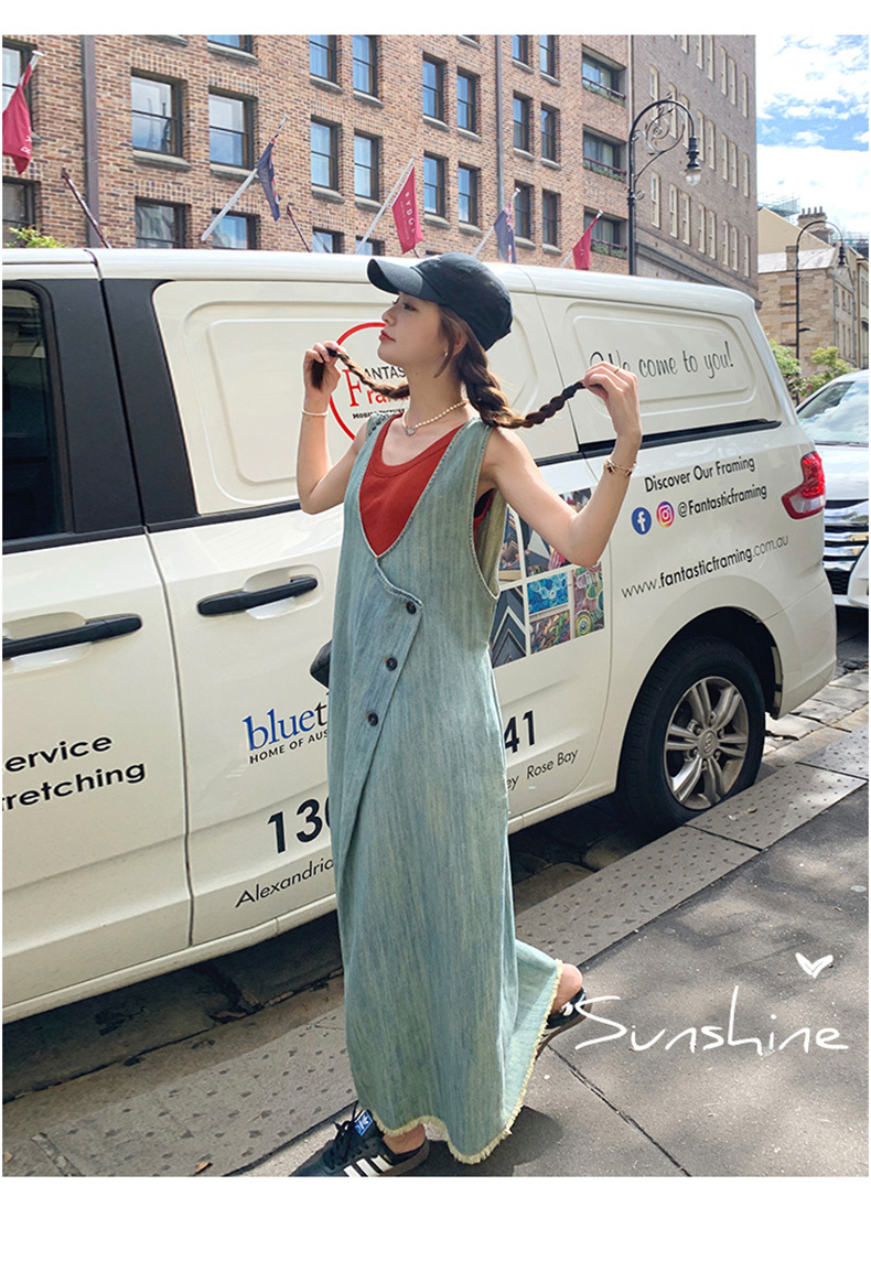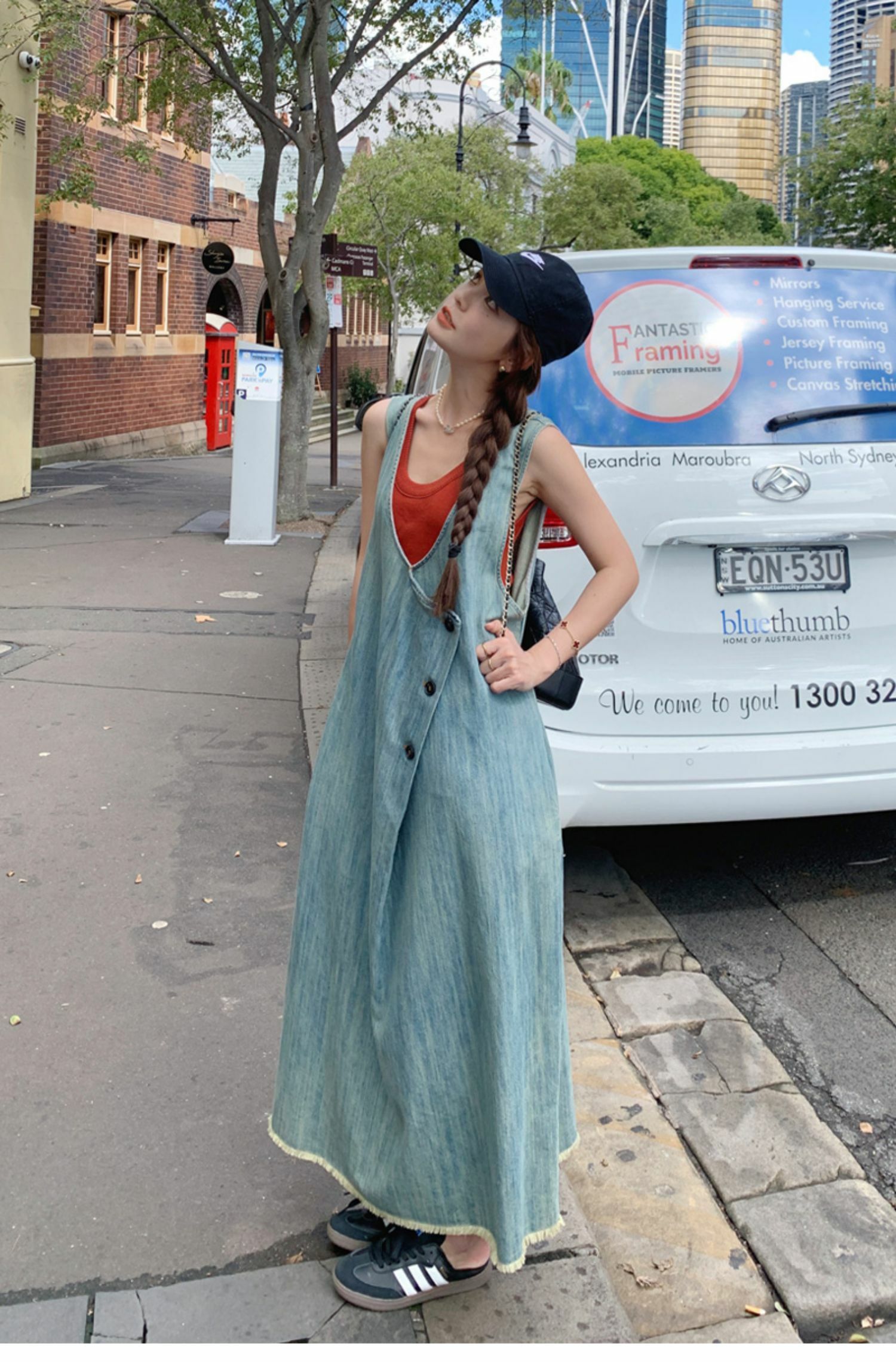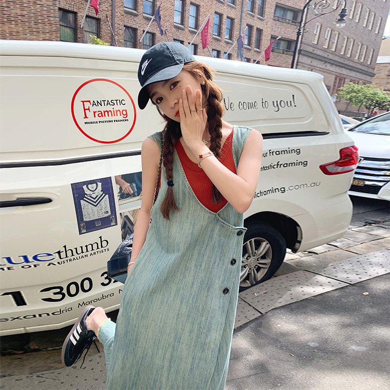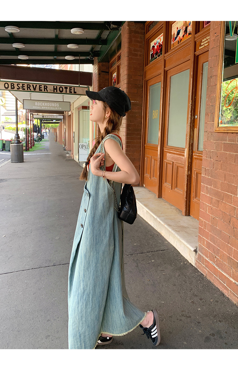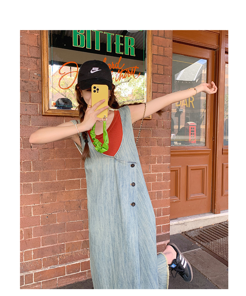 獨家訂製│韓系甜酷風斜釦繫帶刷色牛仔吊帶裙(05H3822)