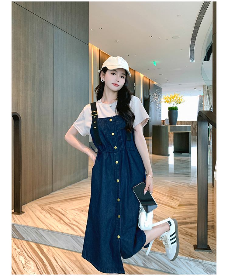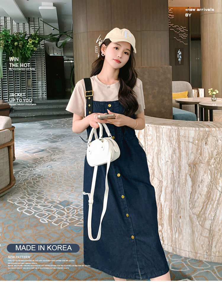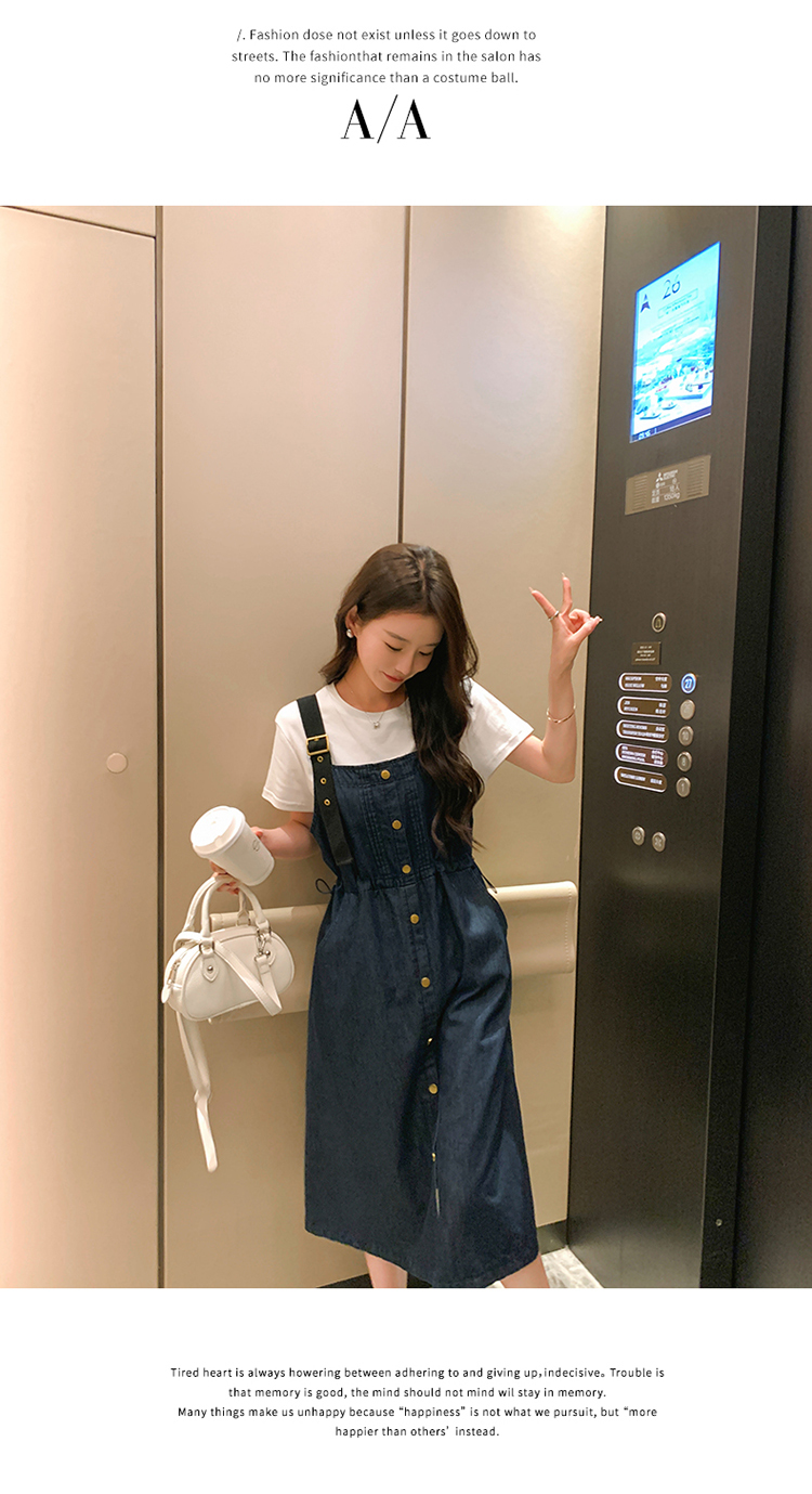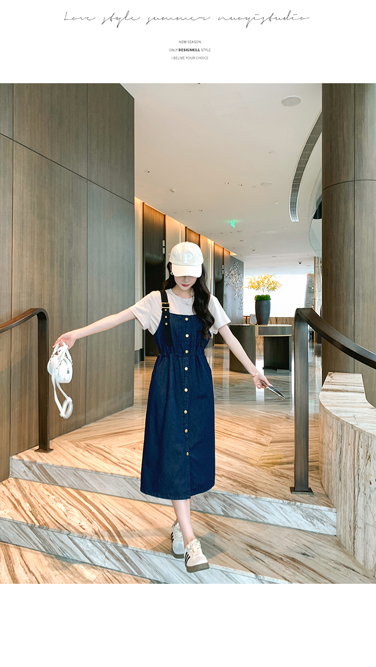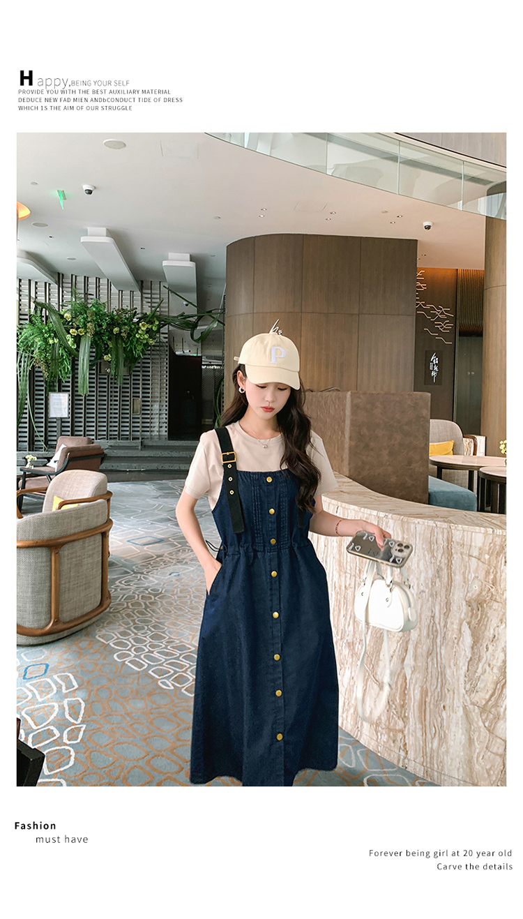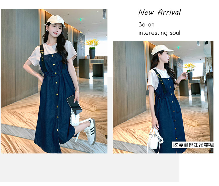 獨家訂製│韓系減齡感抽繩收腰單排釦牛仔吊帶裙(05H3858)