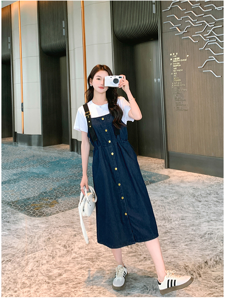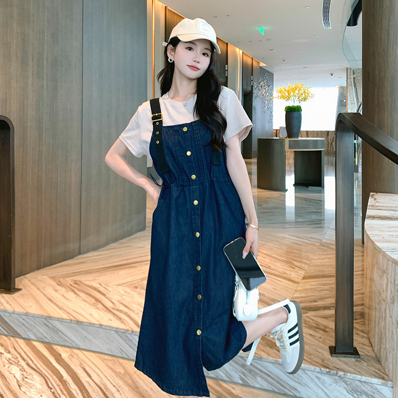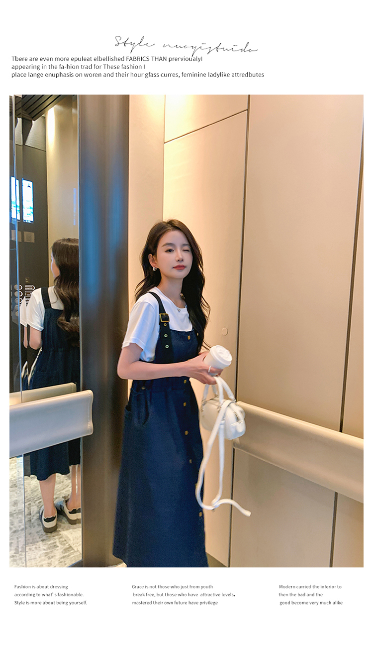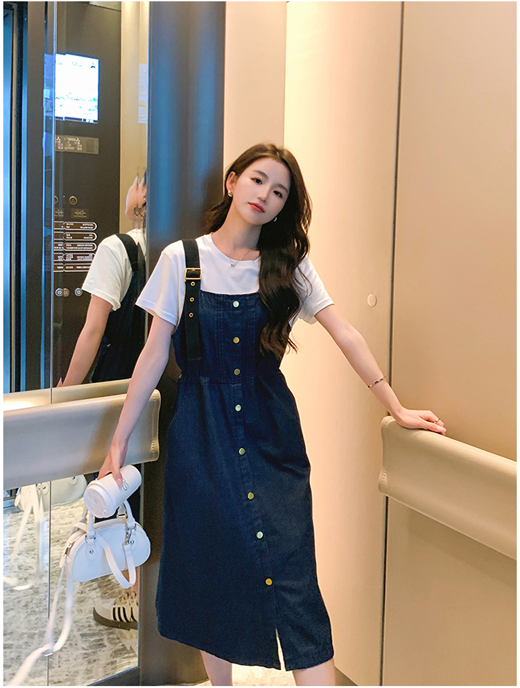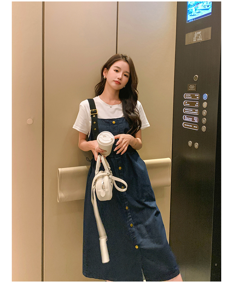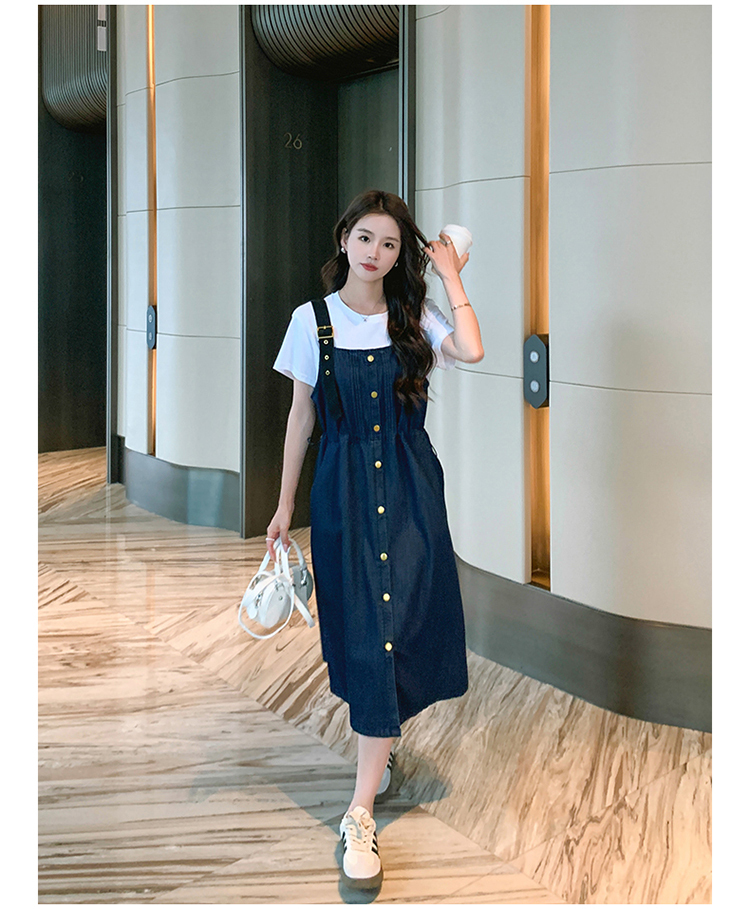 獨家訂製│韓系減齡感抽繩收腰單排釦牛仔吊帶裙(05H3858)