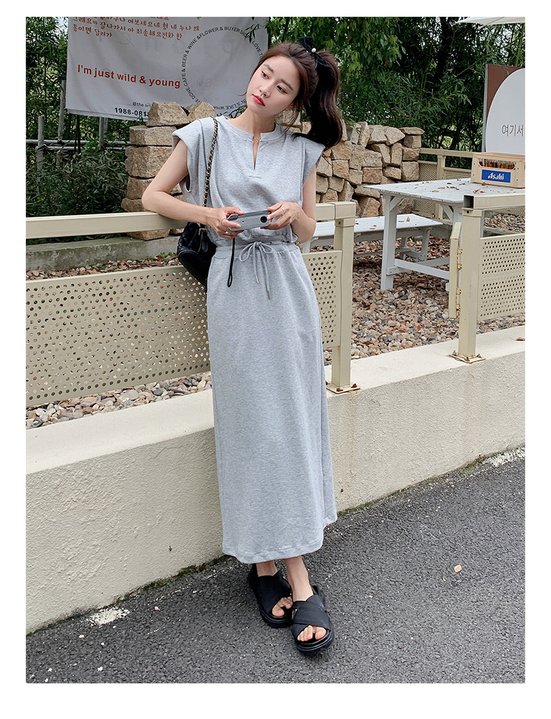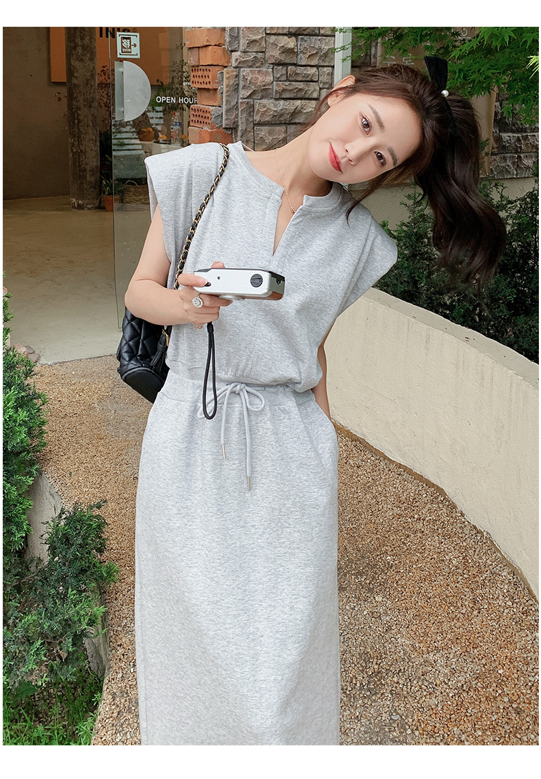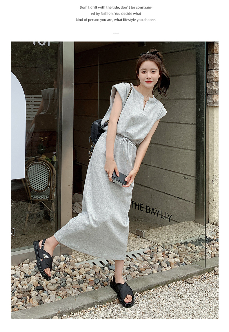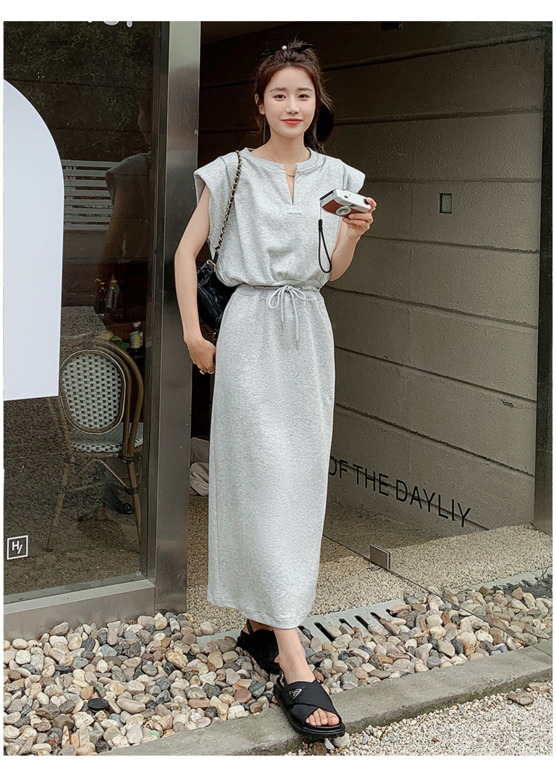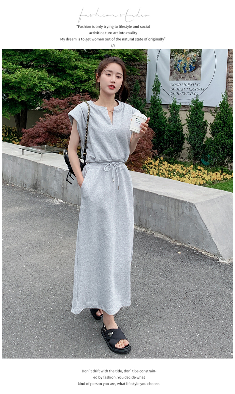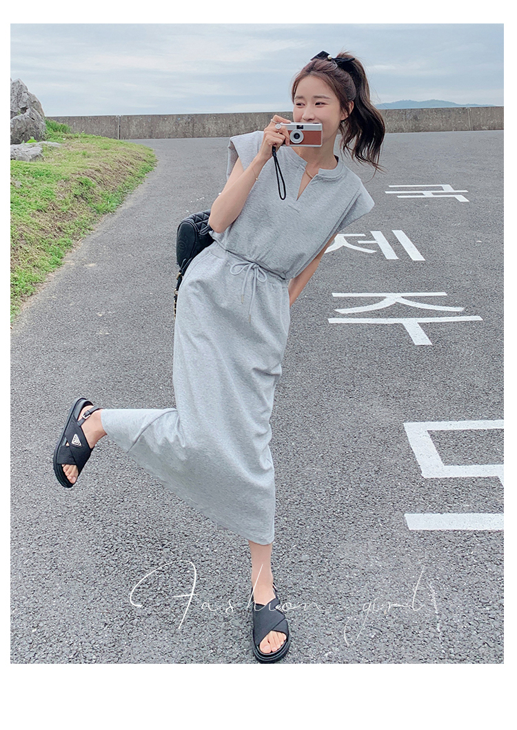 獨家訂製│韓系休閒感V領抽繩收腰開叉坎肩連身裙(05H3892)