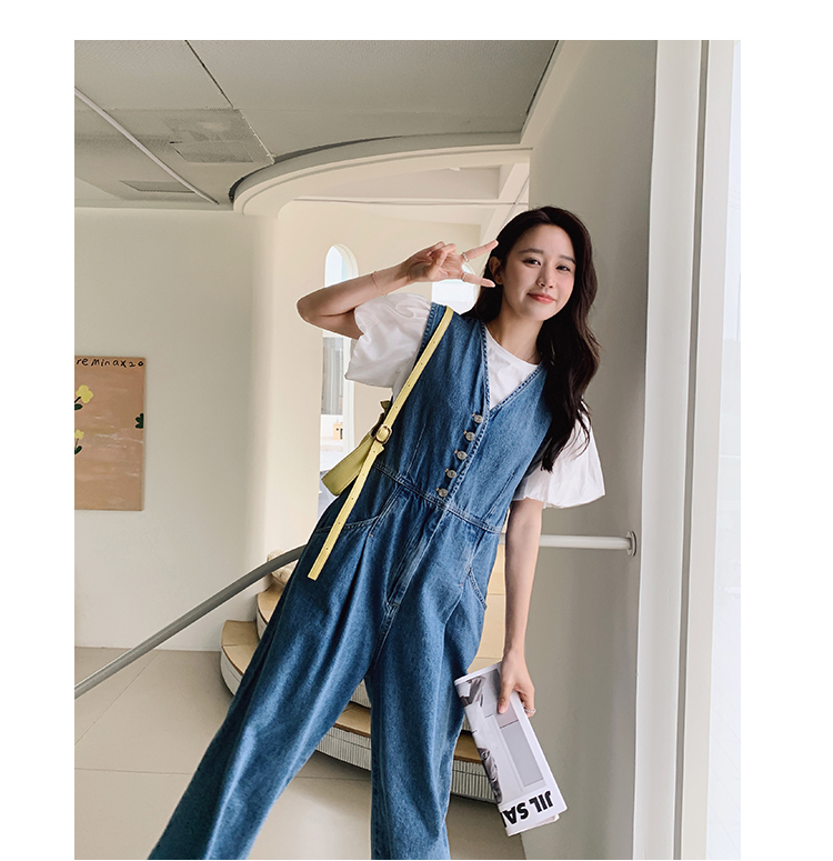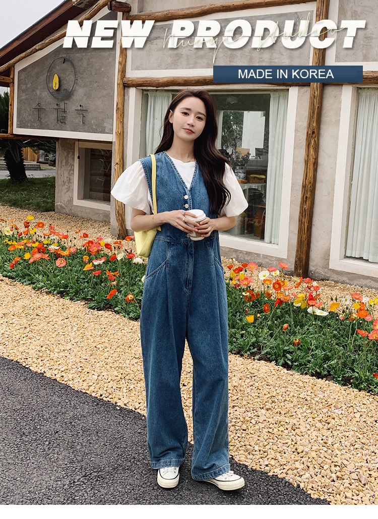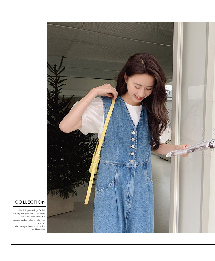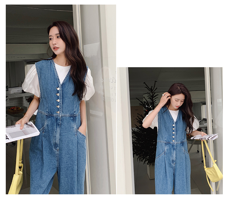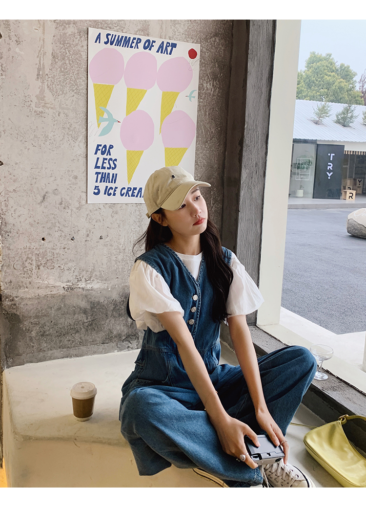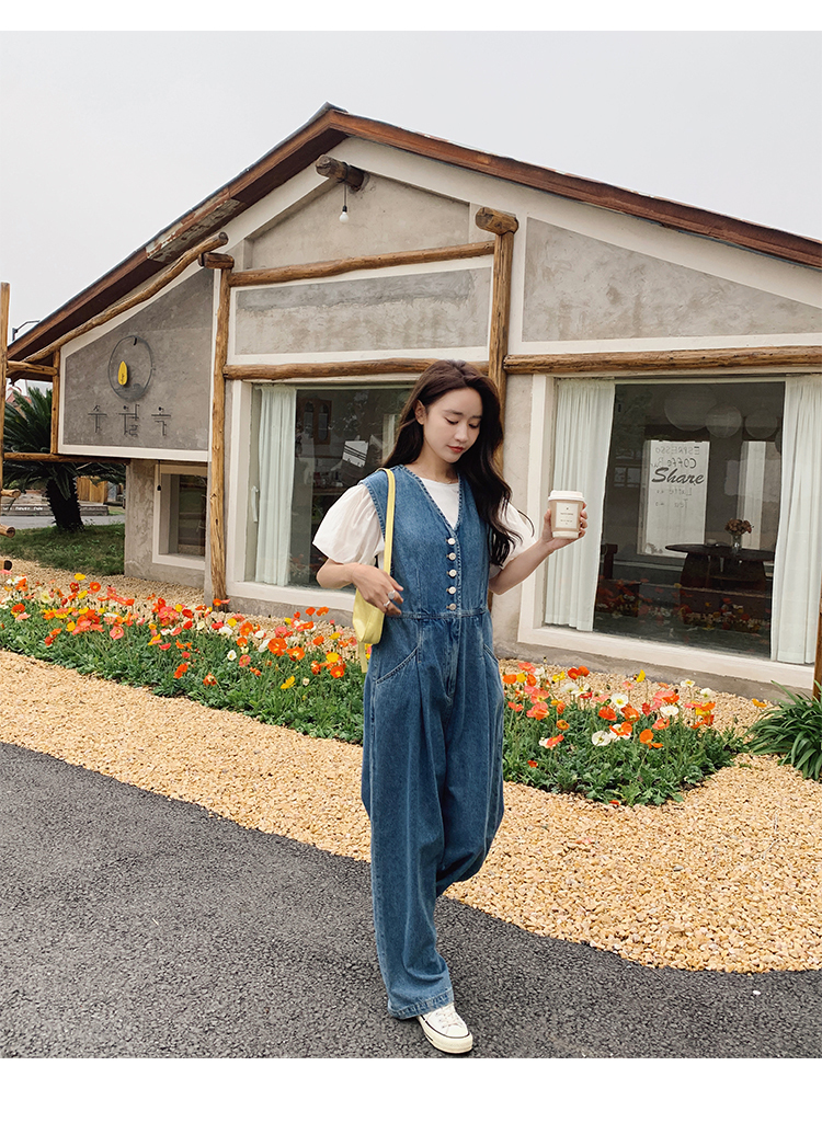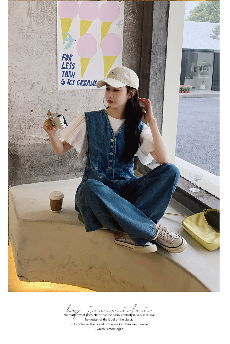 獨家訂製│韓系甜酷風單排釦牛仔吊帶褲(05H3911)