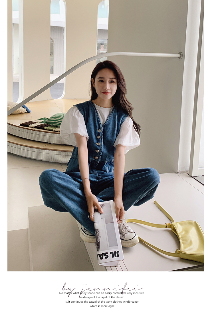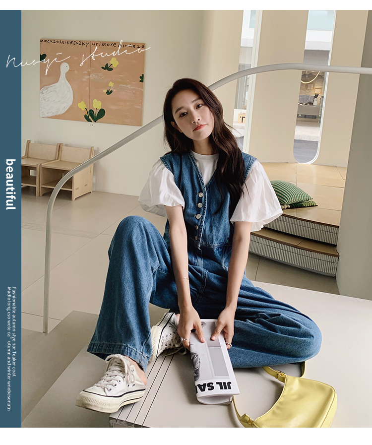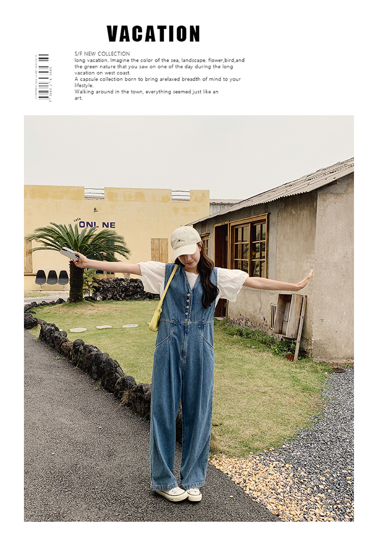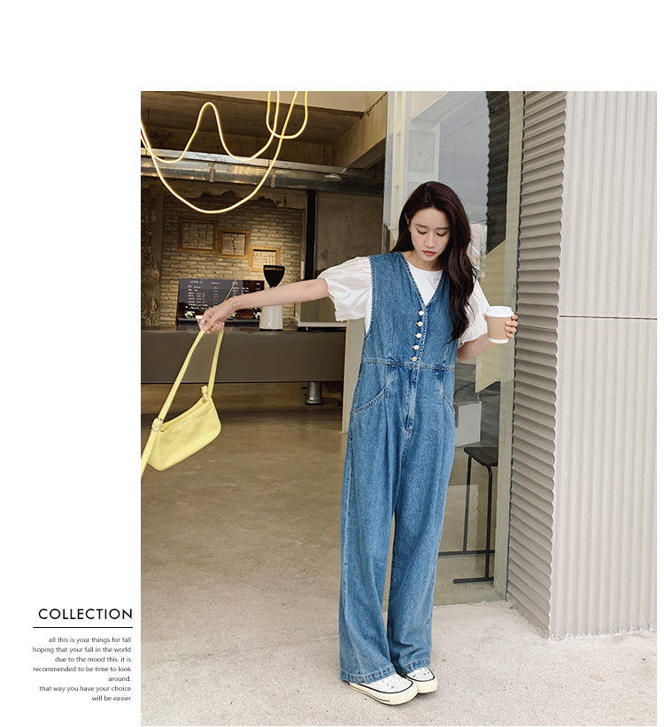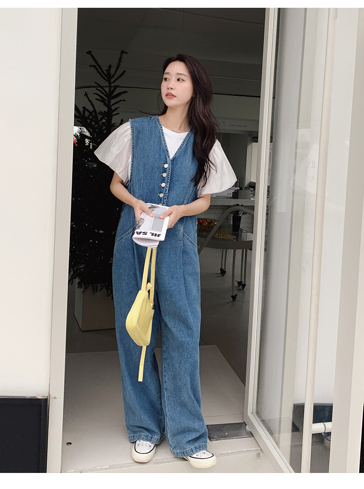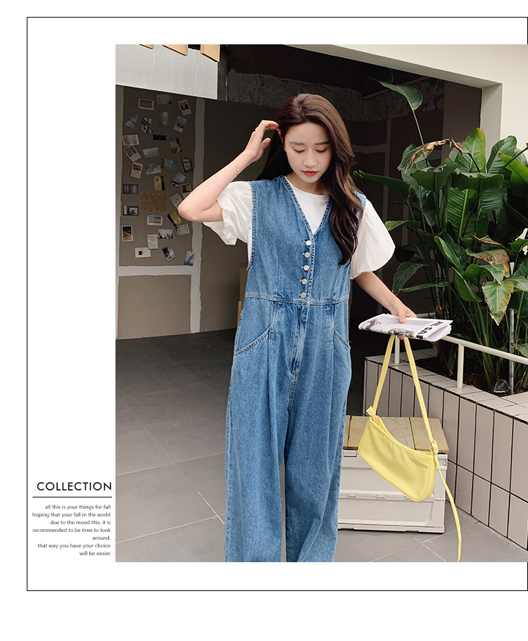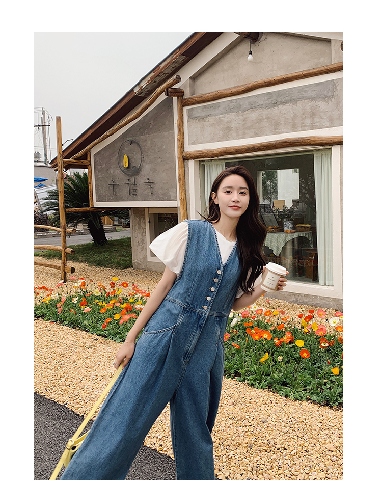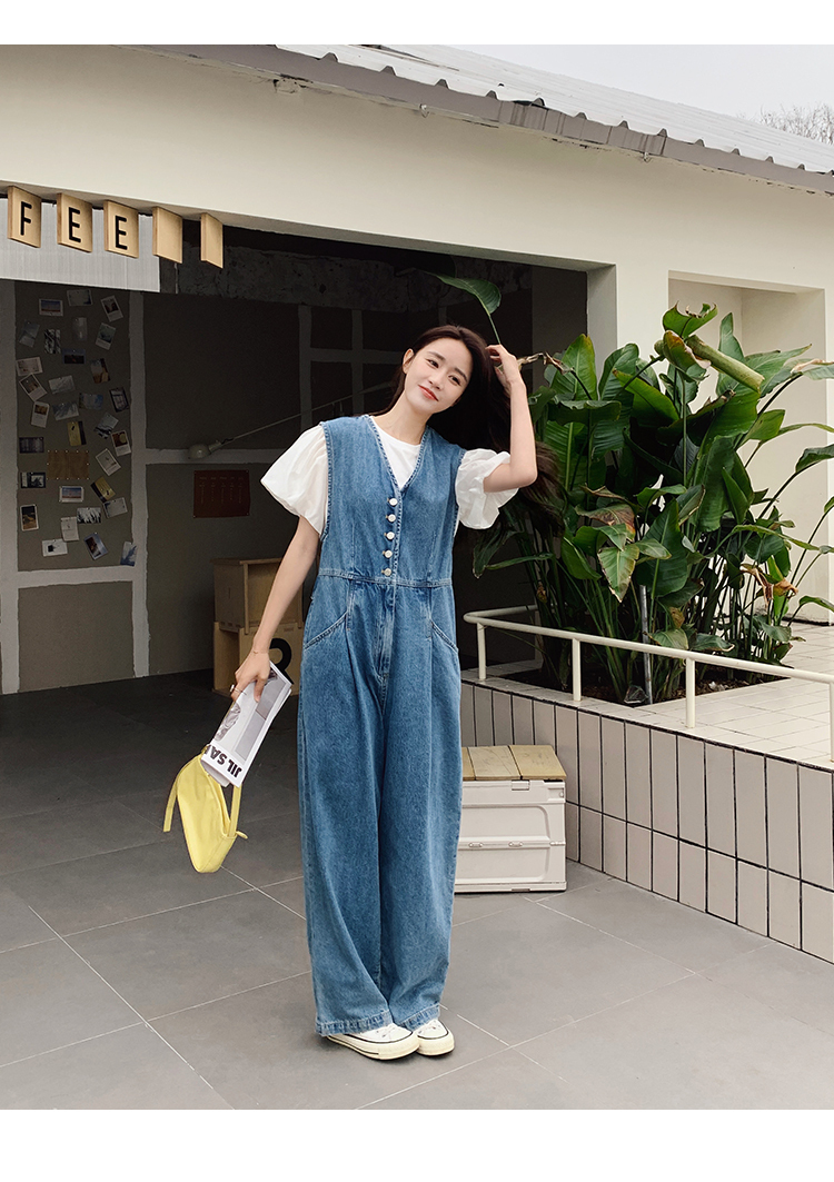 獨家訂製│韓系甜酷風單排釦牛仔吊帶褲(05H3911)