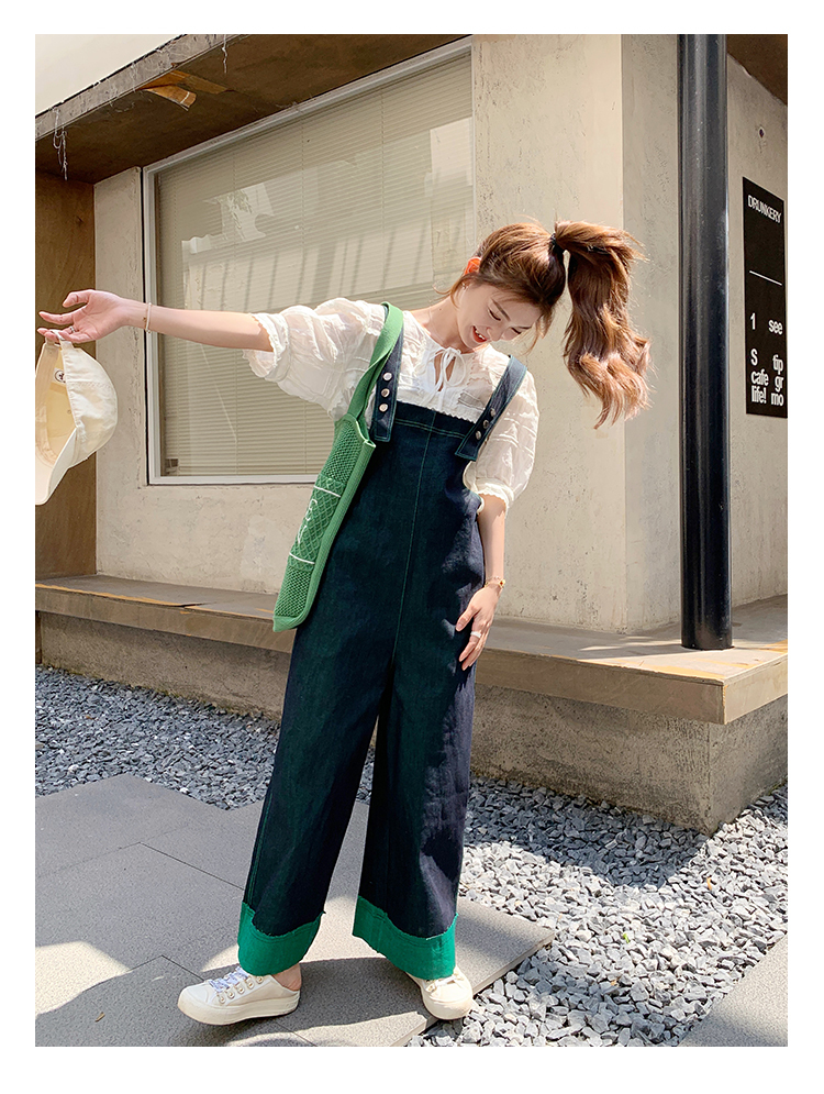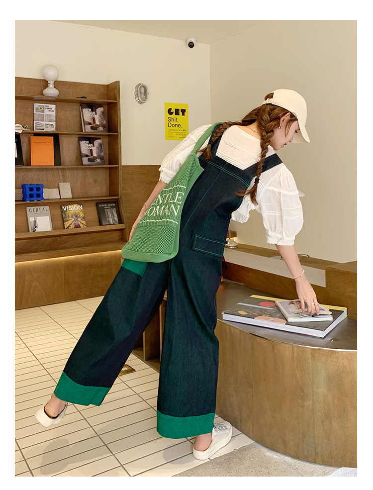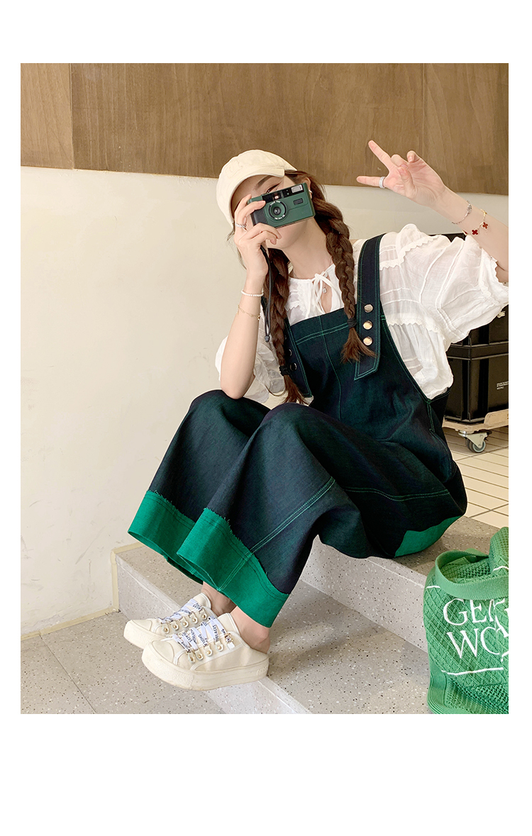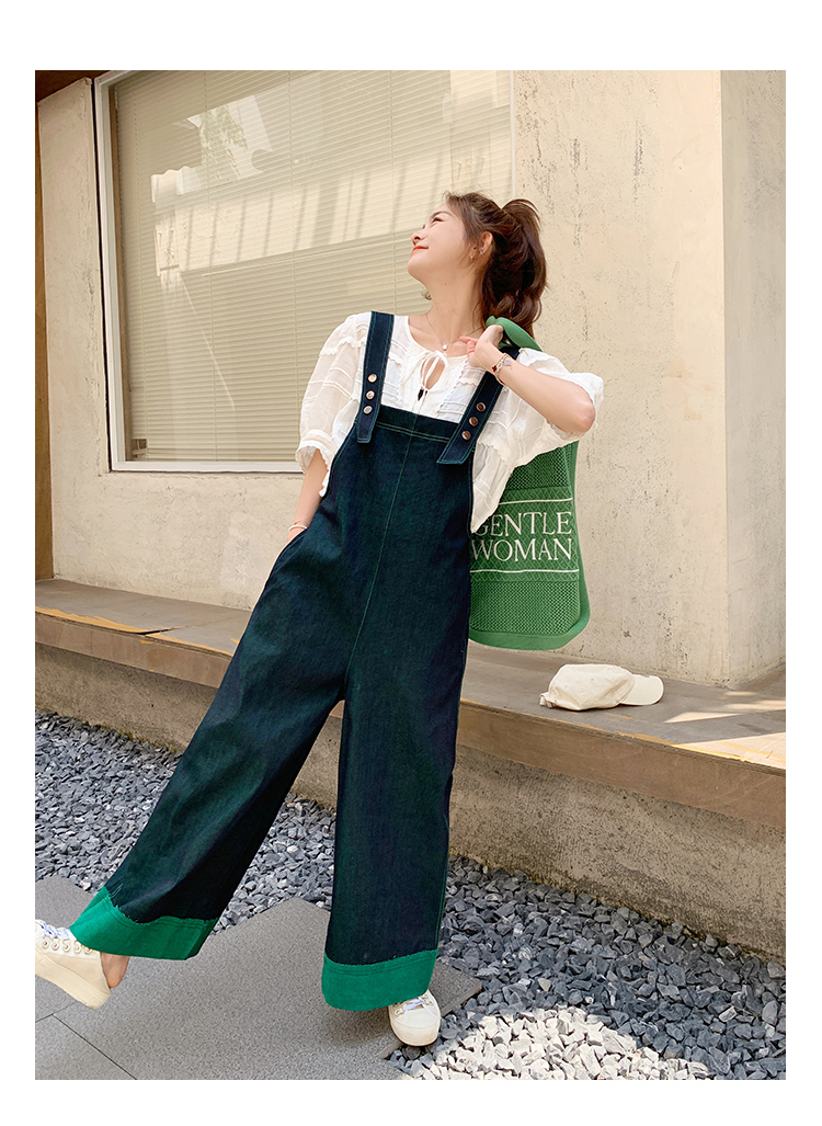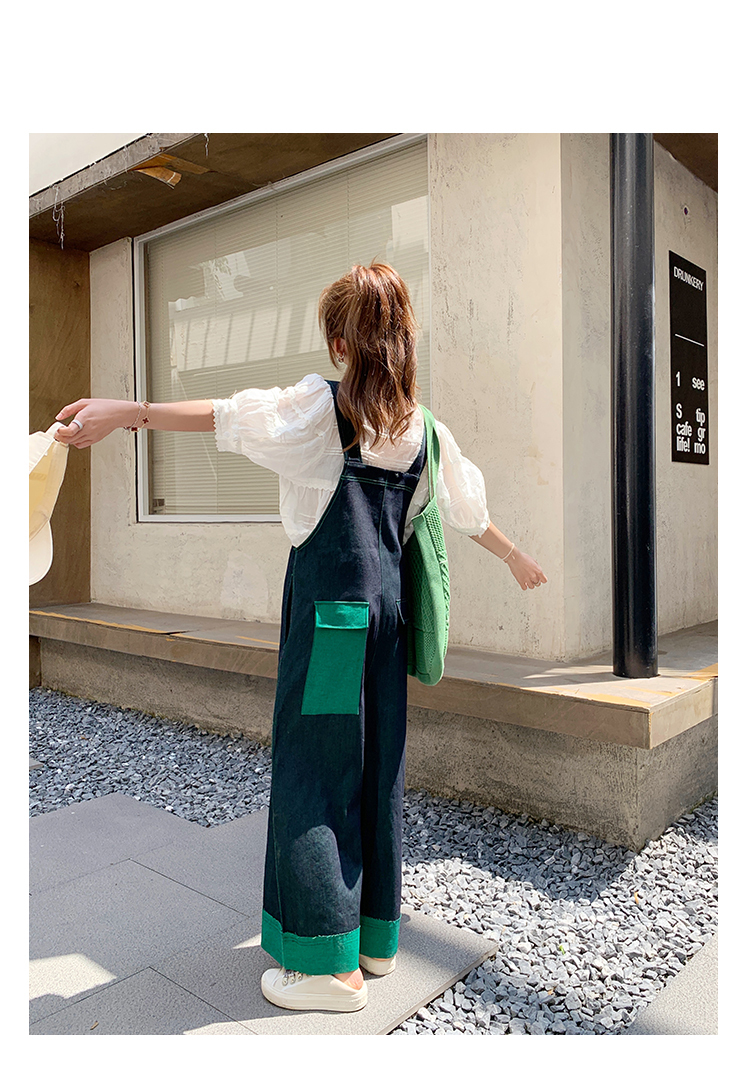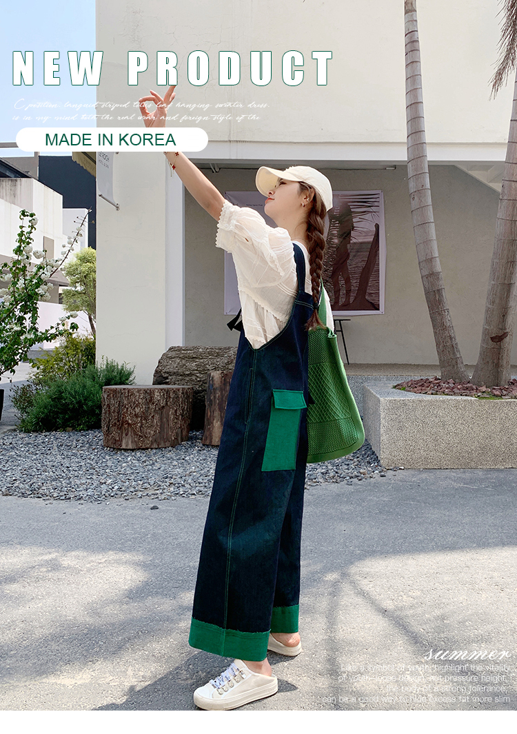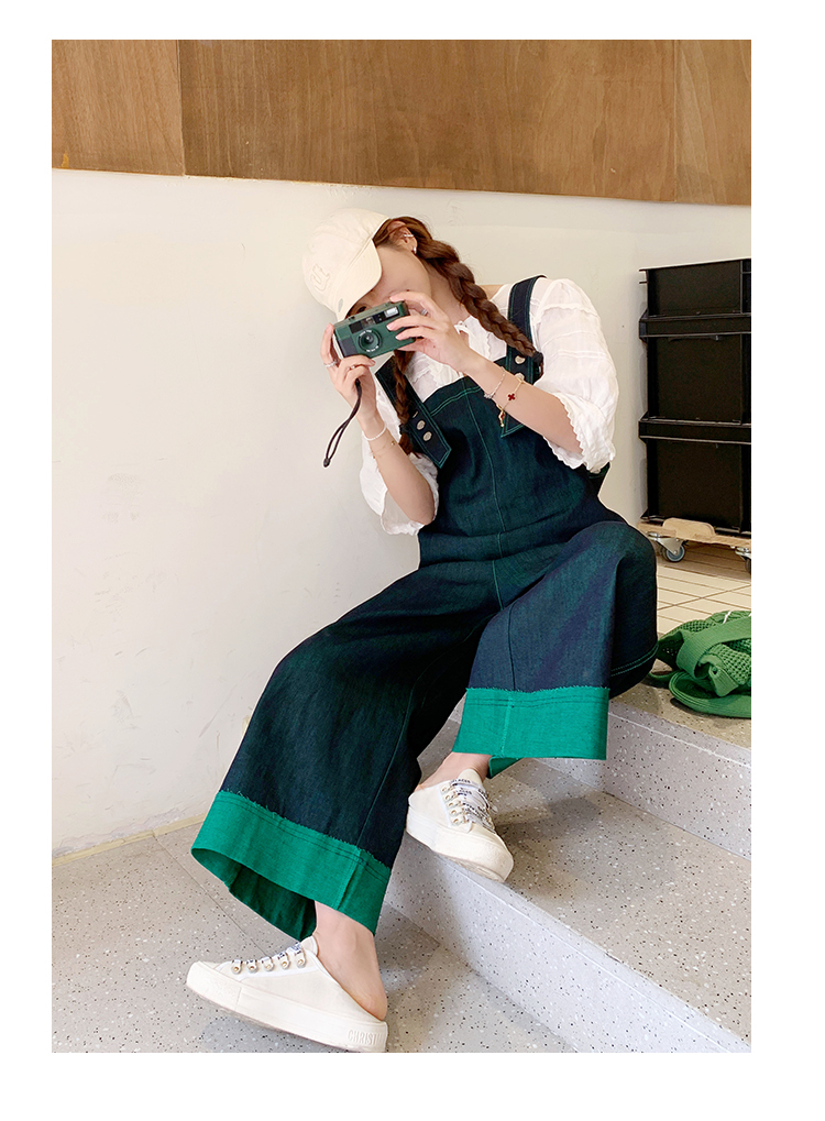 獨家訂製│韓系甜酷風撞色拼接大闊腿牛仔吊帶褲(05H3912)