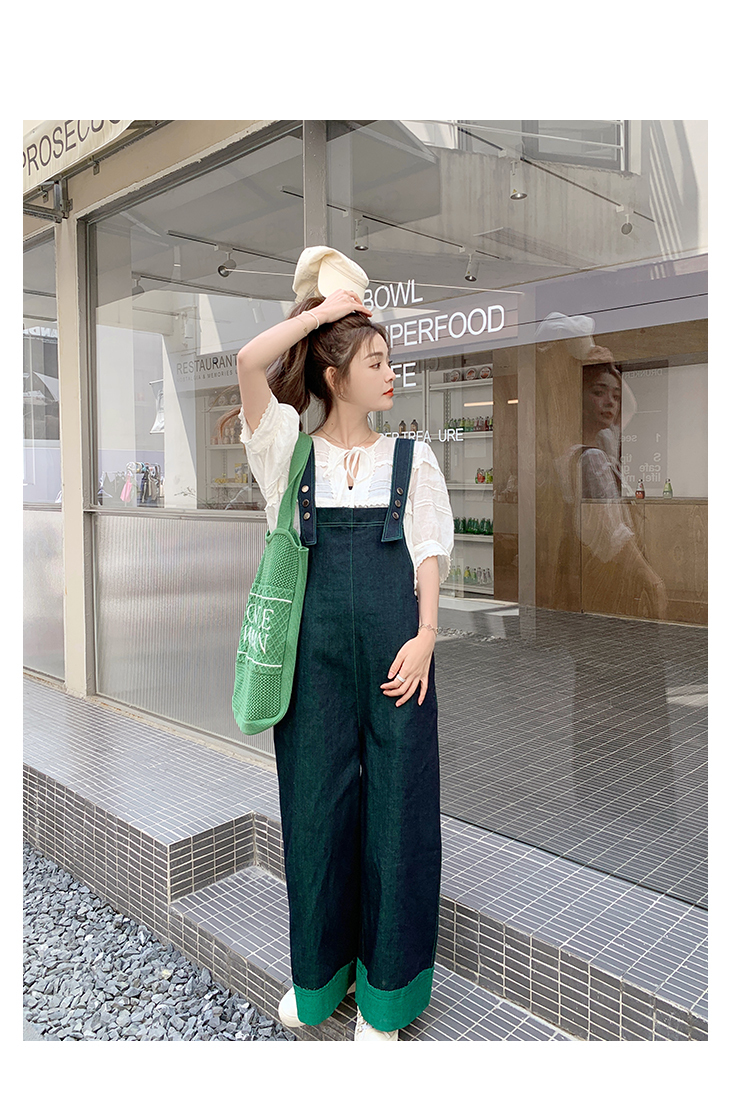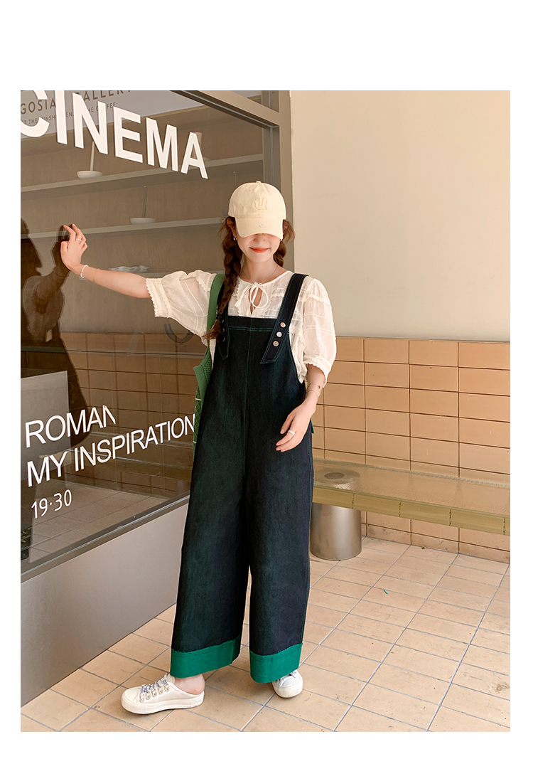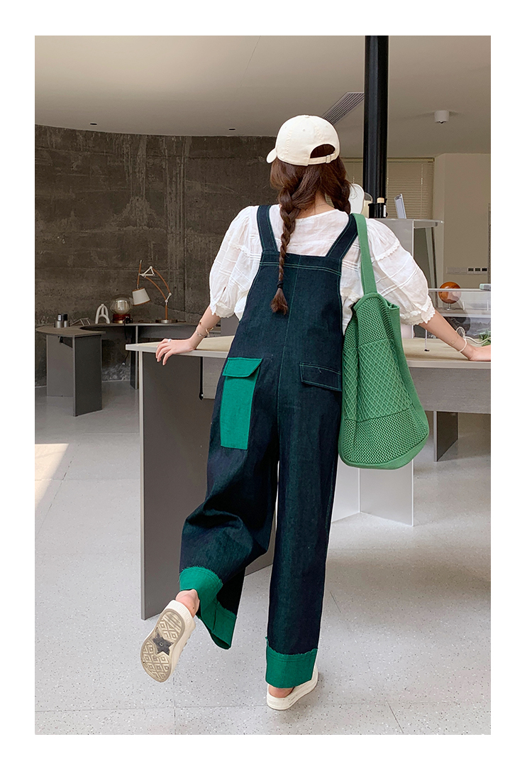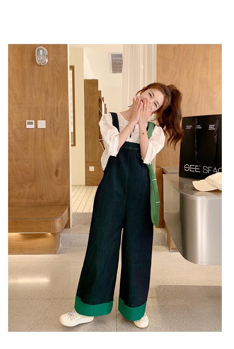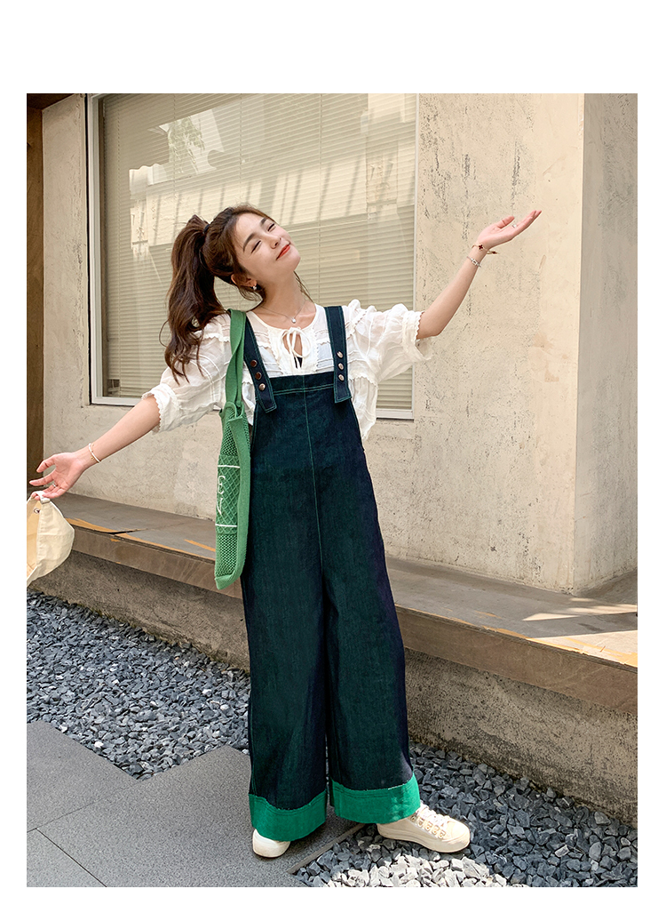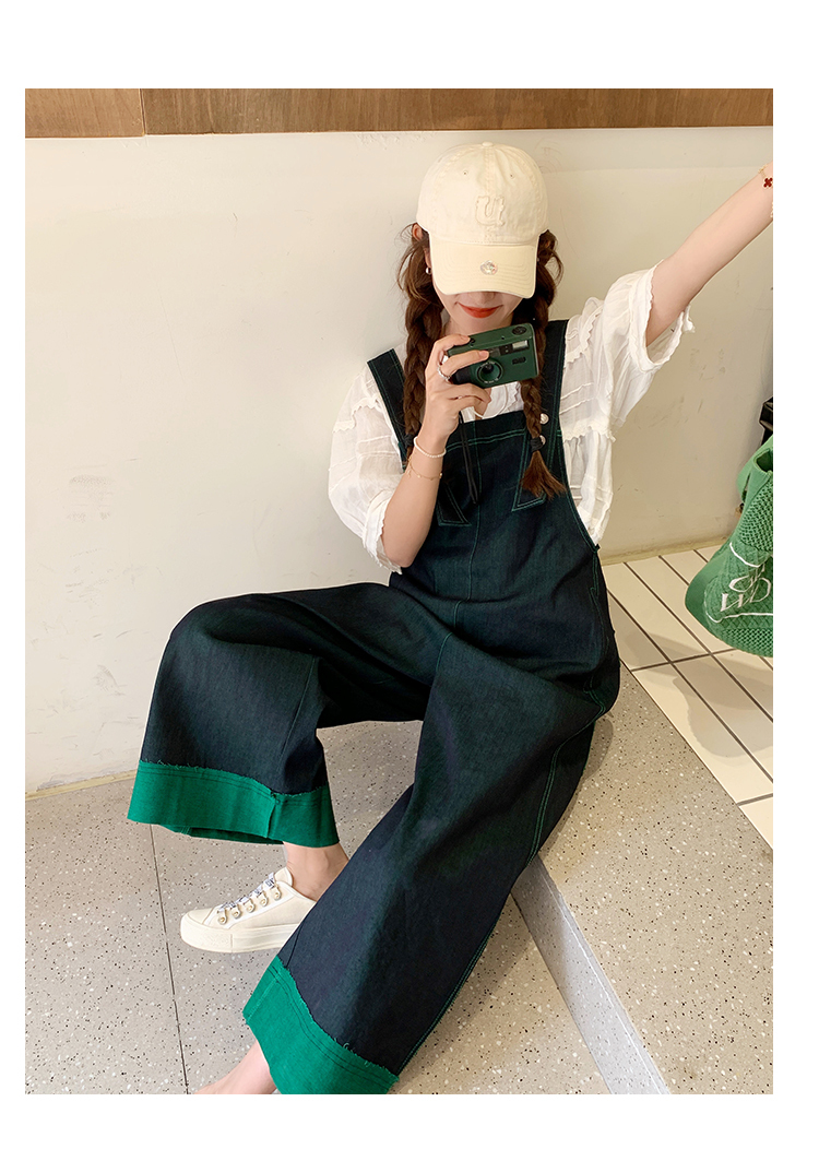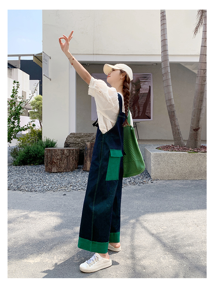 獨家訂製│韓系甜酷風撞色拼接大闊腿牛仔吊帶褲(05H3912)