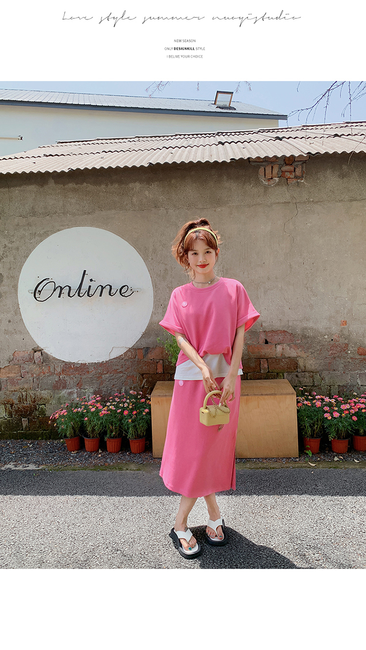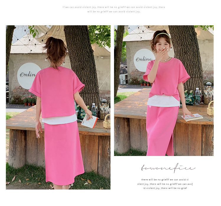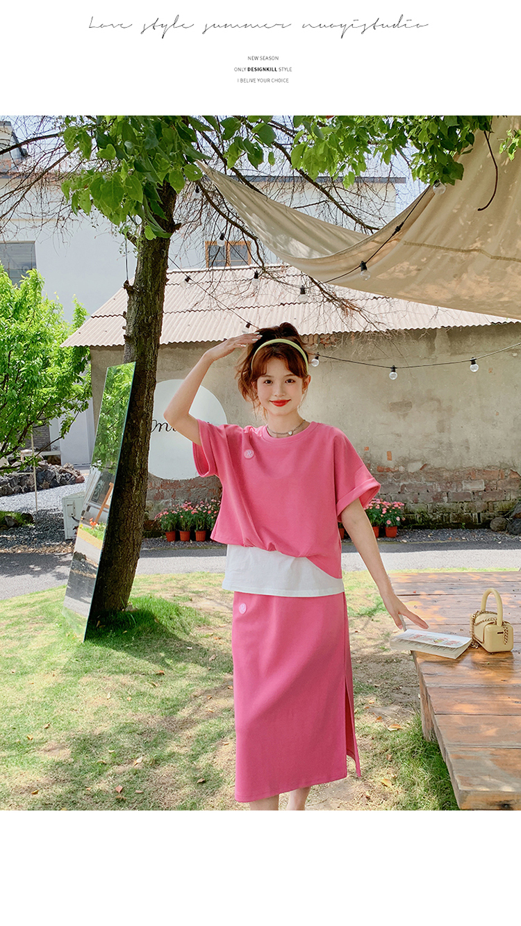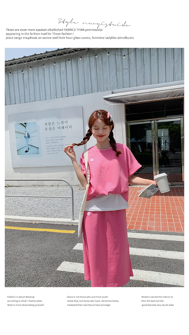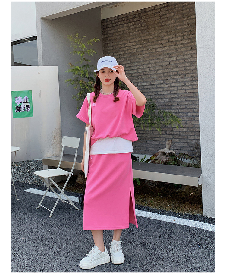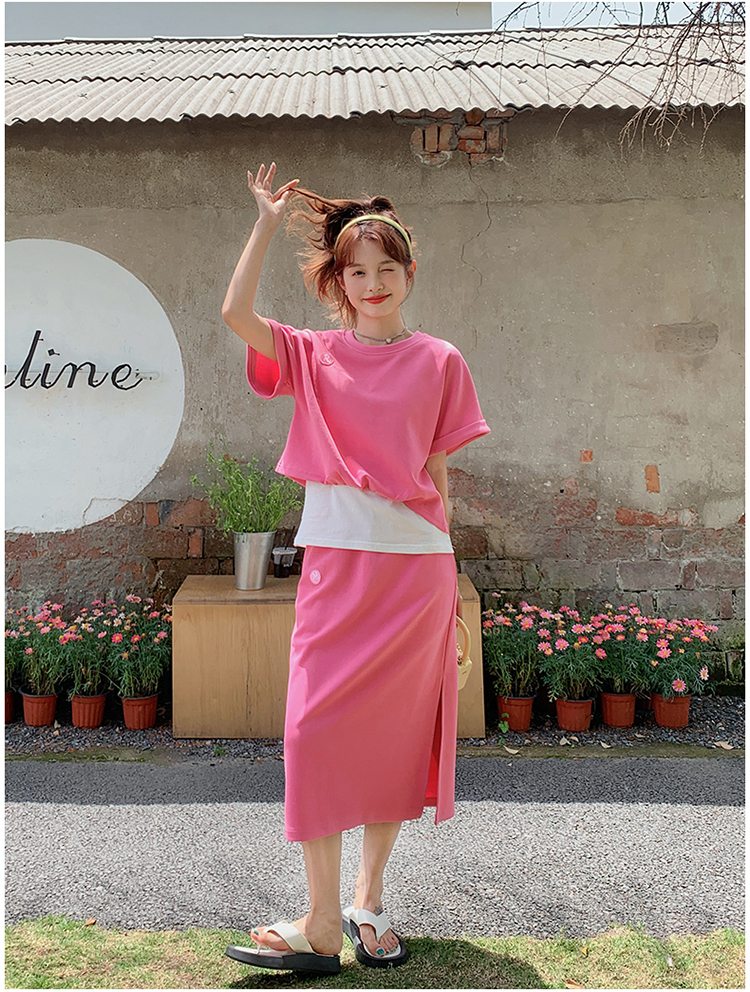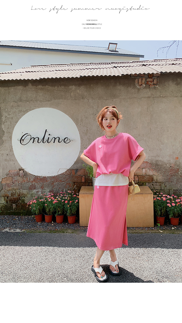 獨家訂製│韓系甜酷風撞色拼接假兩件式T恤+開叉A字裙兩件式套裝組(05H6203)