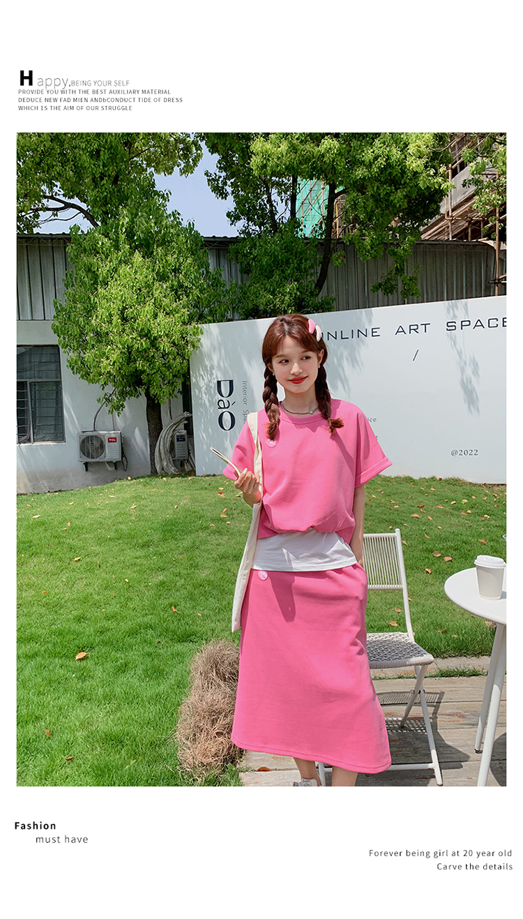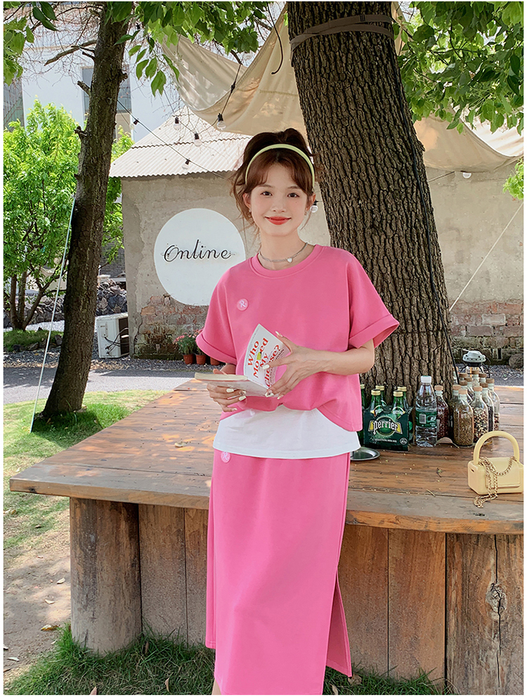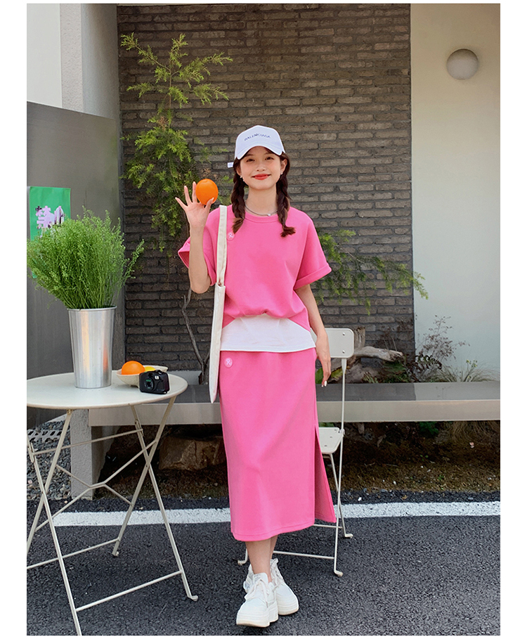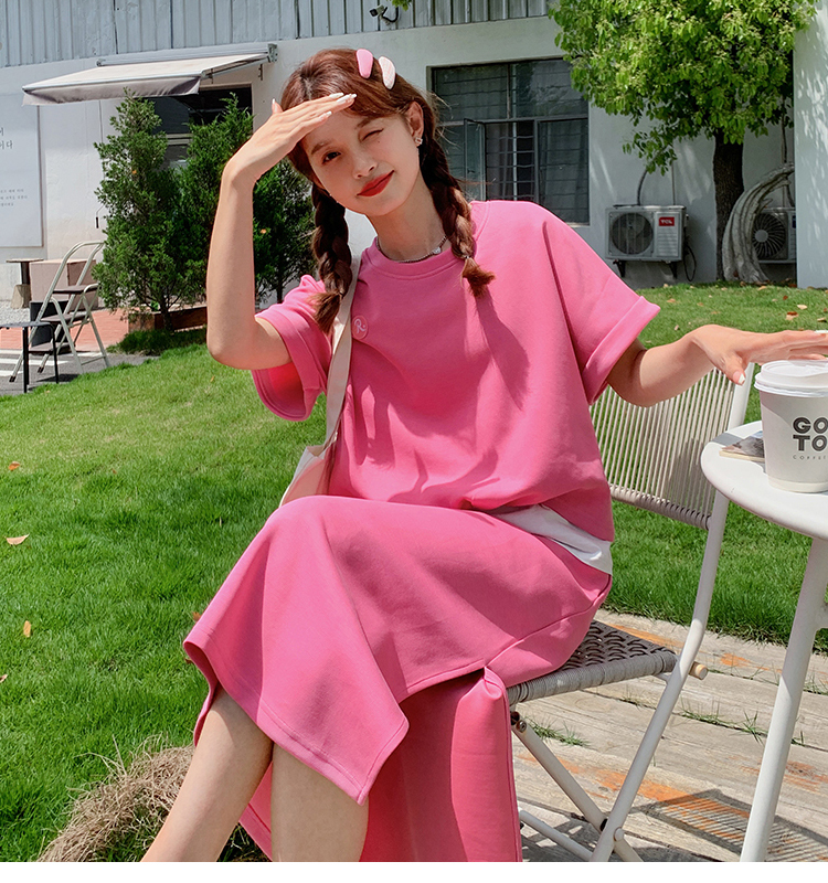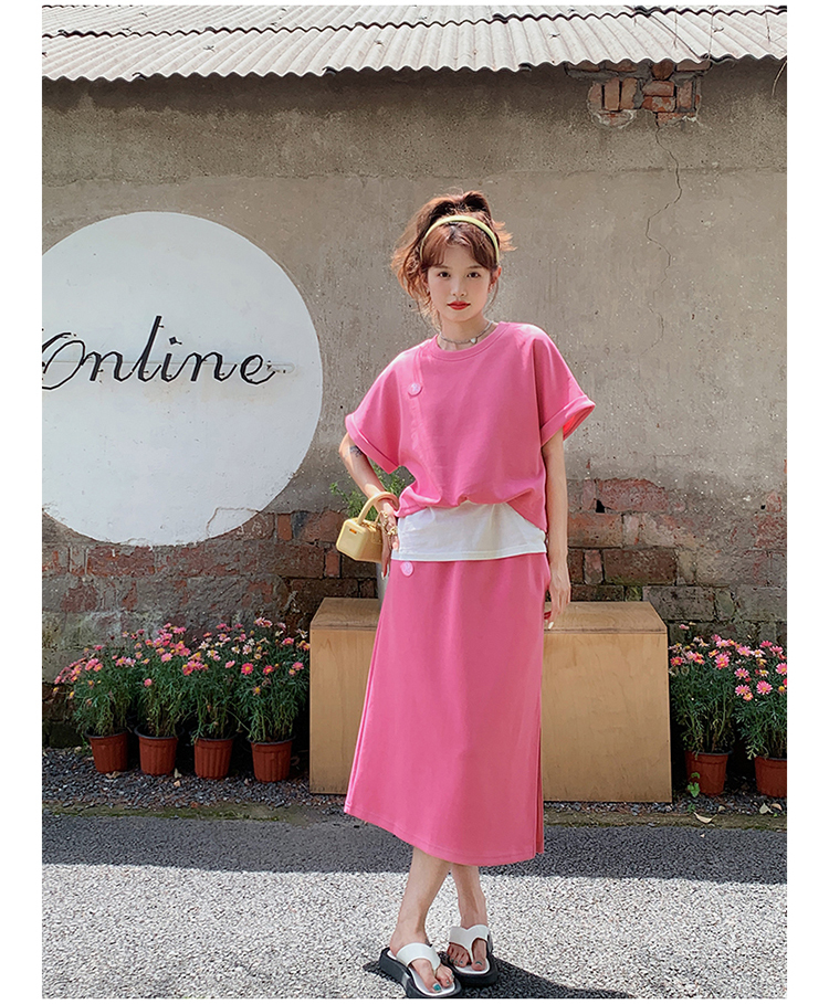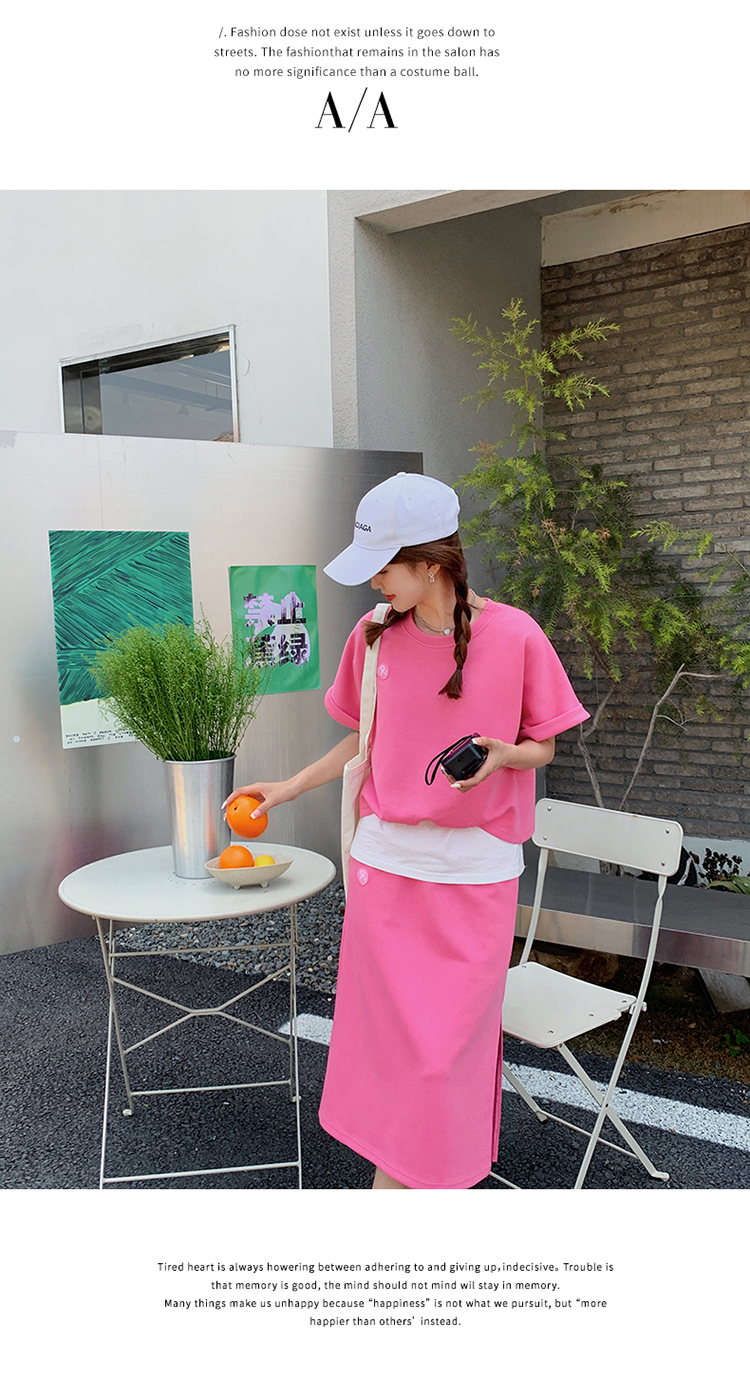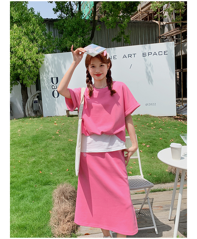 獨家訂製│韓系甜酷風撞色拼接假兩件式T恤+開叉A字裙兩件式套裝組(05H6203)