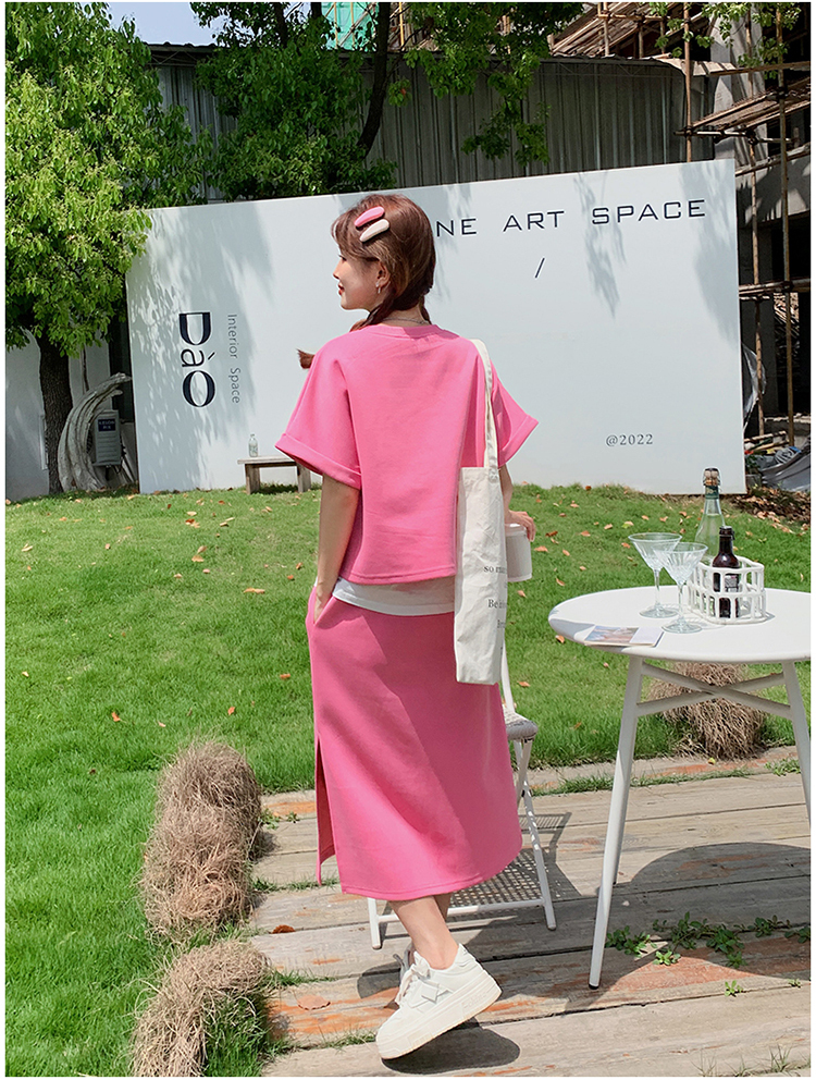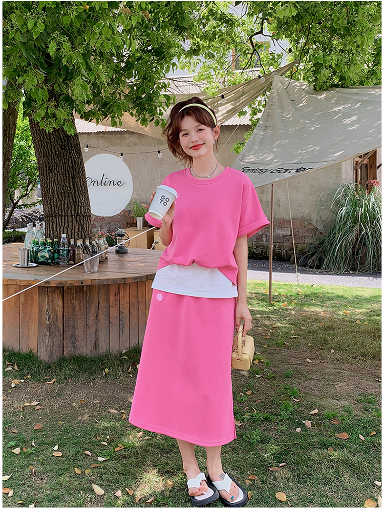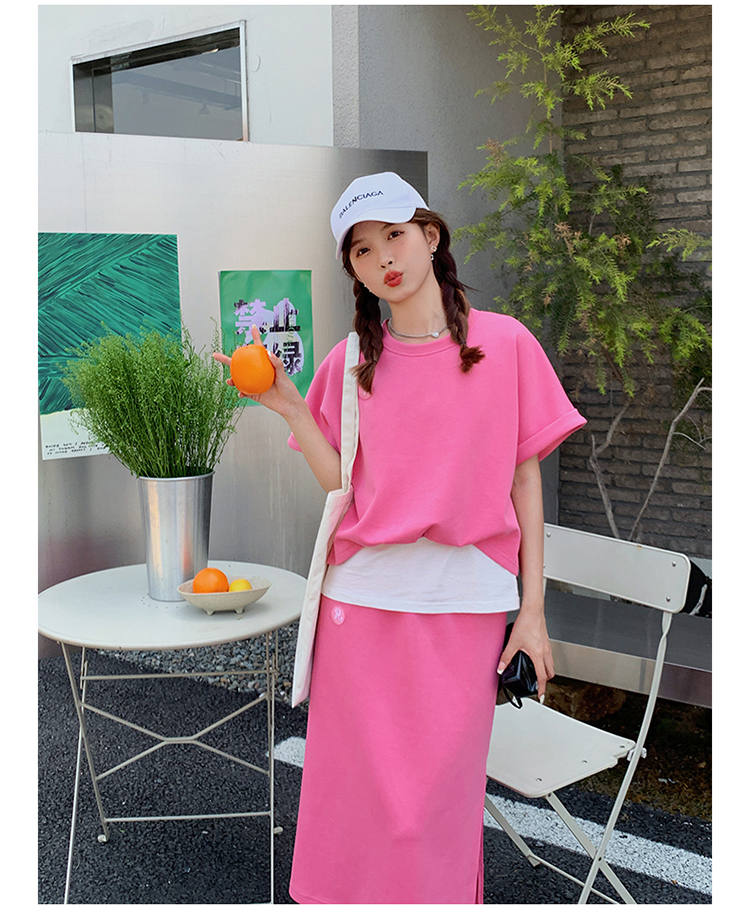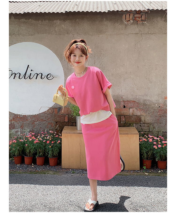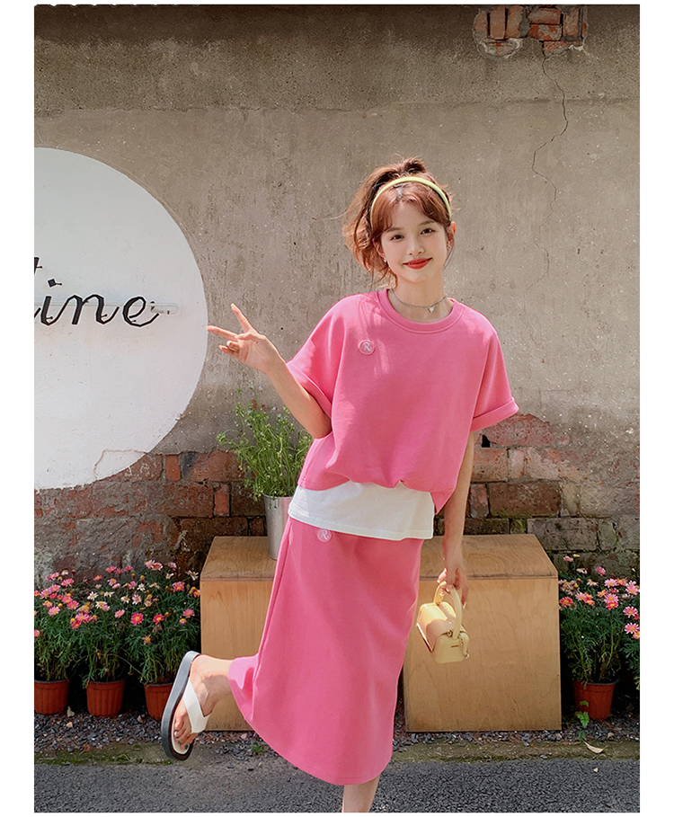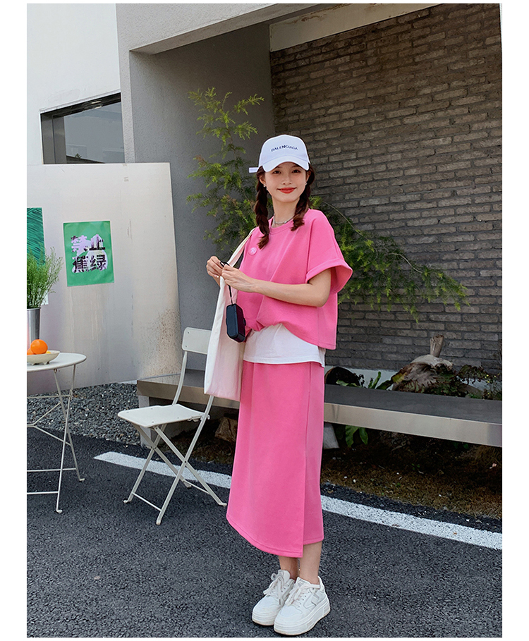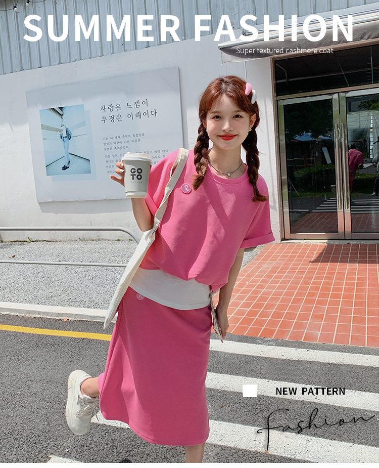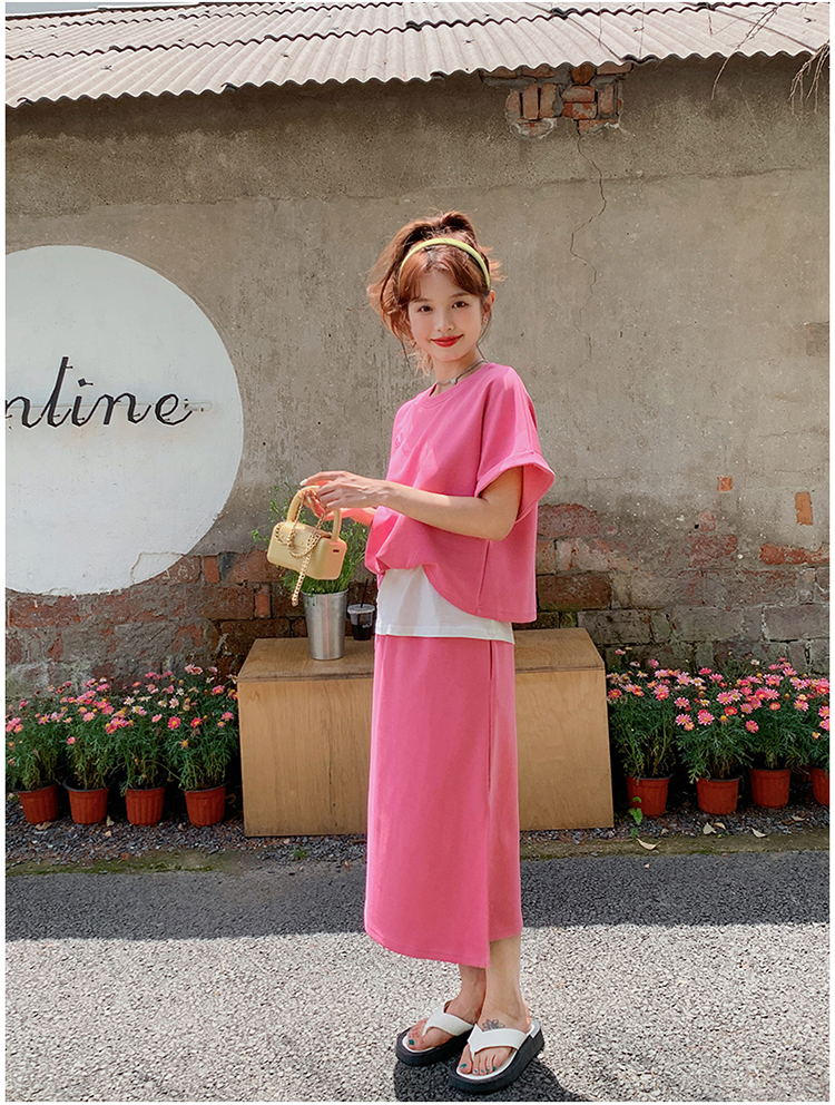 獨家訂製│韓系甜酷風撞色拼接假兩件式T恤+開叉A字裙兩件式套裝組(05H6203)