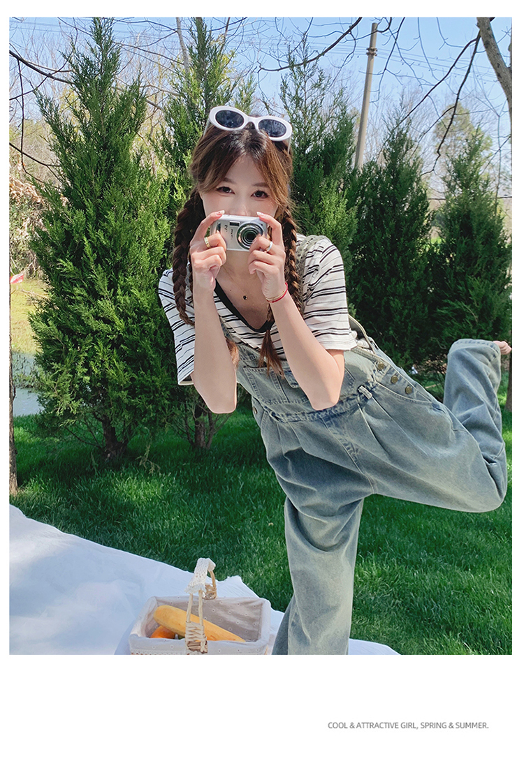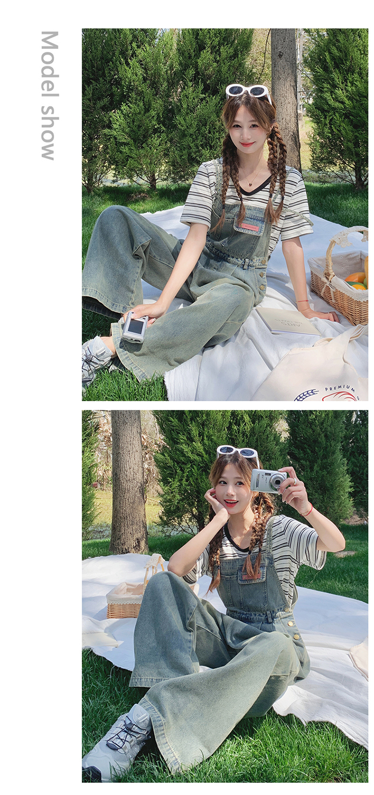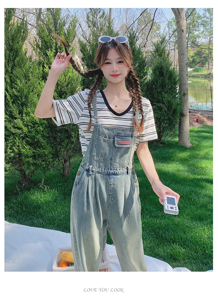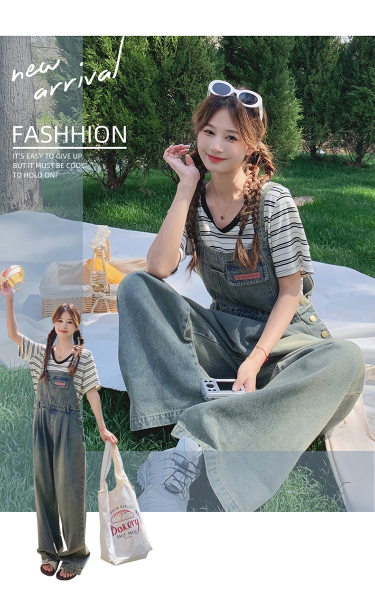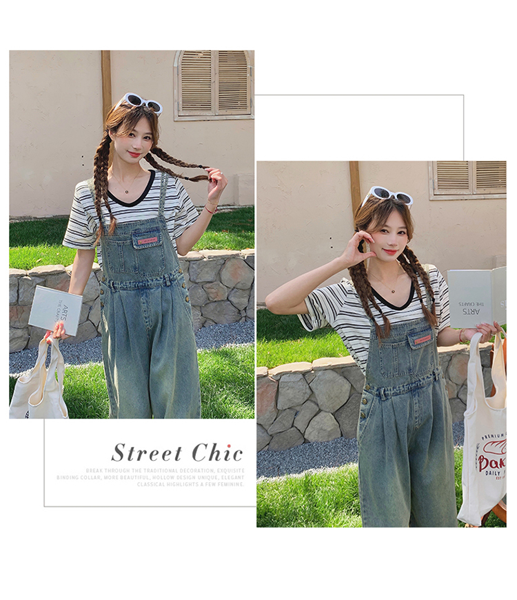 獨家訂製│韓系減齡感T恤+抓褶收腰牛仔吊帶褲兩件式套裝組(05H6245)