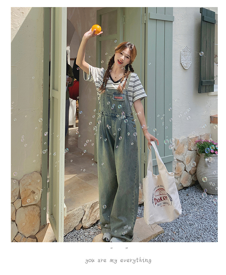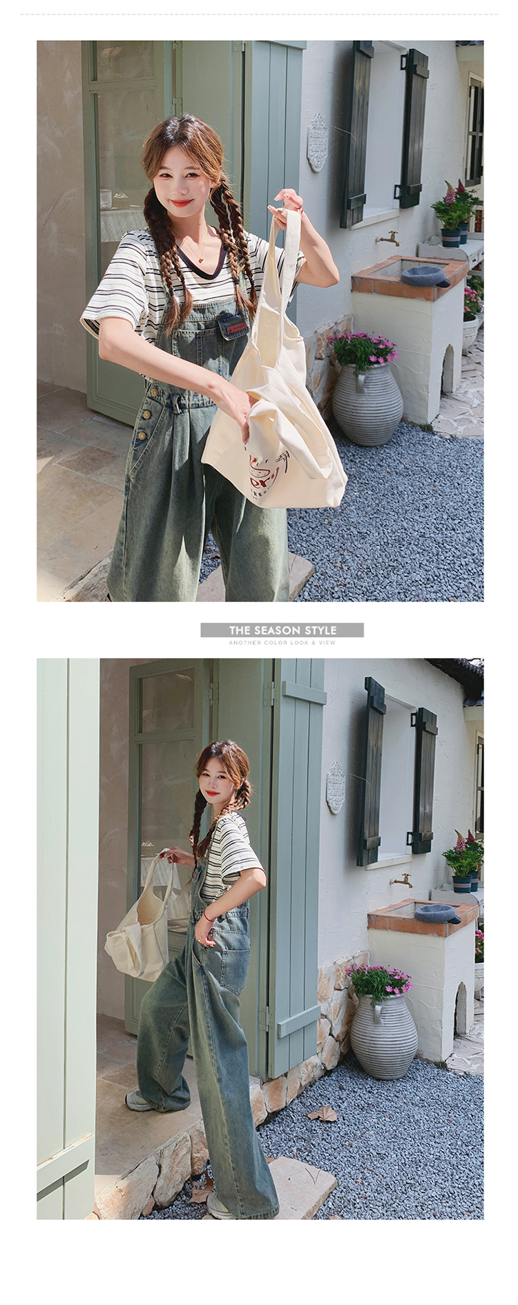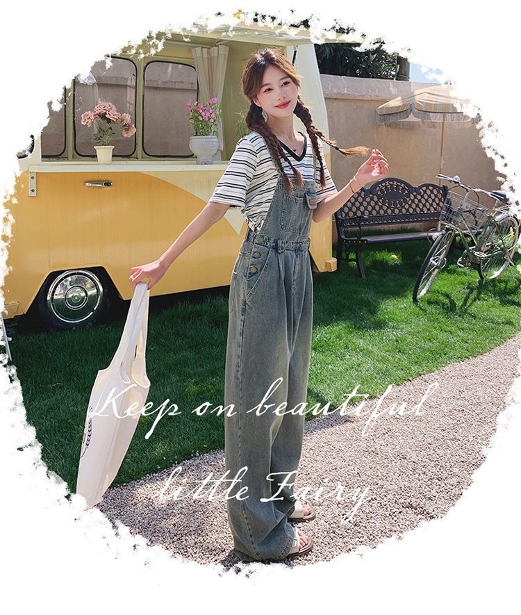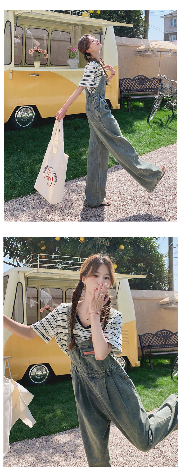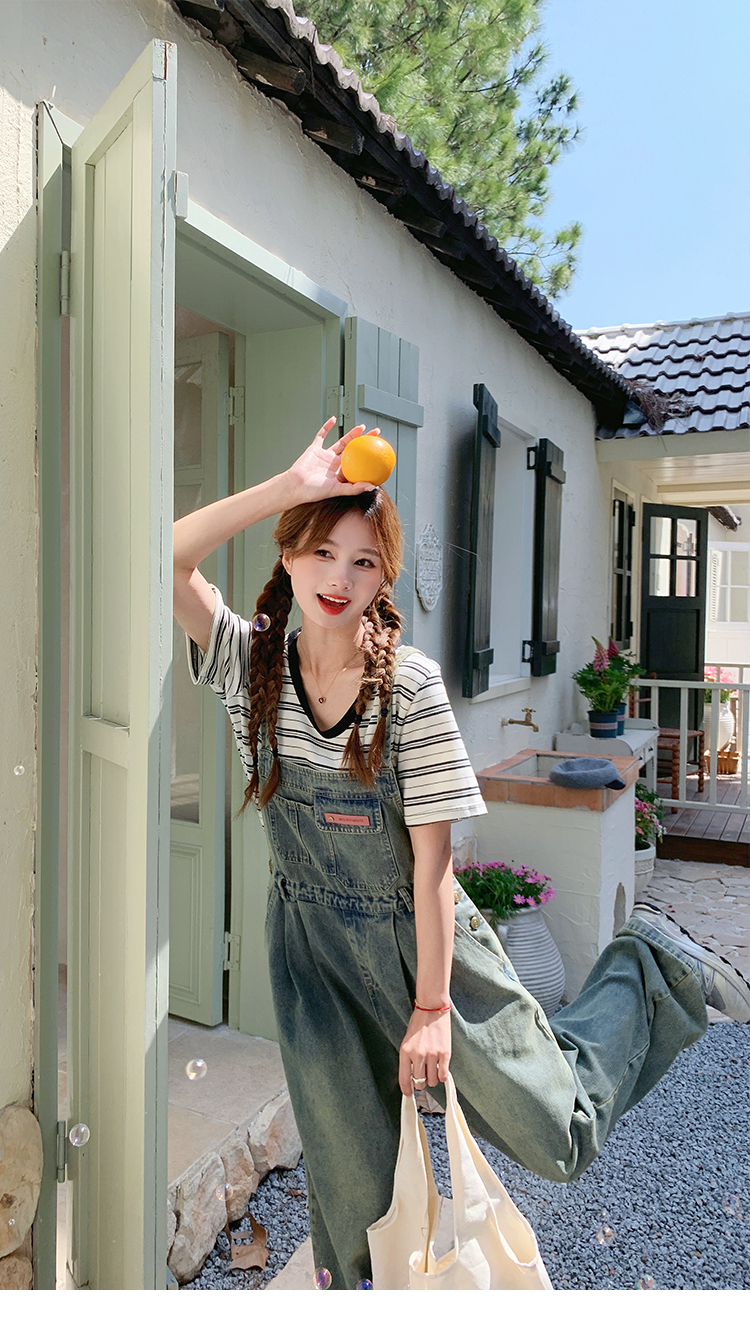 獨家訂製│韓系減齡感T恤+抓褶收腰牛仔吊帶褲兩件式套裝組(05H6245)