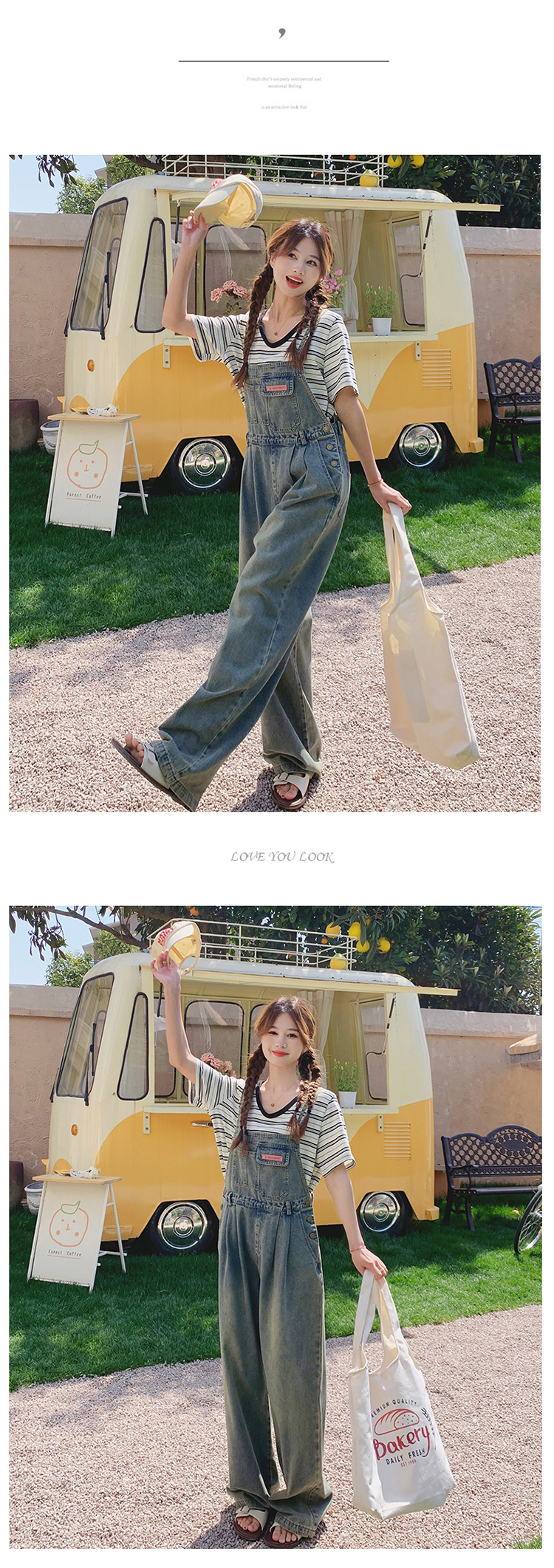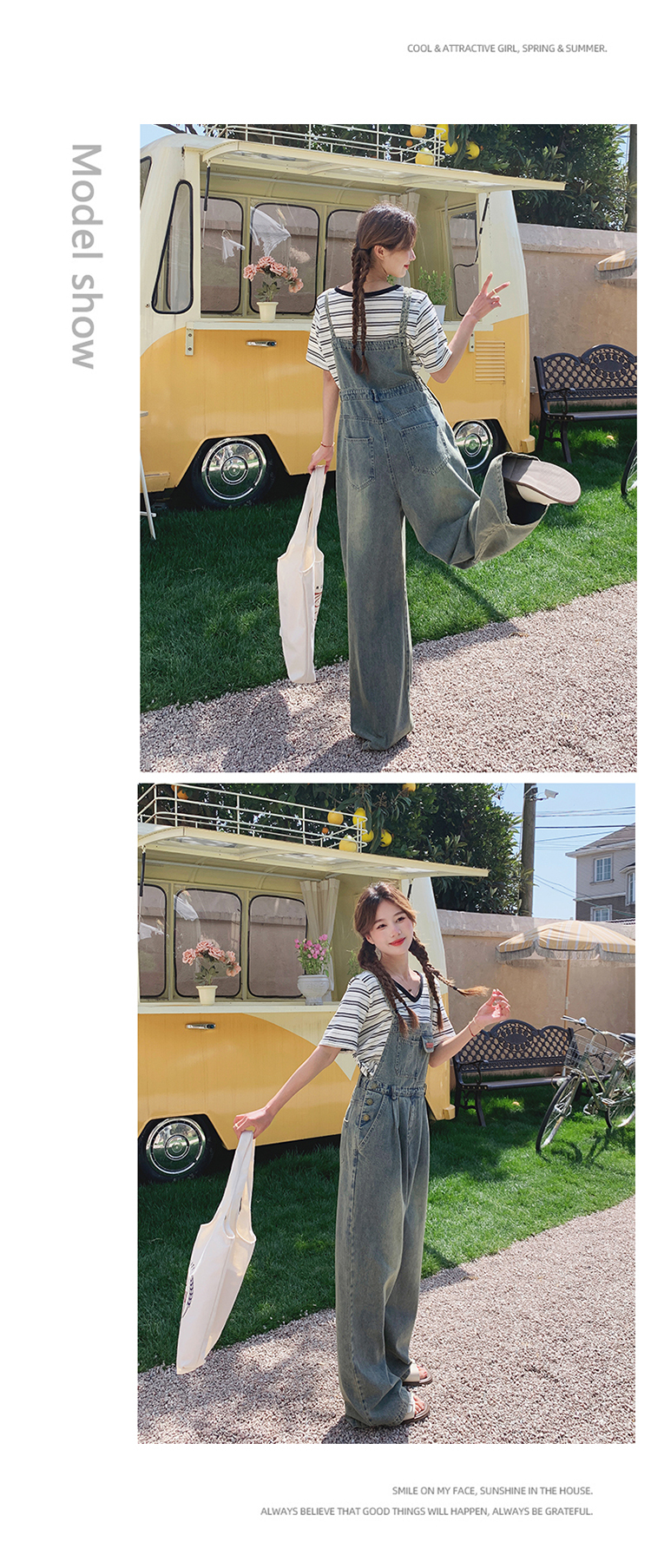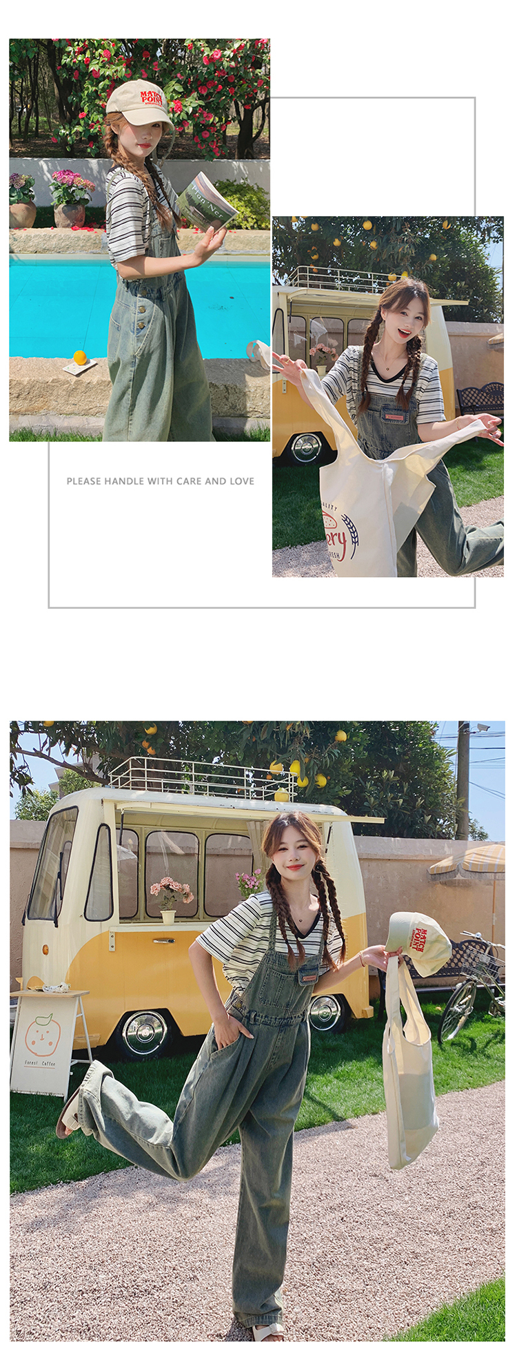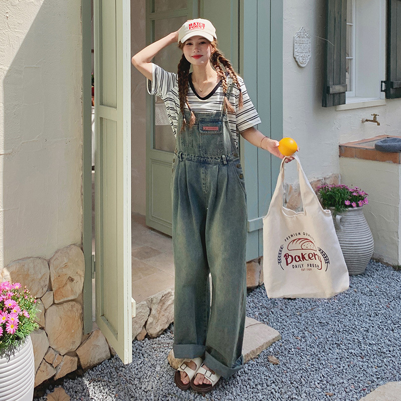 獨家訂製│韓系減齡感T恤+抓褶收腰牛仔吊帶褲兩件式套裝組(05H6245)