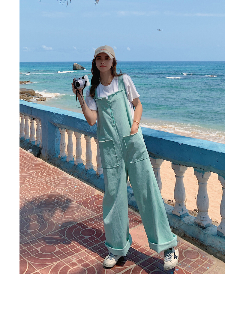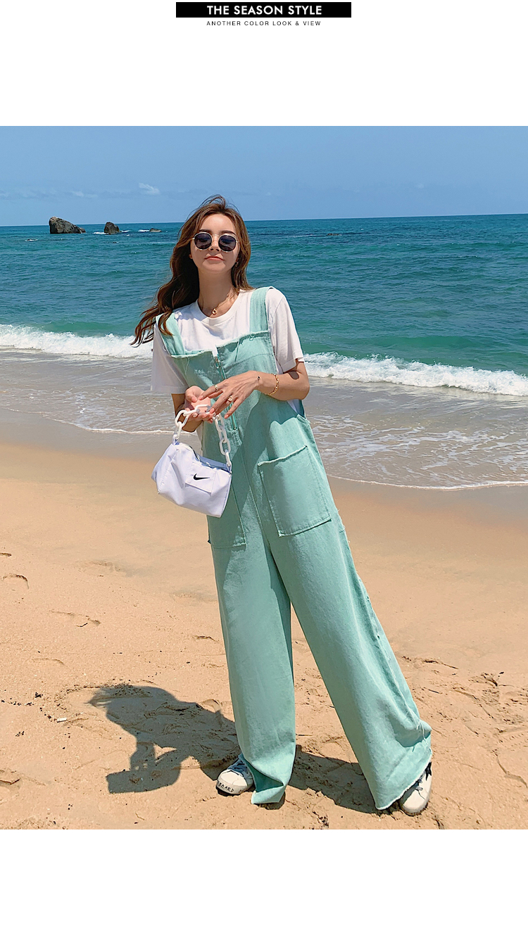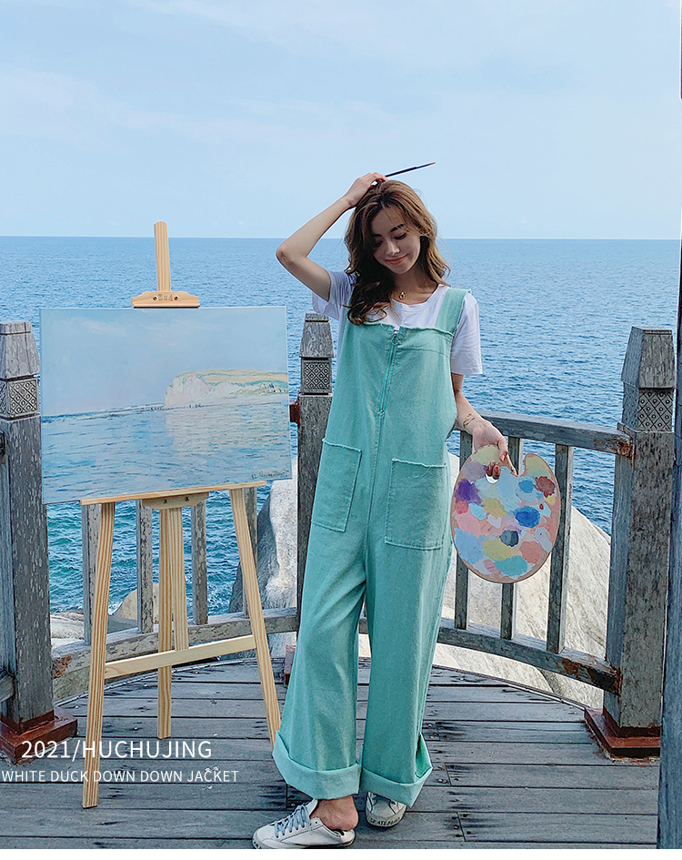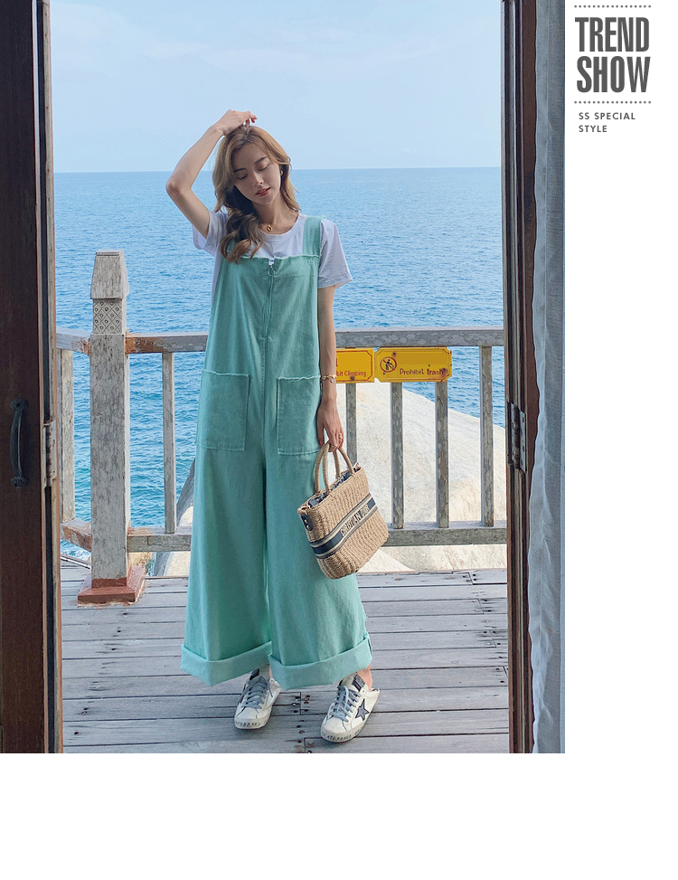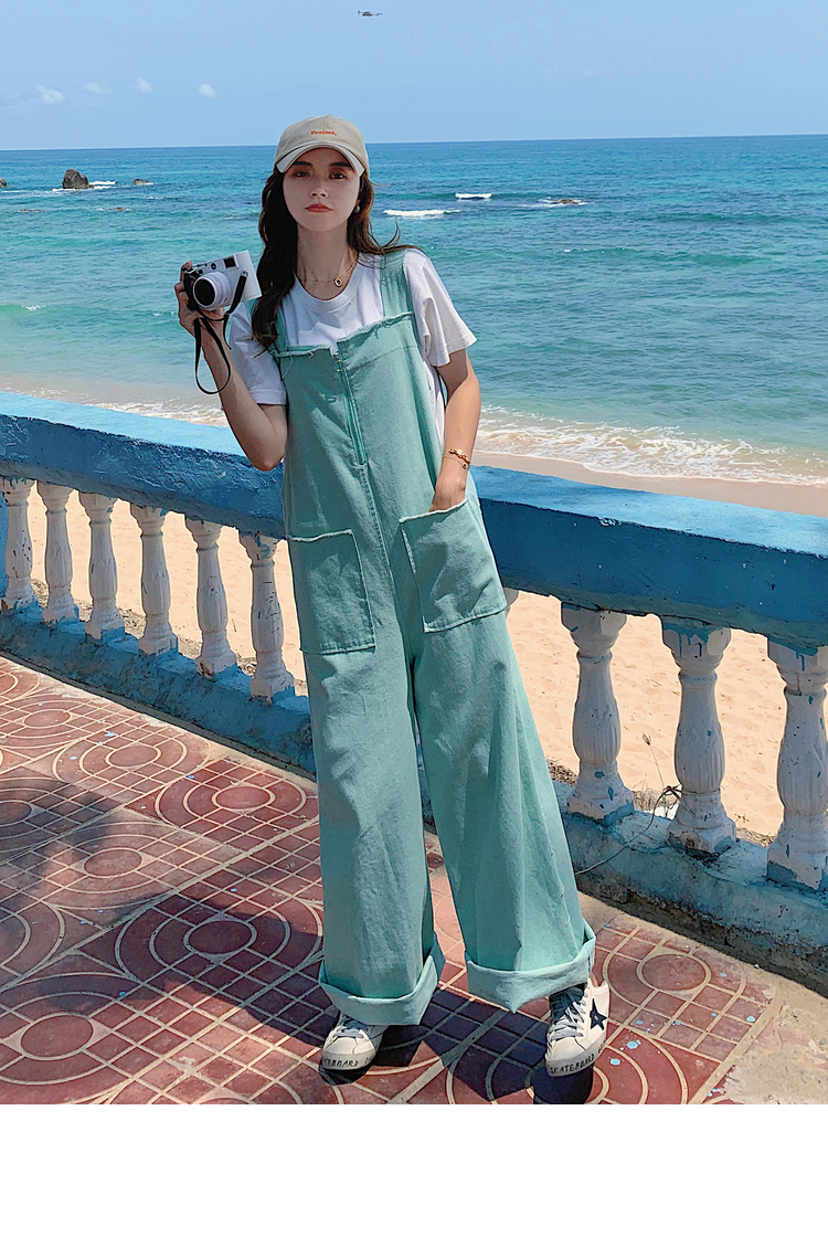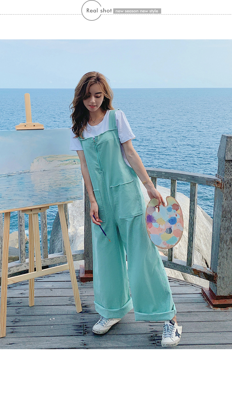 獨家訂製│俏皮舒適刷毛邊拉鍊造型工裝闊腿吊帶褲(05H6402)