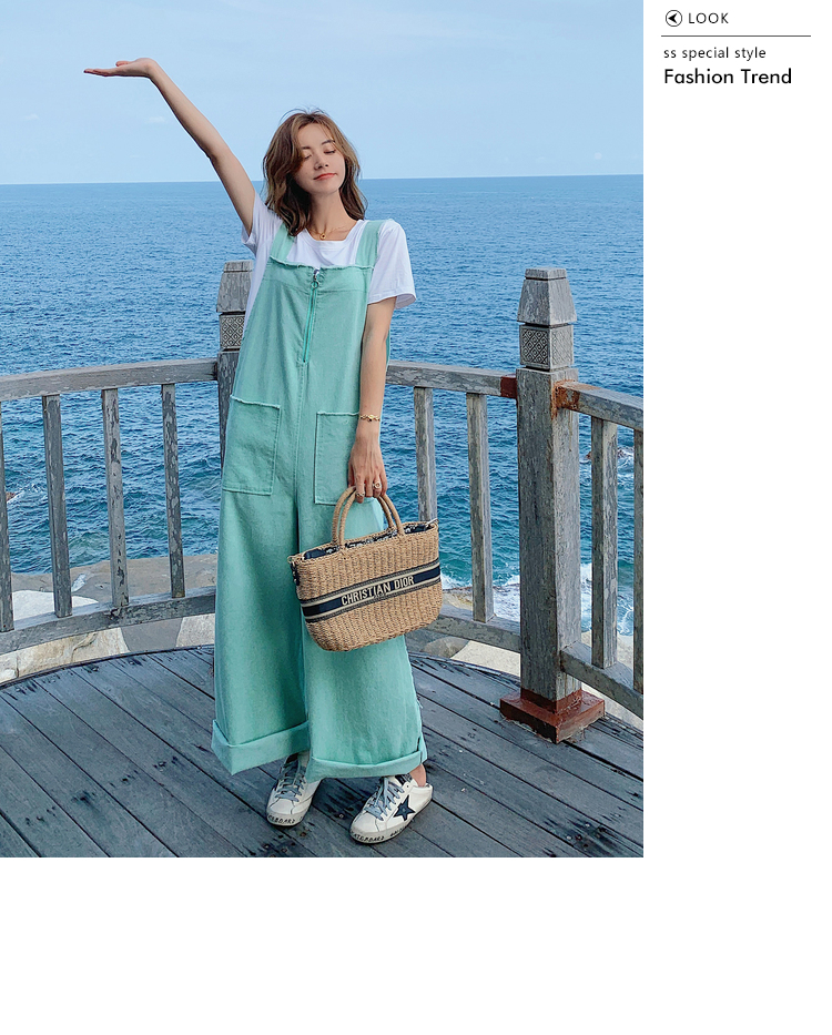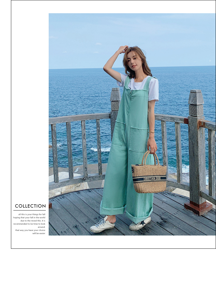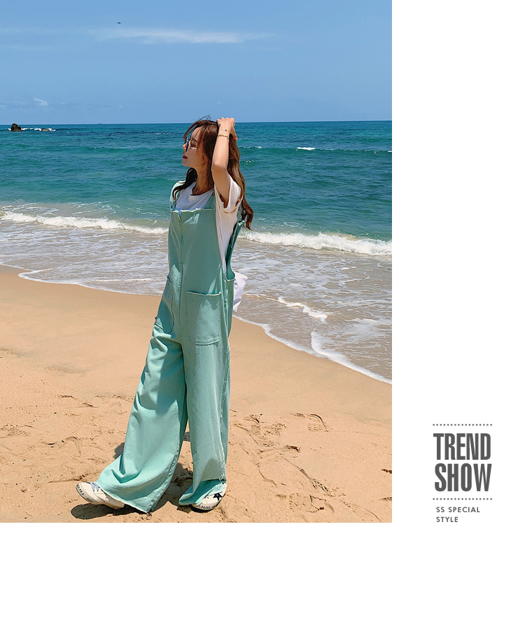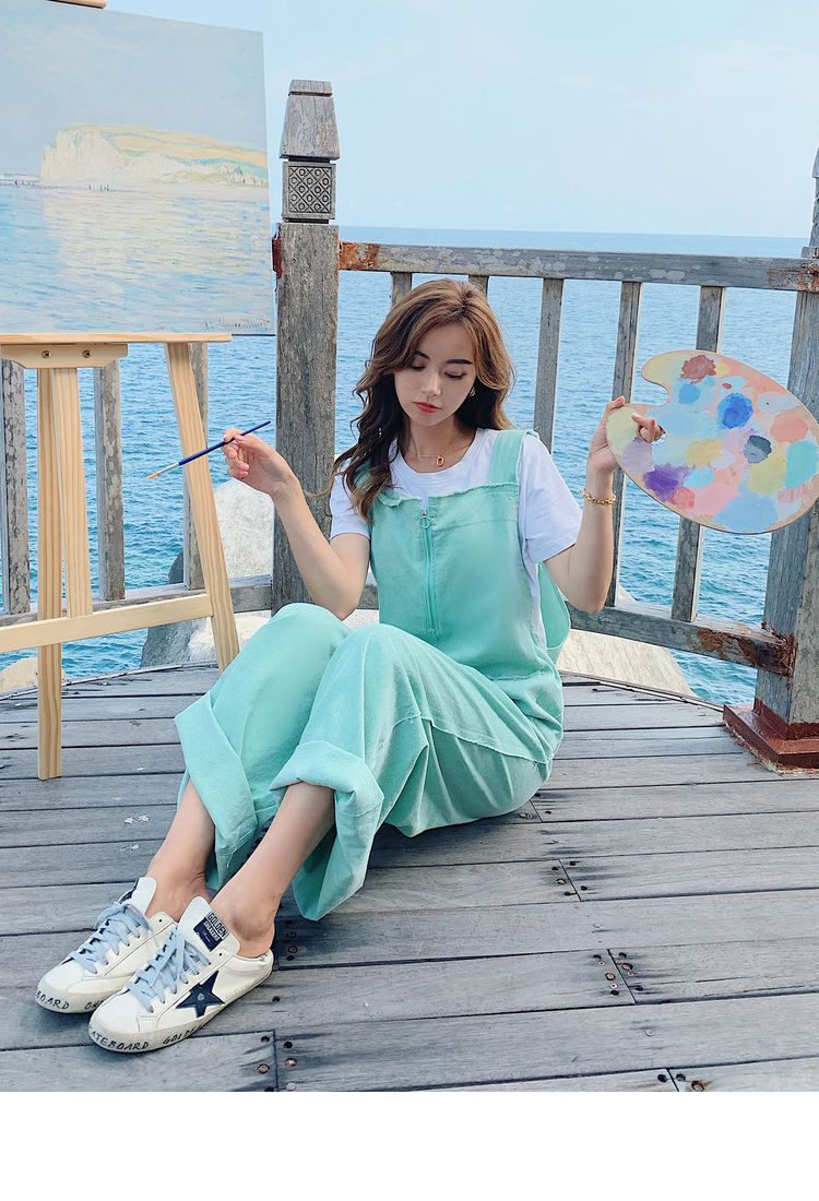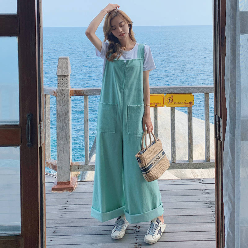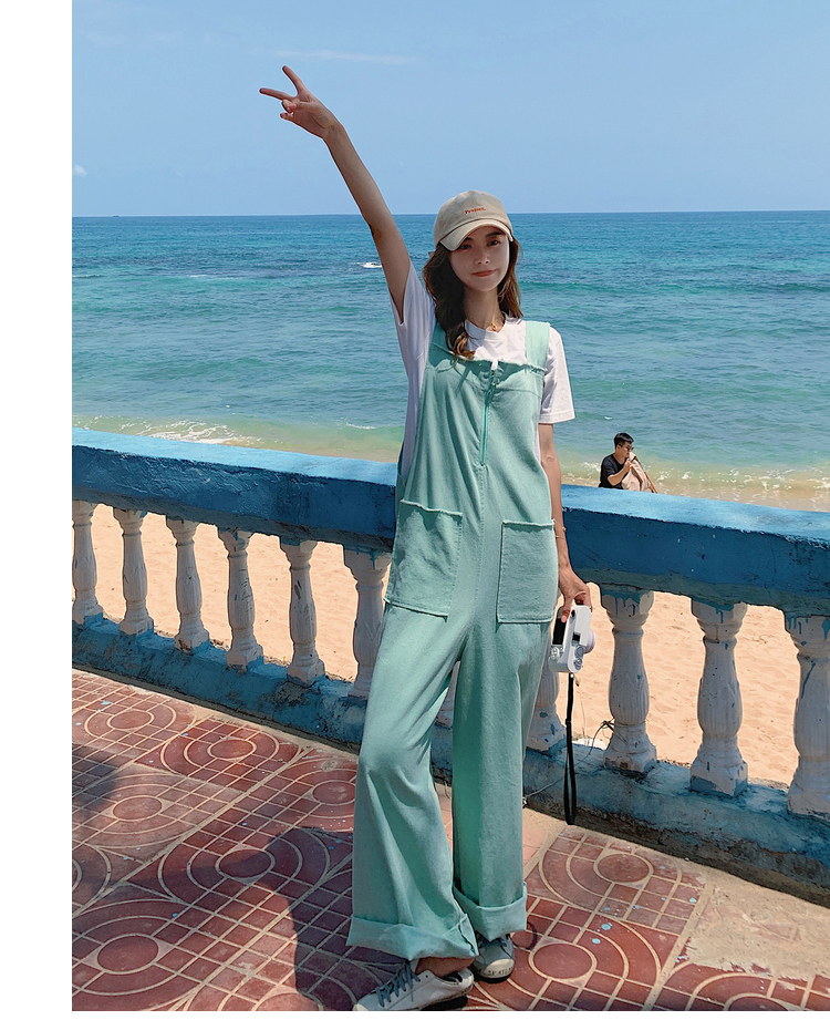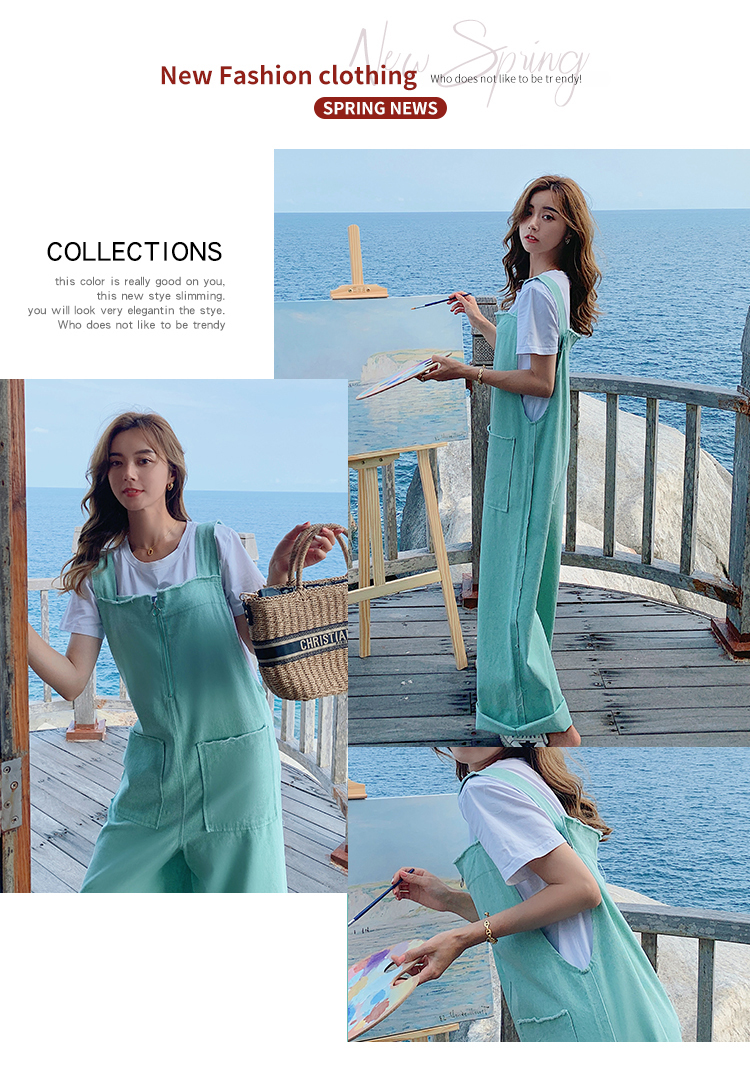 獨家訂製│俏皮舒適刷毛邊拉鍊造型工裝闊腿吊帶褲(05H6402)
