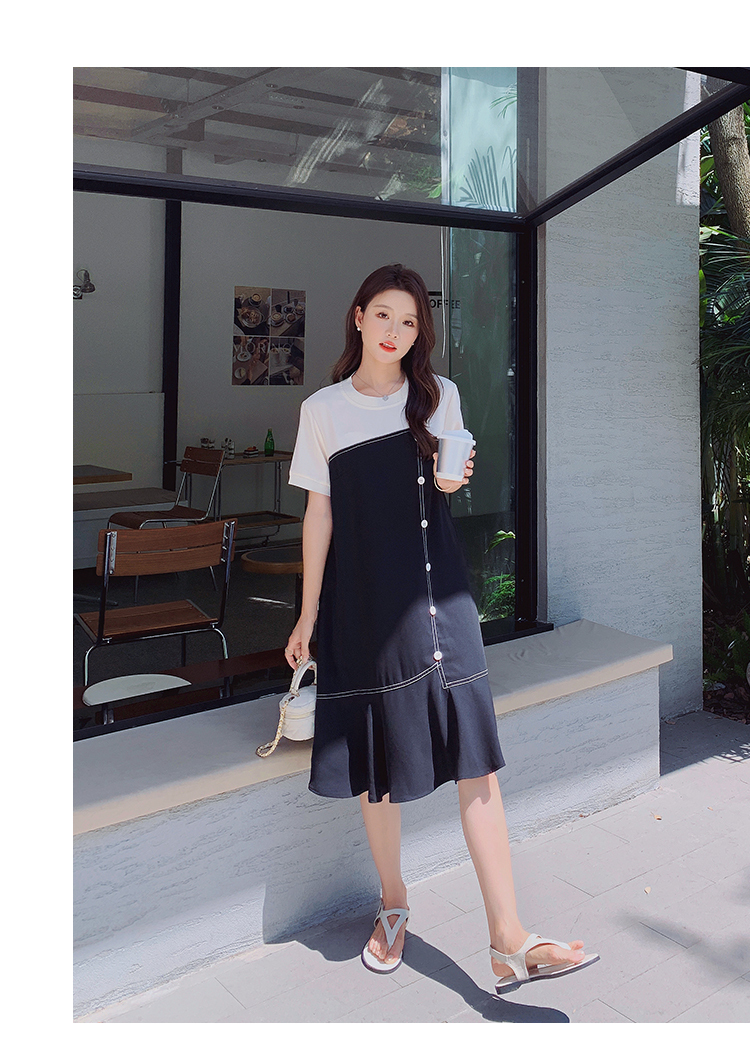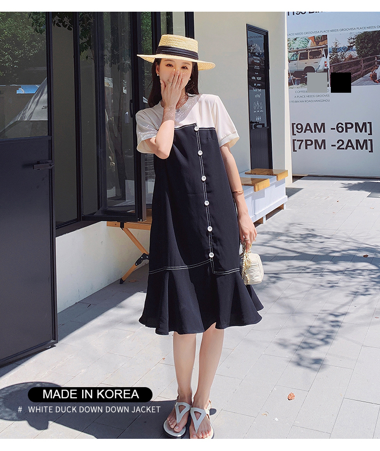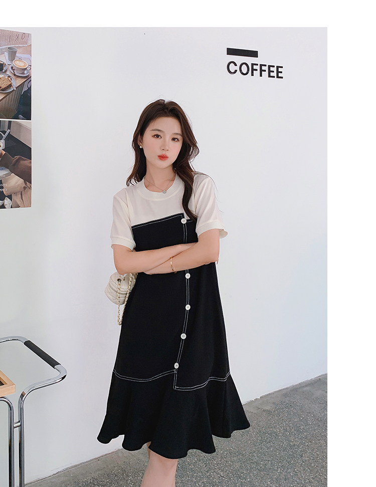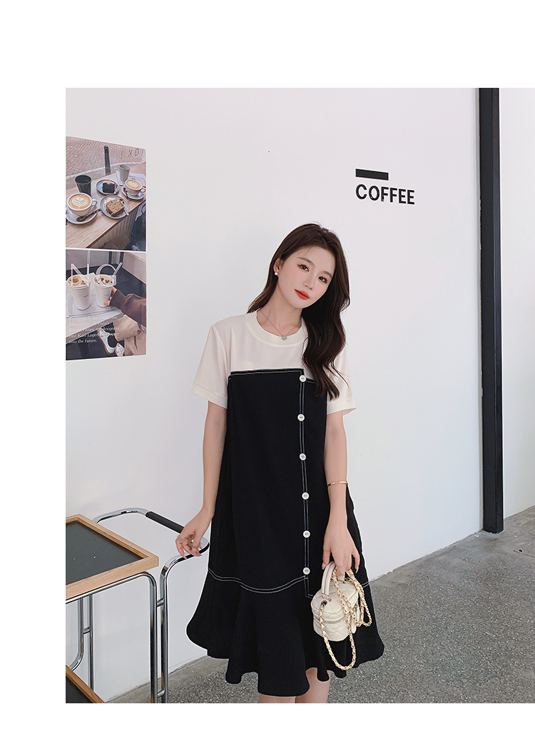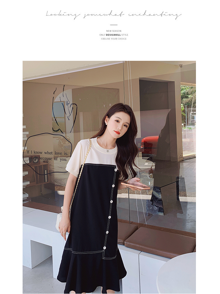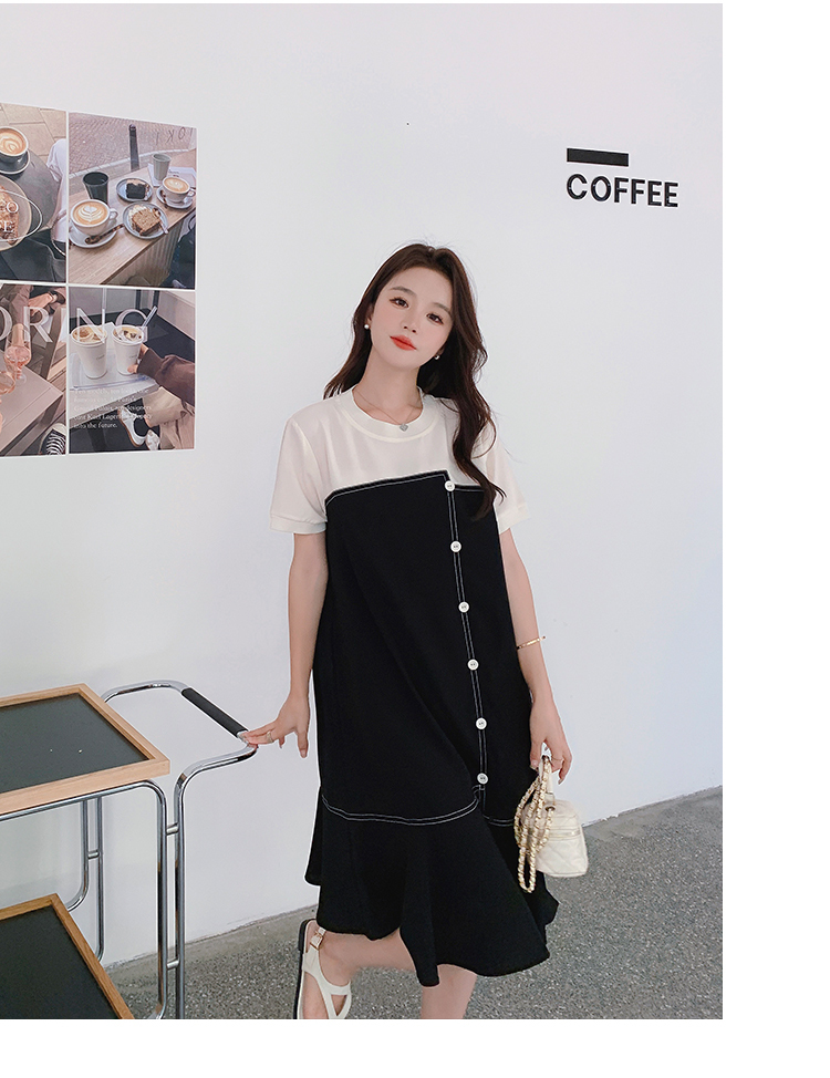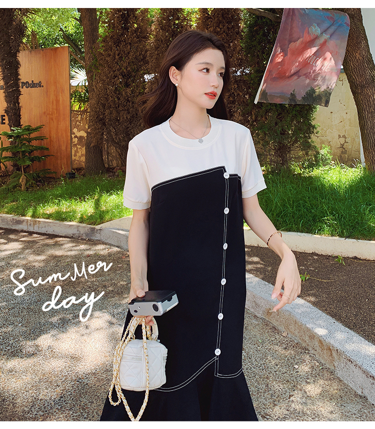 獨家訂製│韓系甜美感撞色拼接單排釦魚尾連衣裙(06H3933)
