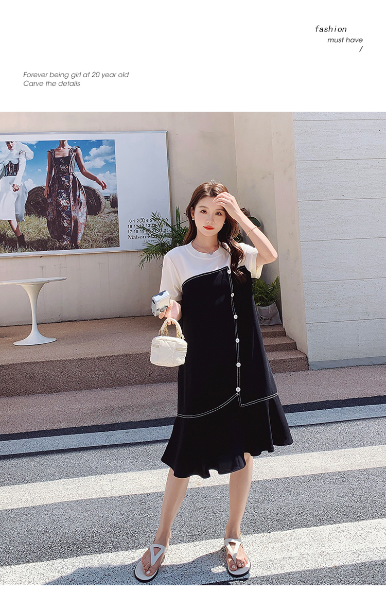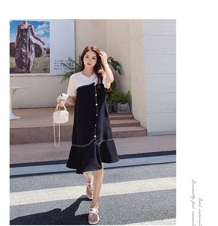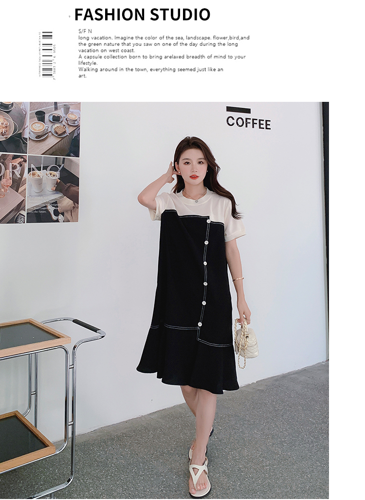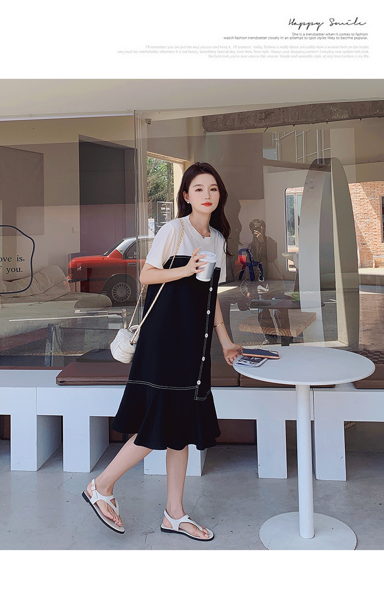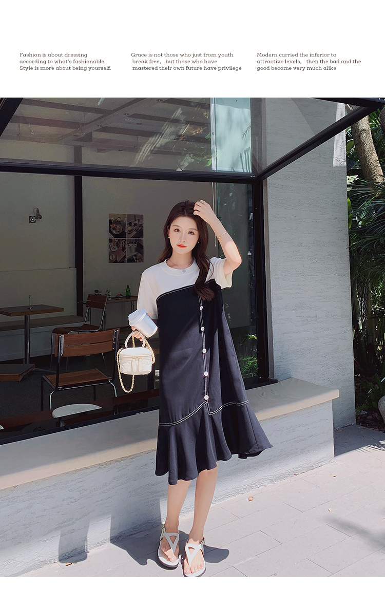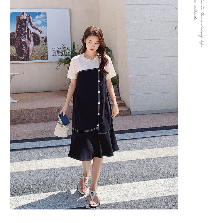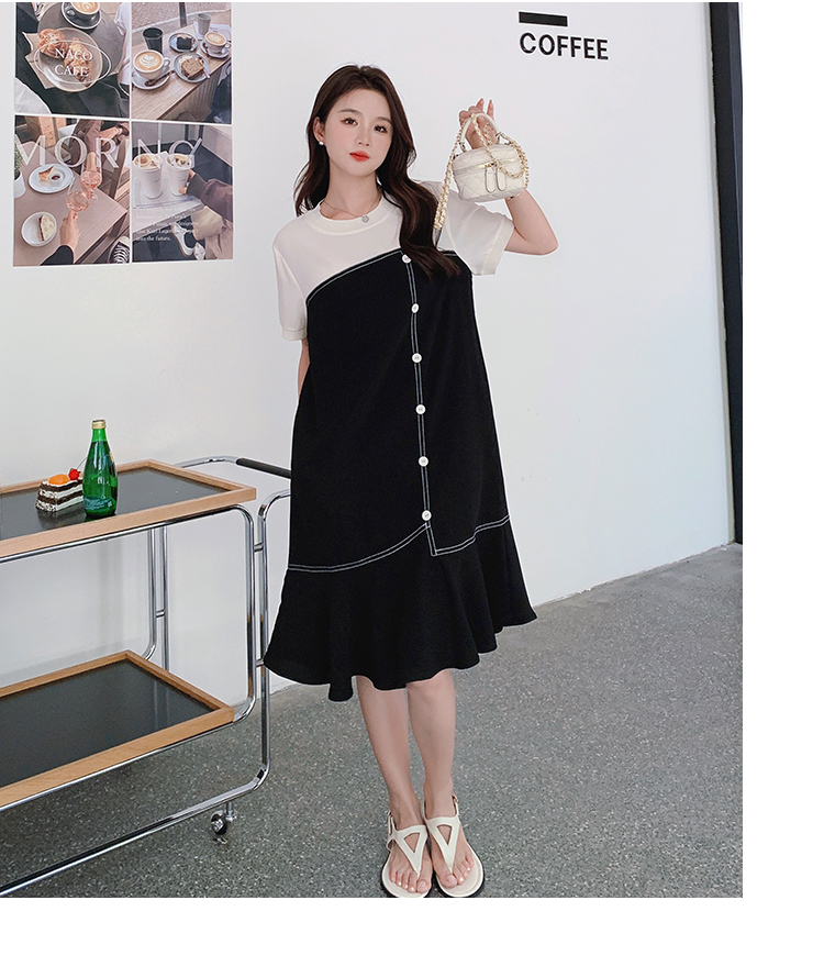 獨家訂製│韓系甜美感撞色拼接單排釦魚尾連衣裙(06H3933)