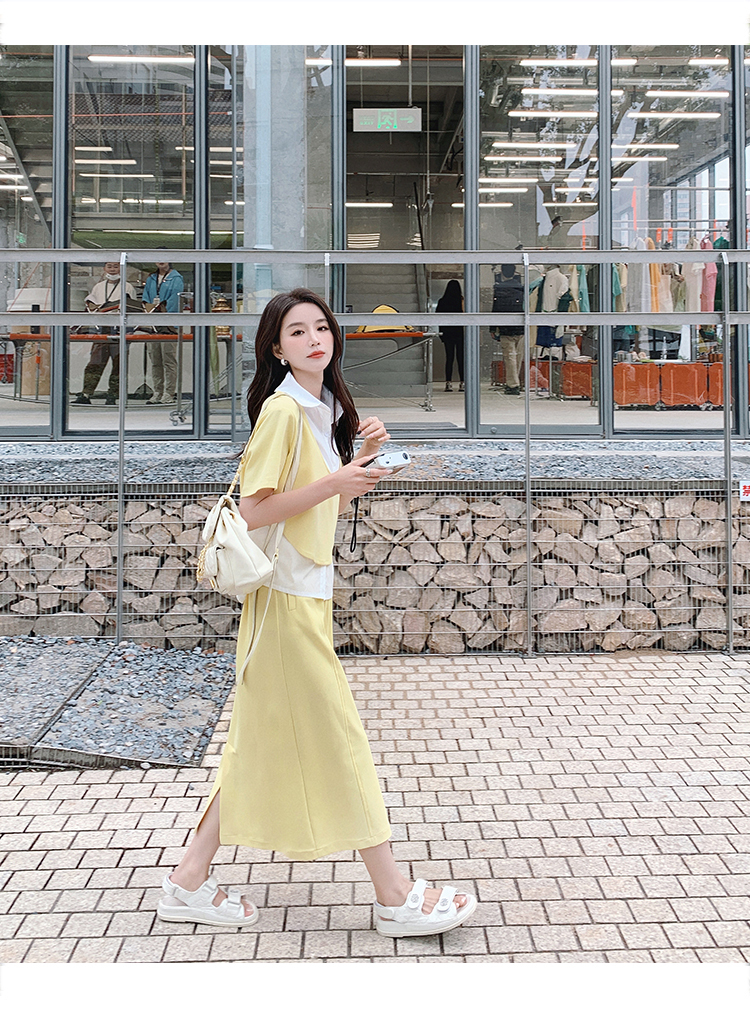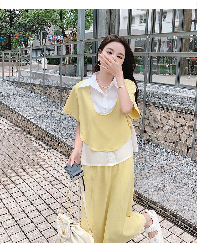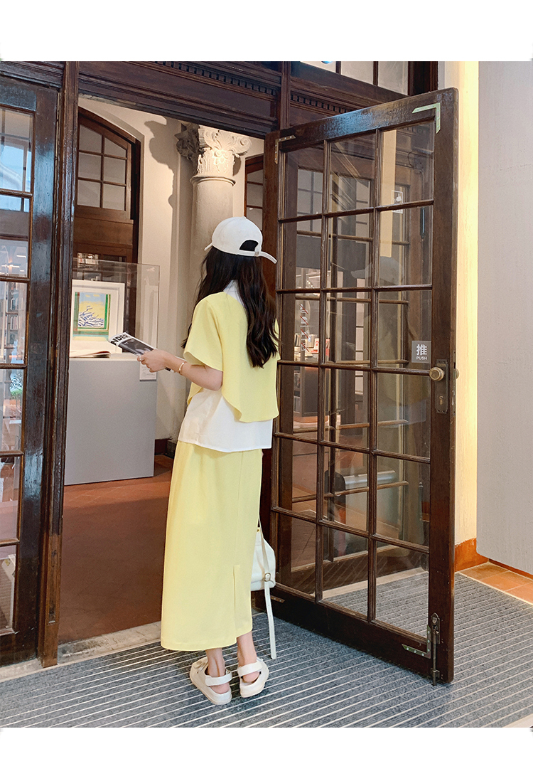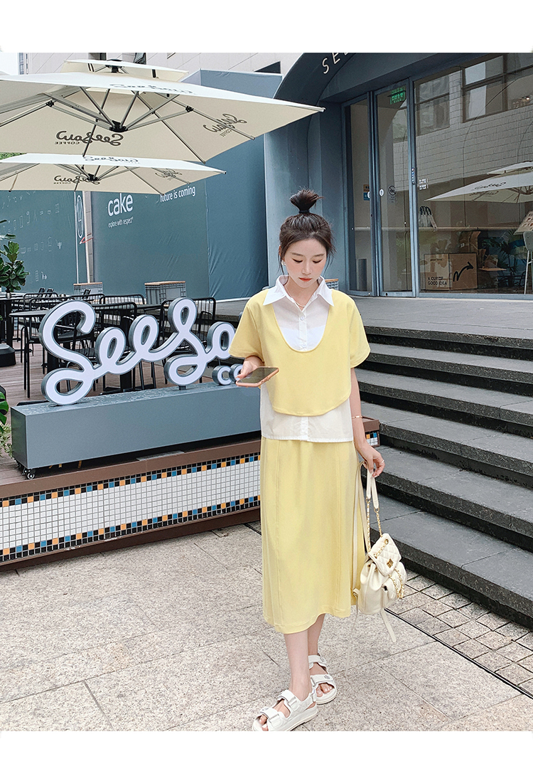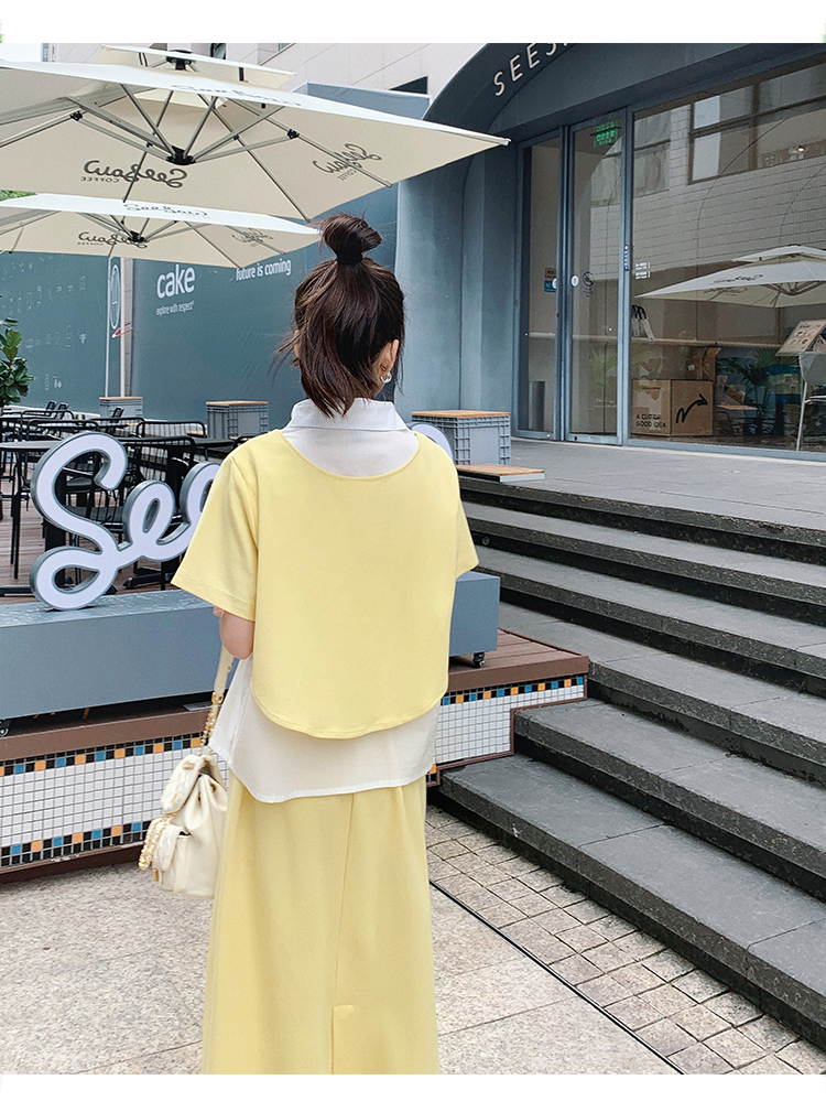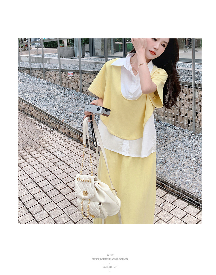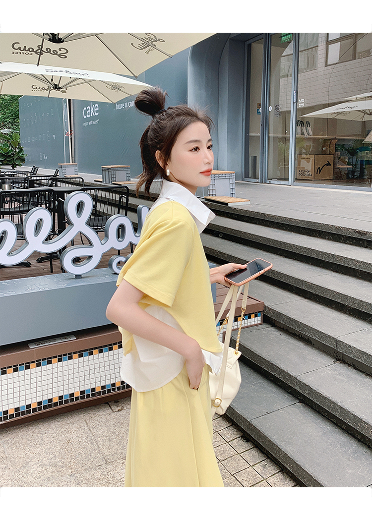 獨家訂製│韓系颯姊風假兩件式上衣+A字裙兩件式套裝組(06H3957)