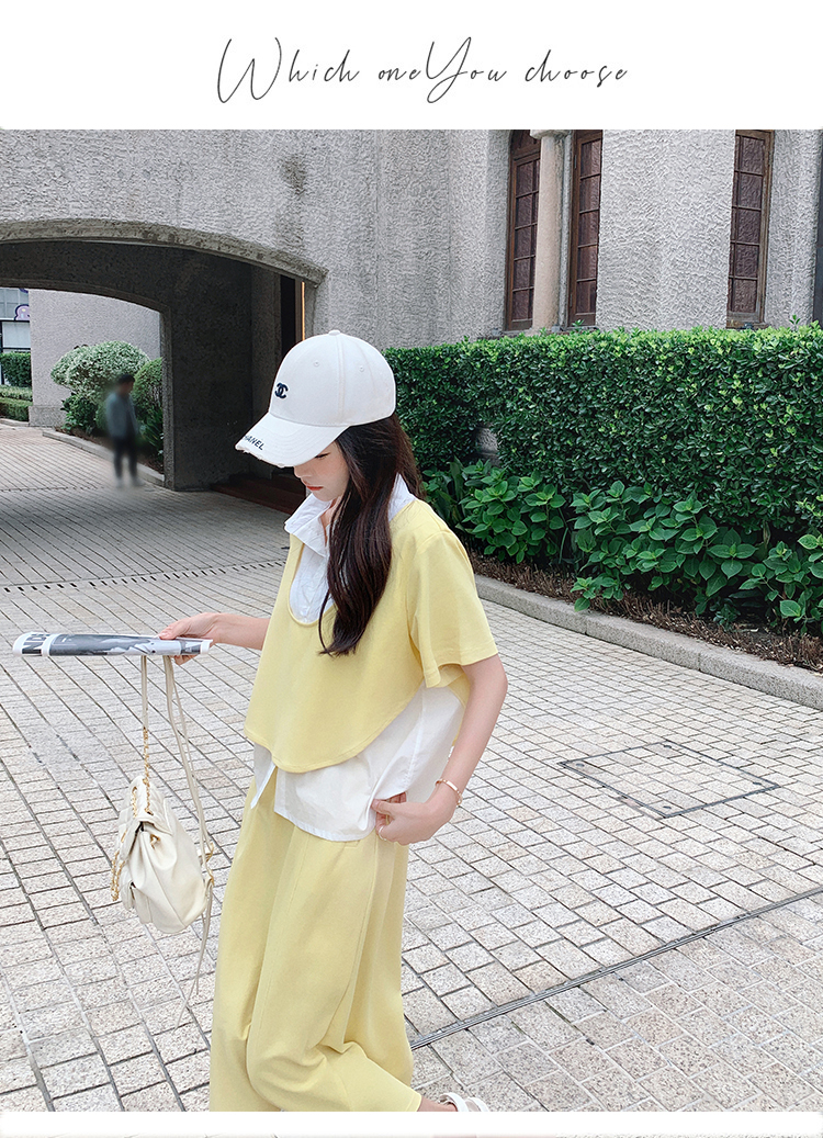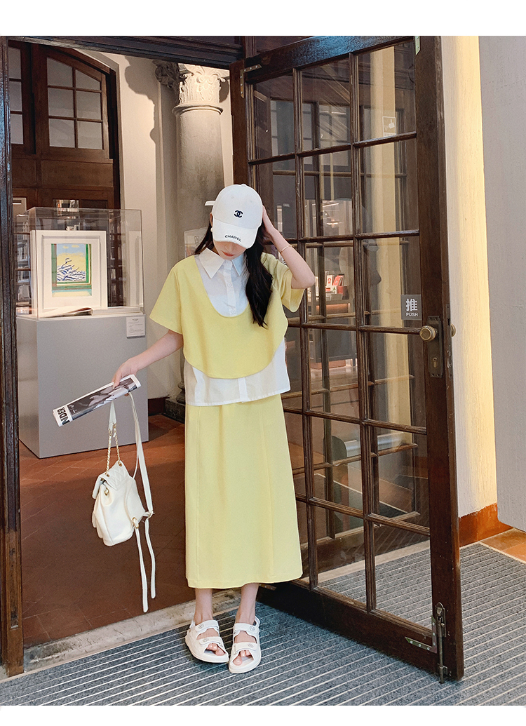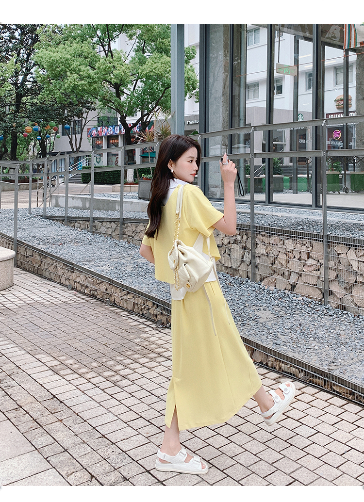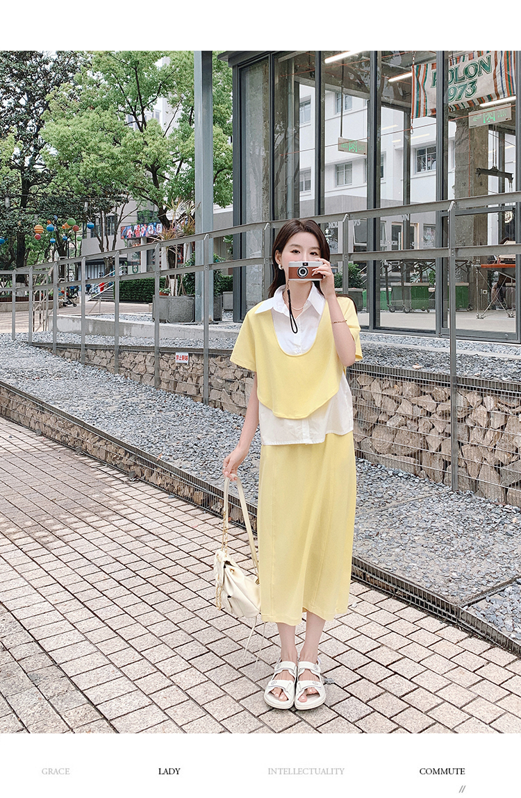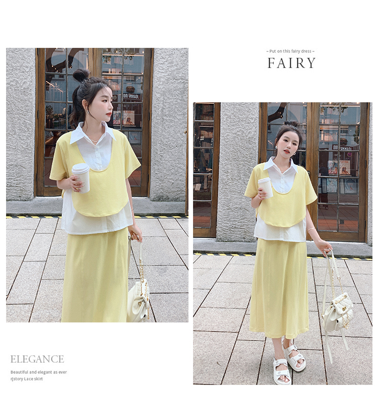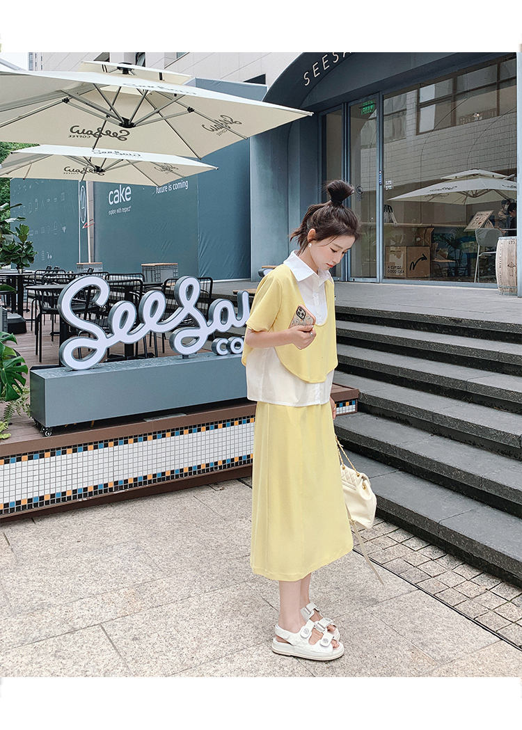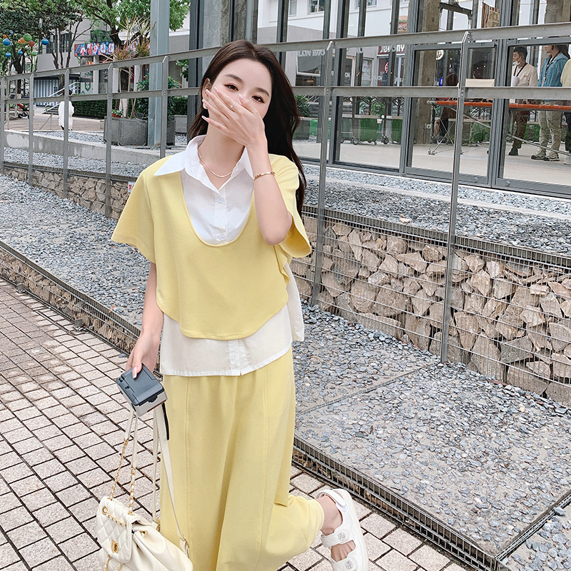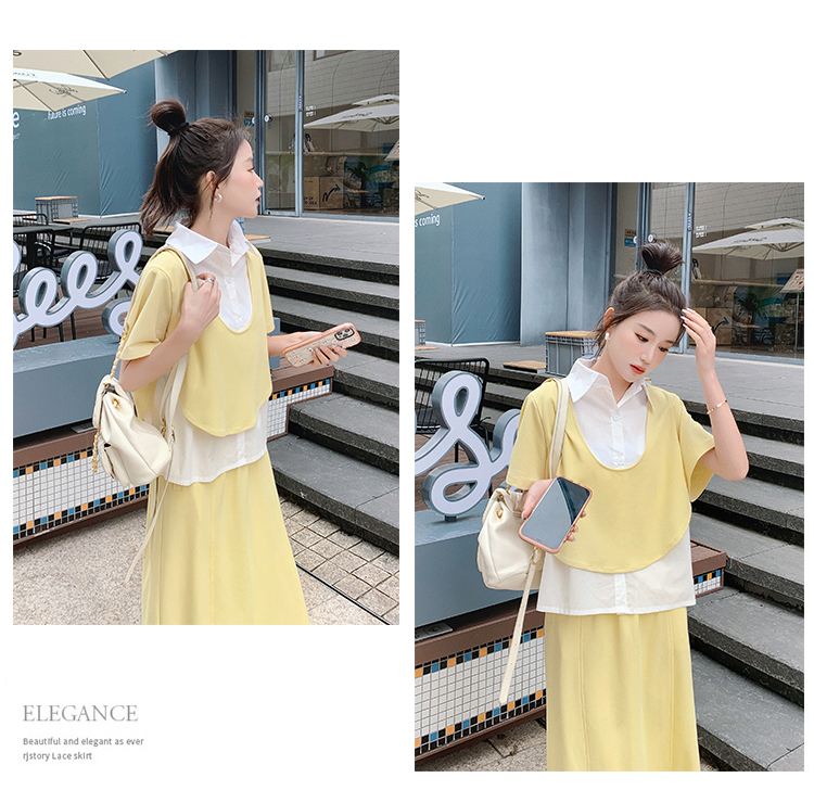 獨家訂製│韓系颯姊風假兩件式上衣+A字裙兩件式套裝組(06H3957)