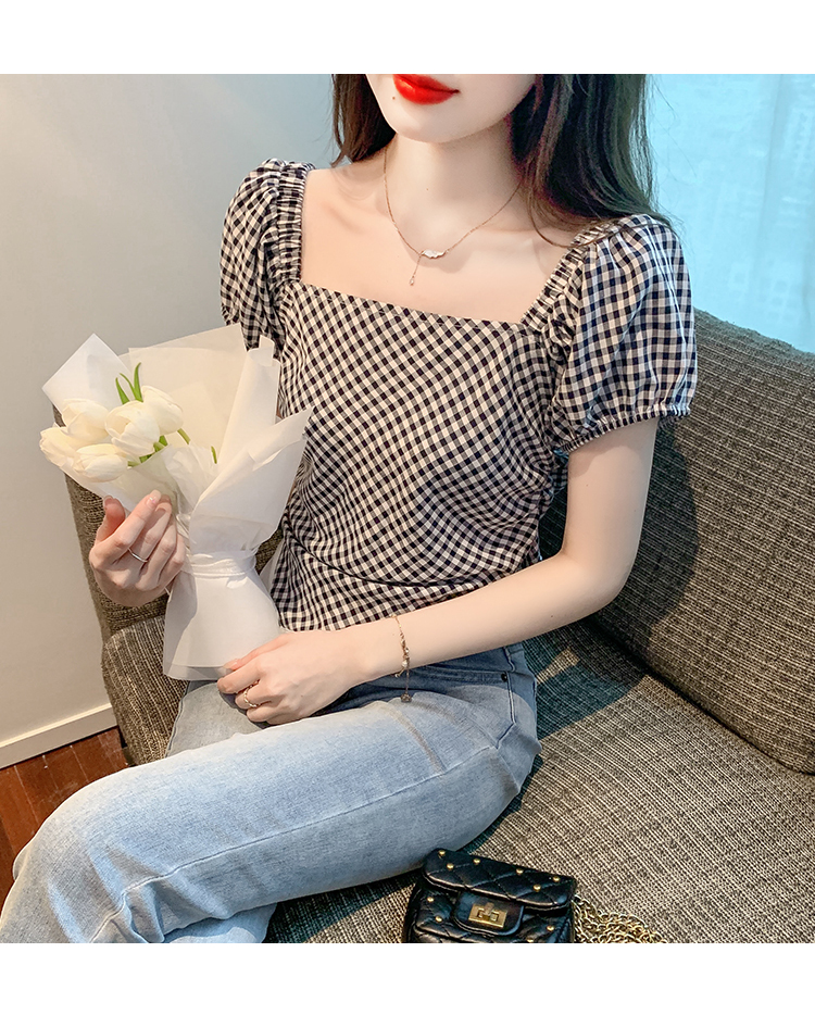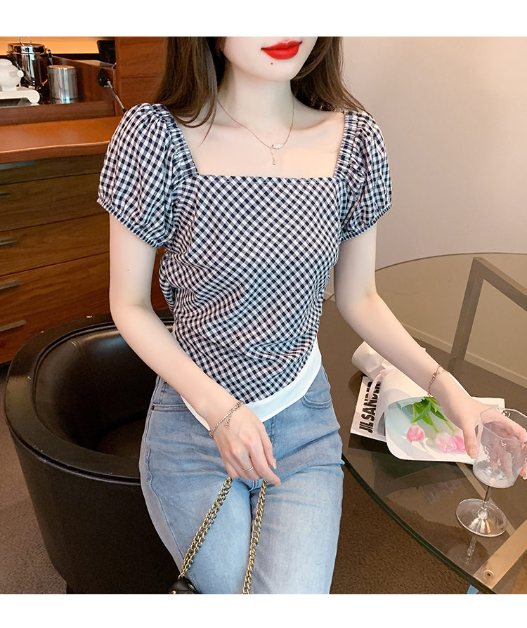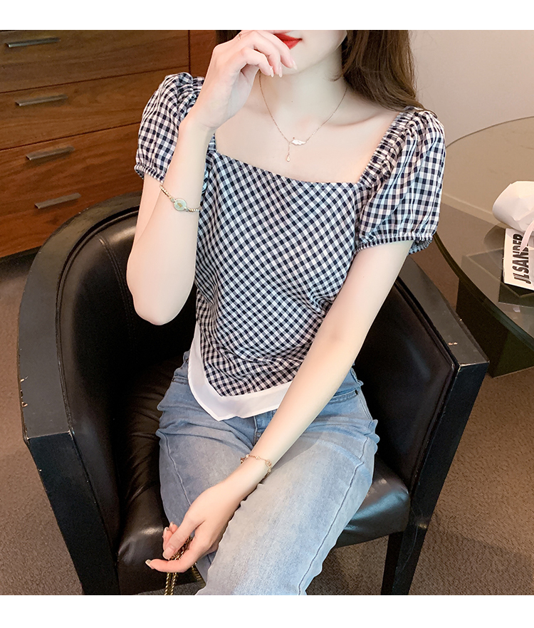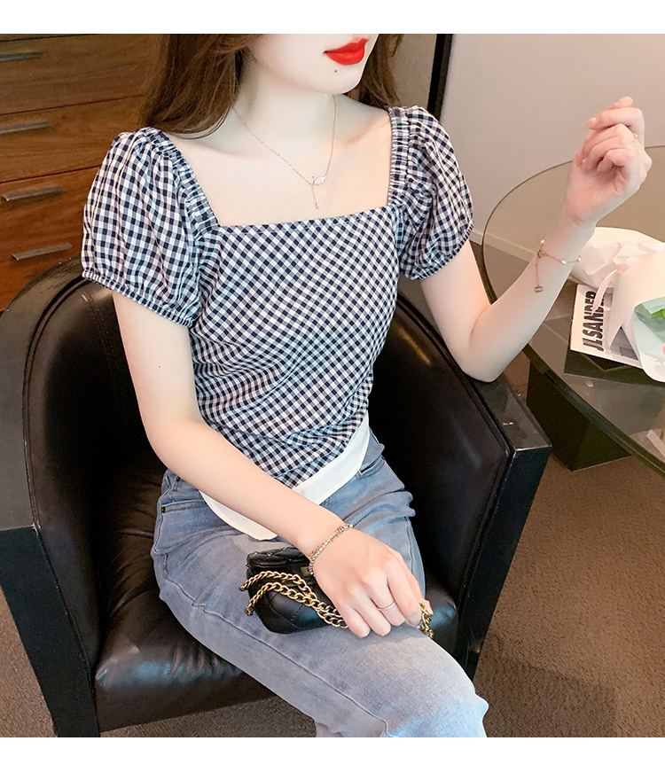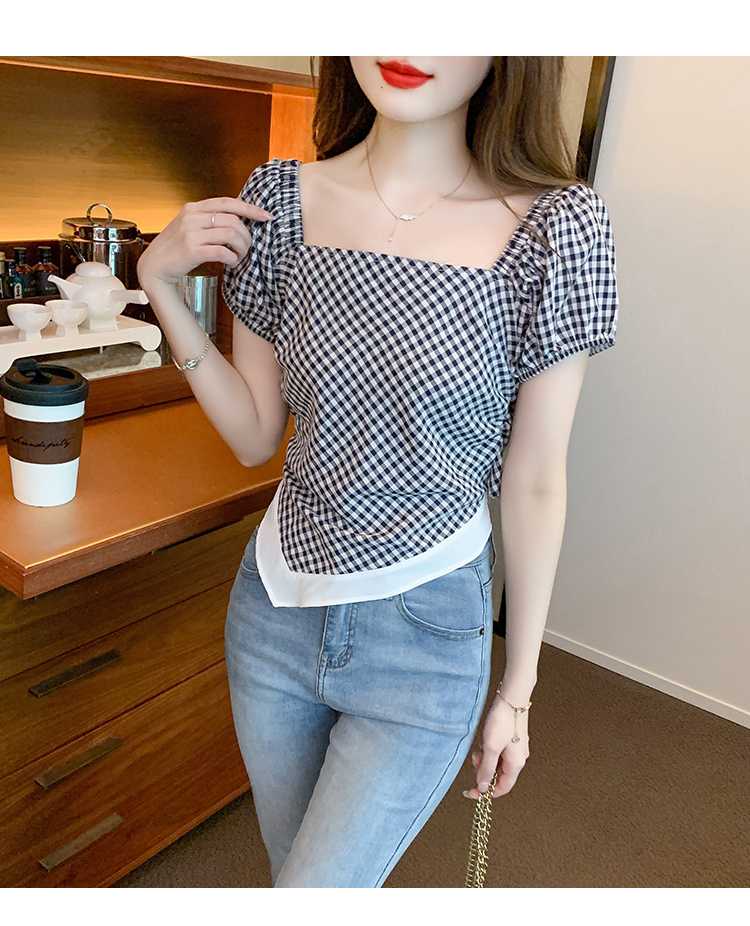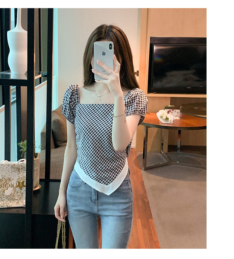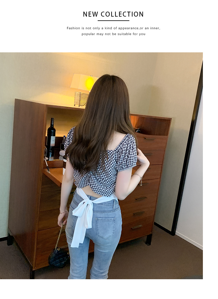 限量特惠|性感方領後背縷空綁帶不規則格紋上衣(06H4068)