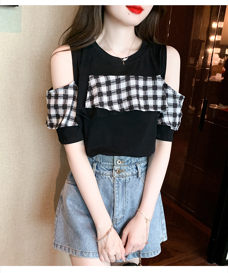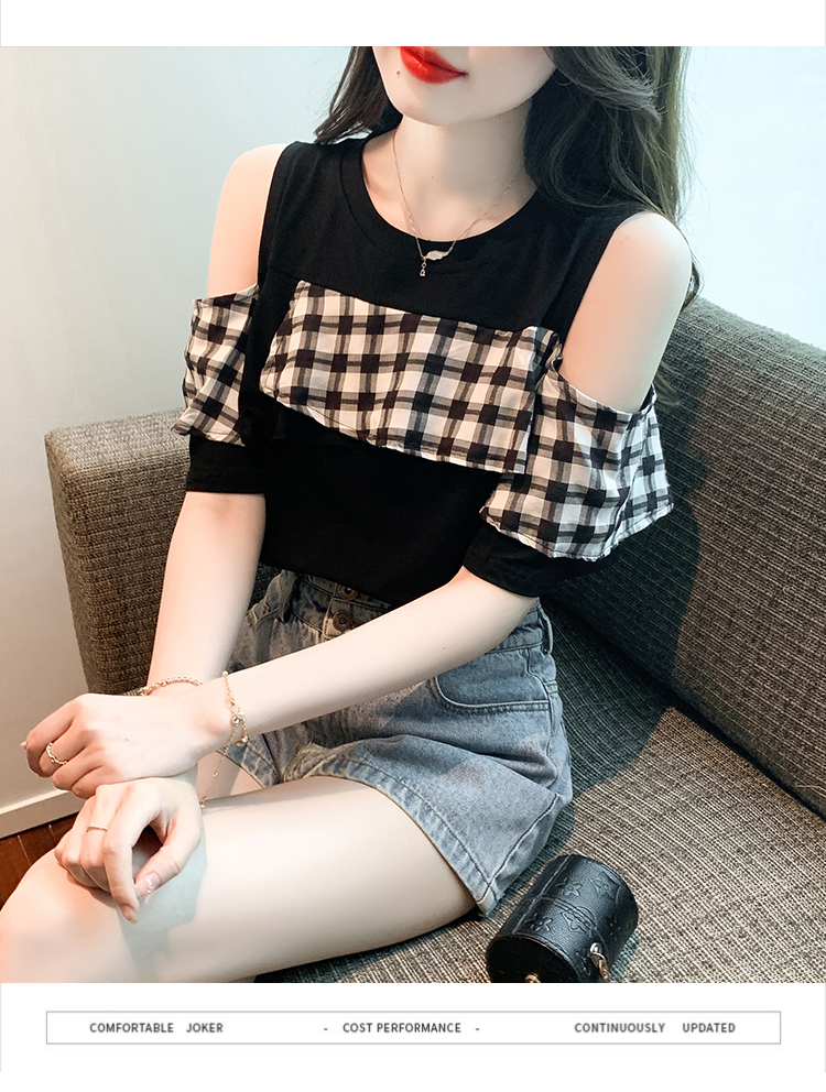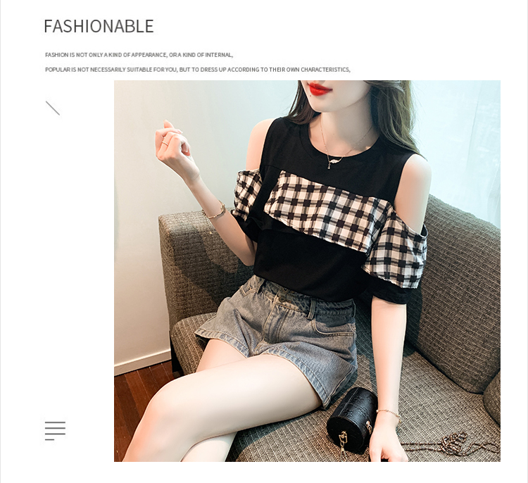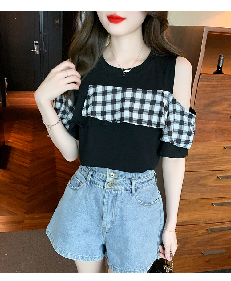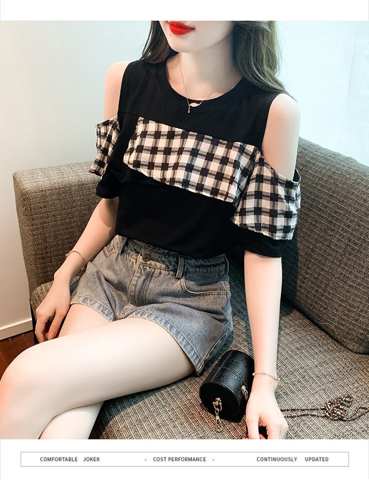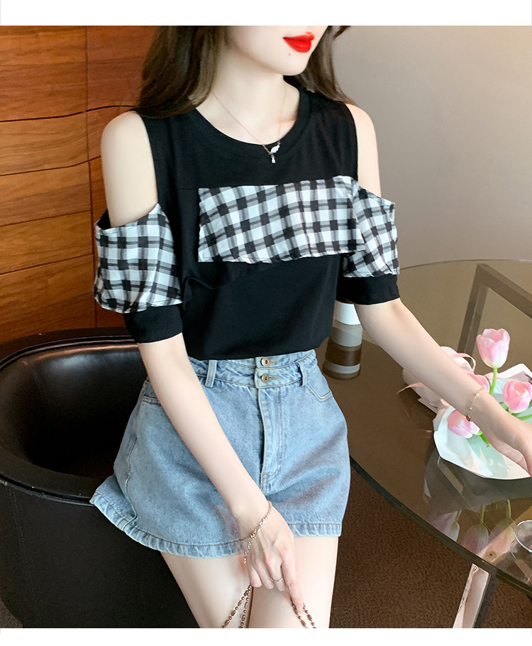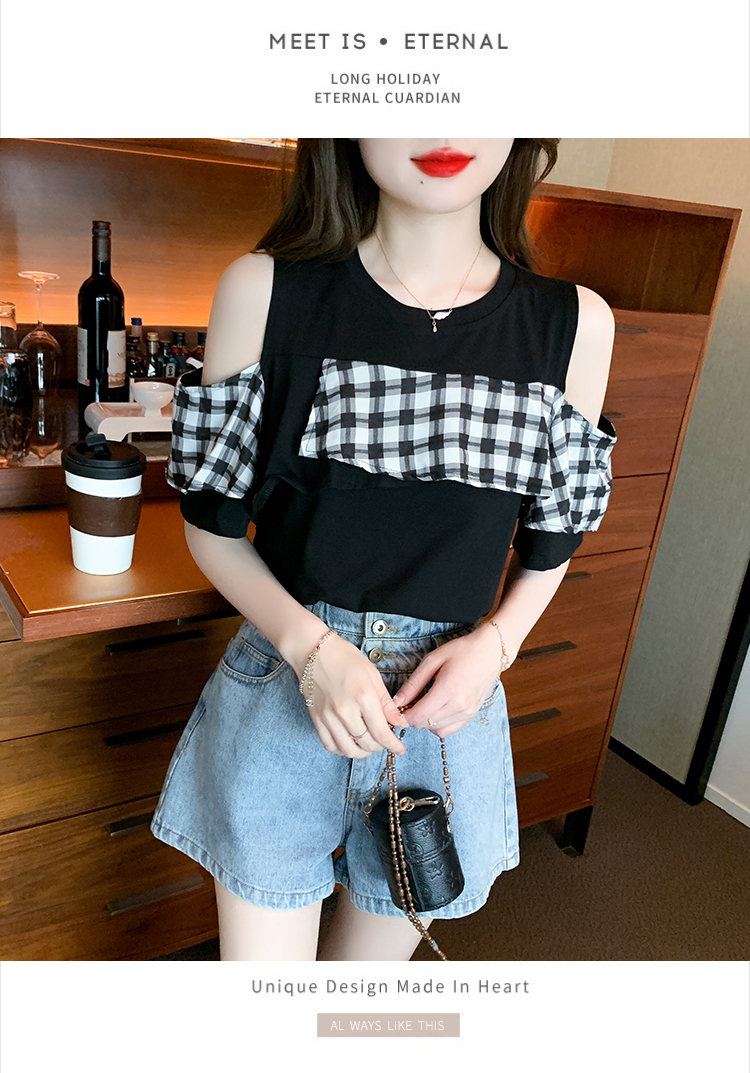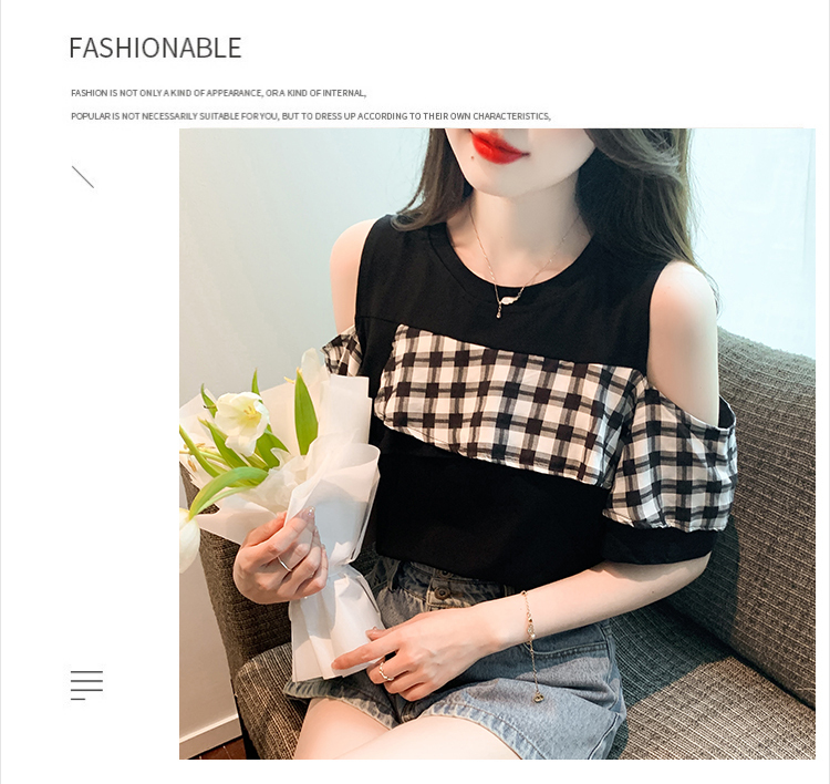 限量特惠|個性微甜拼接格紋露肩T恤(06H4101)