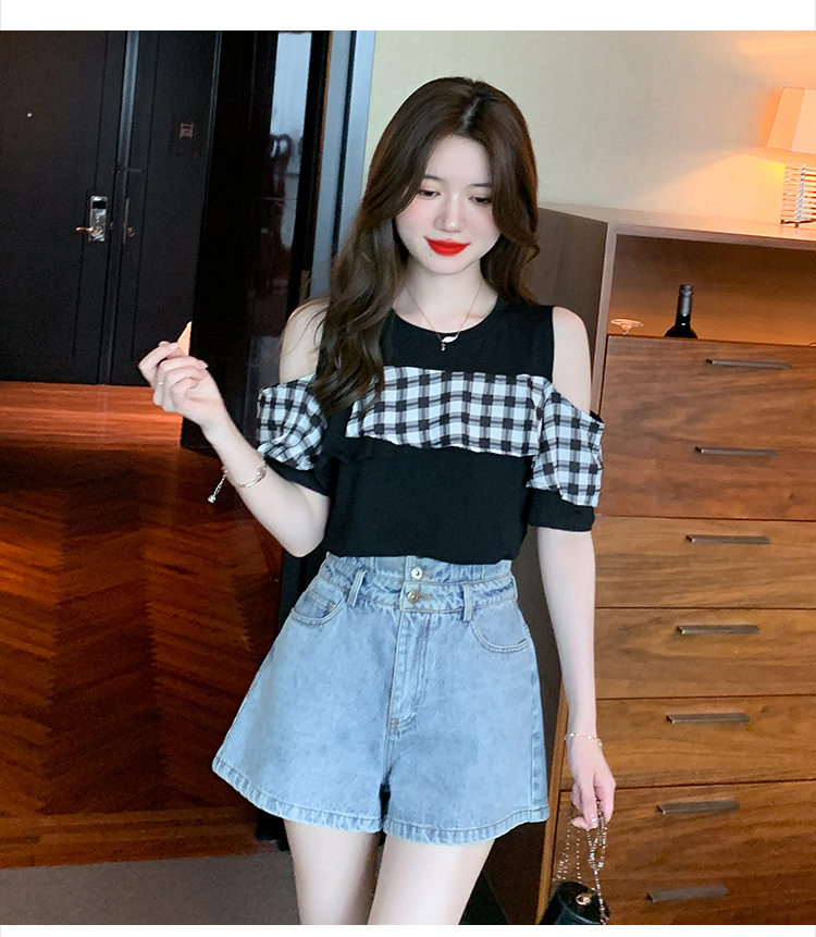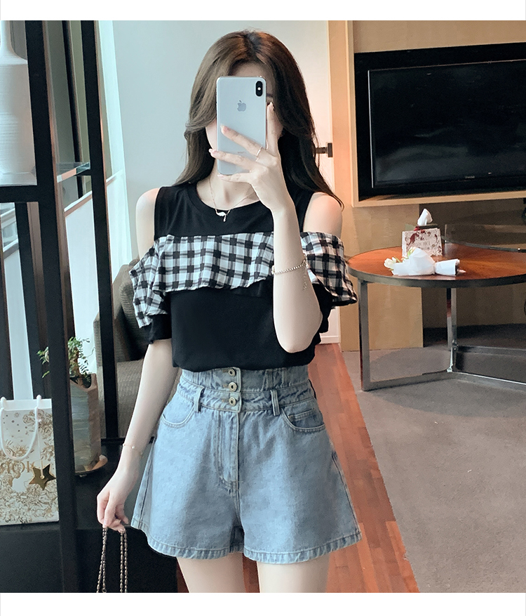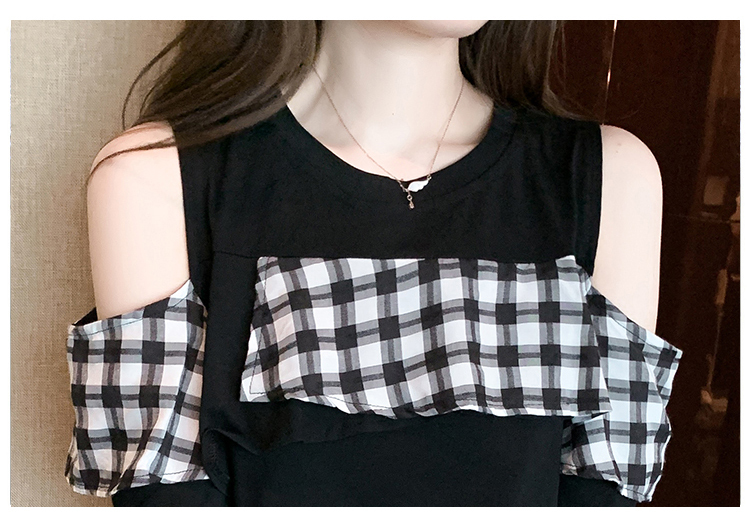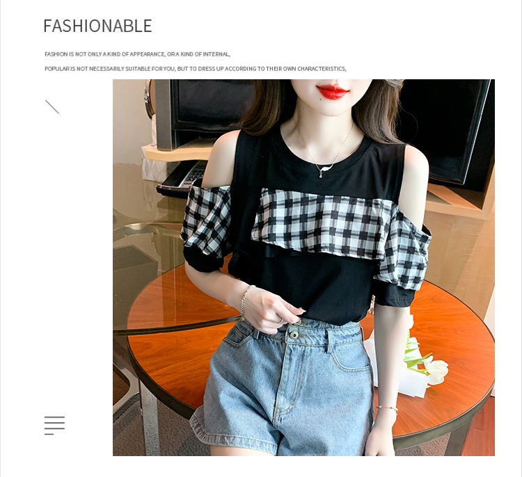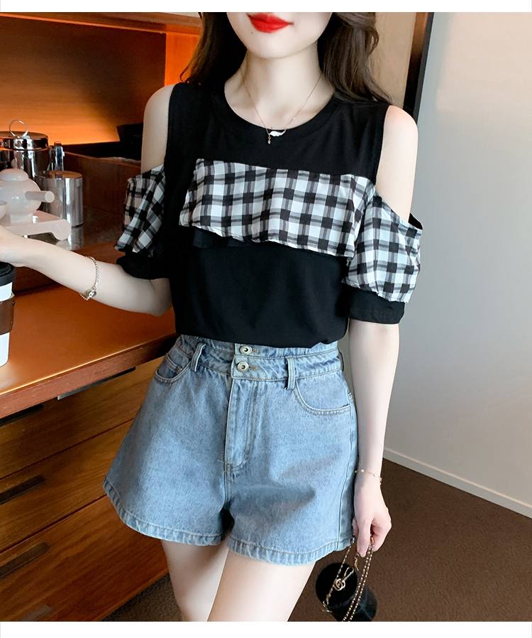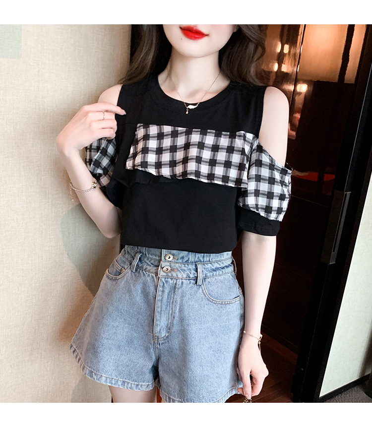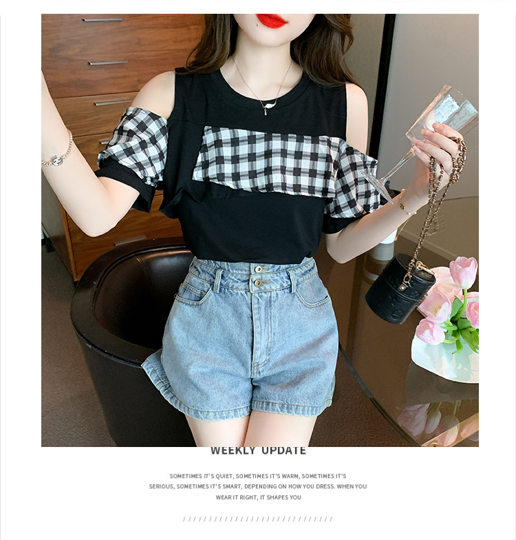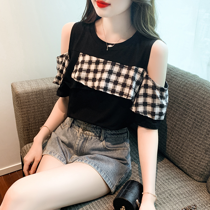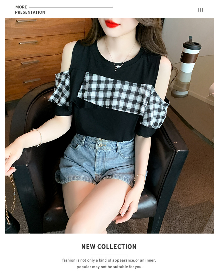 限量特惠|個性微甜拼接格紋露肩T恤(06H4101)