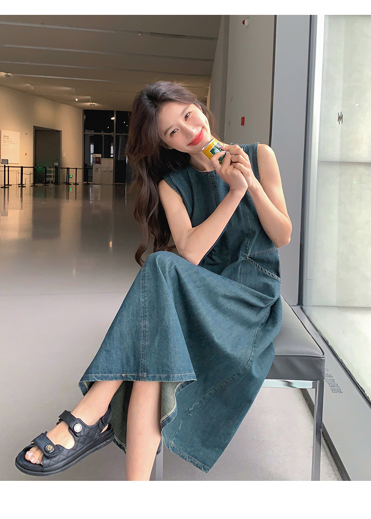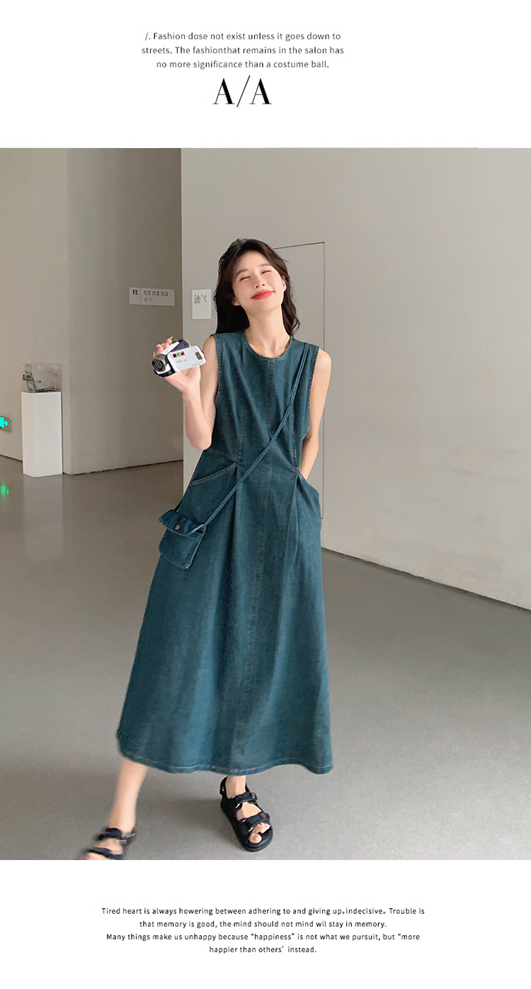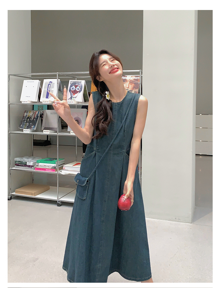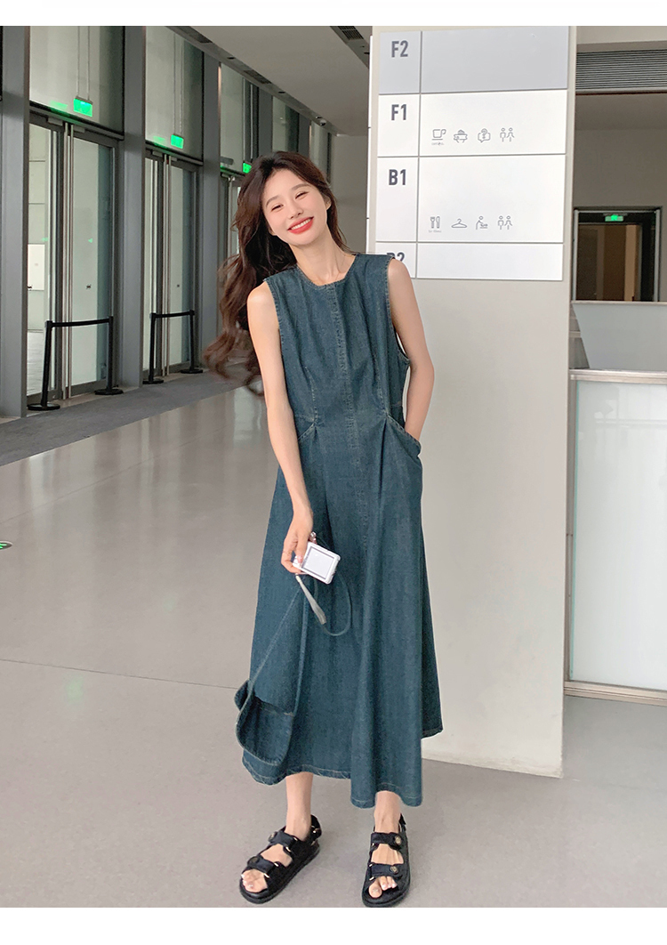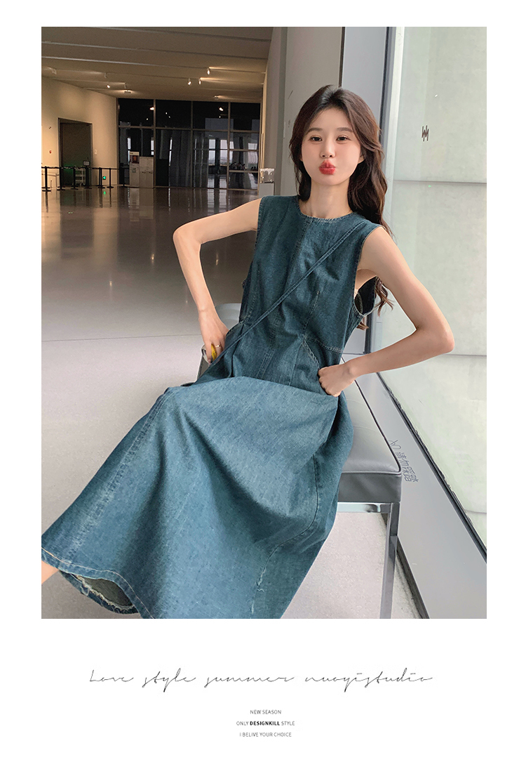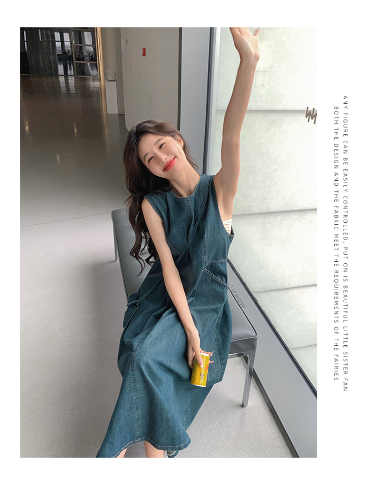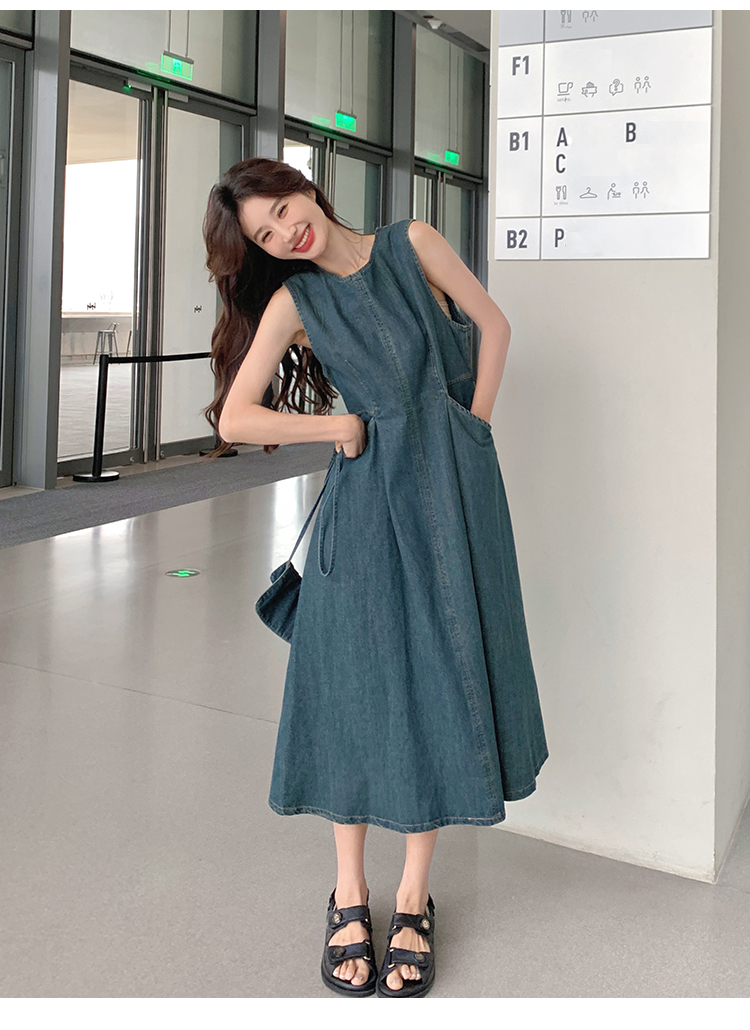 獨家訂製│韓系氣質感收腰抓褶牛仔連衣裙(06H6423)