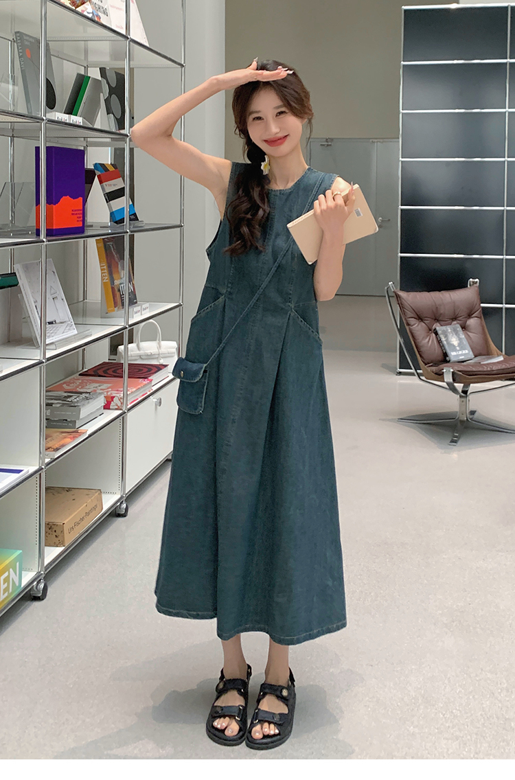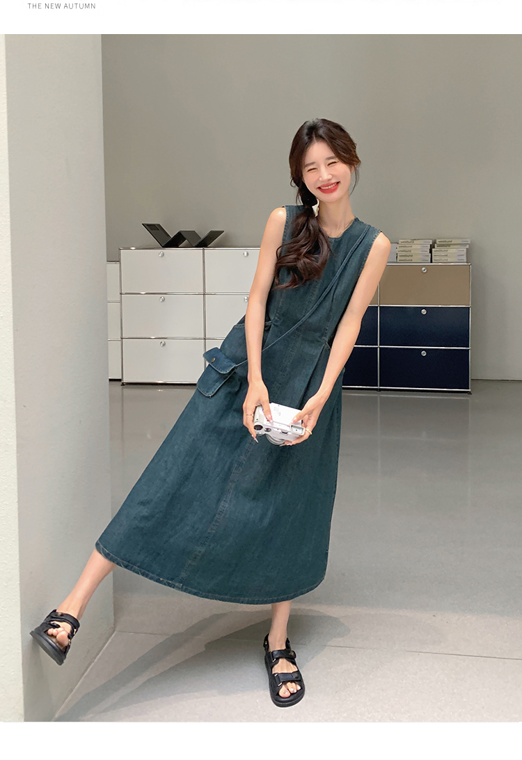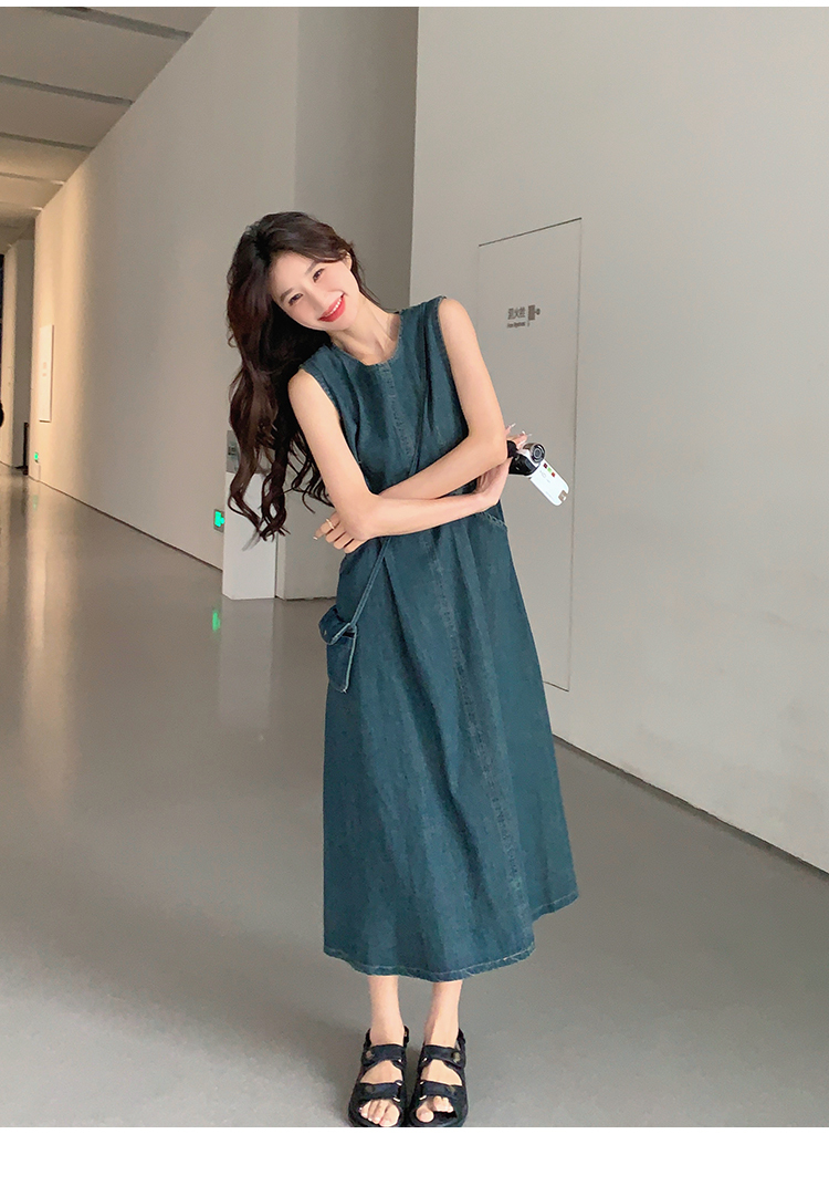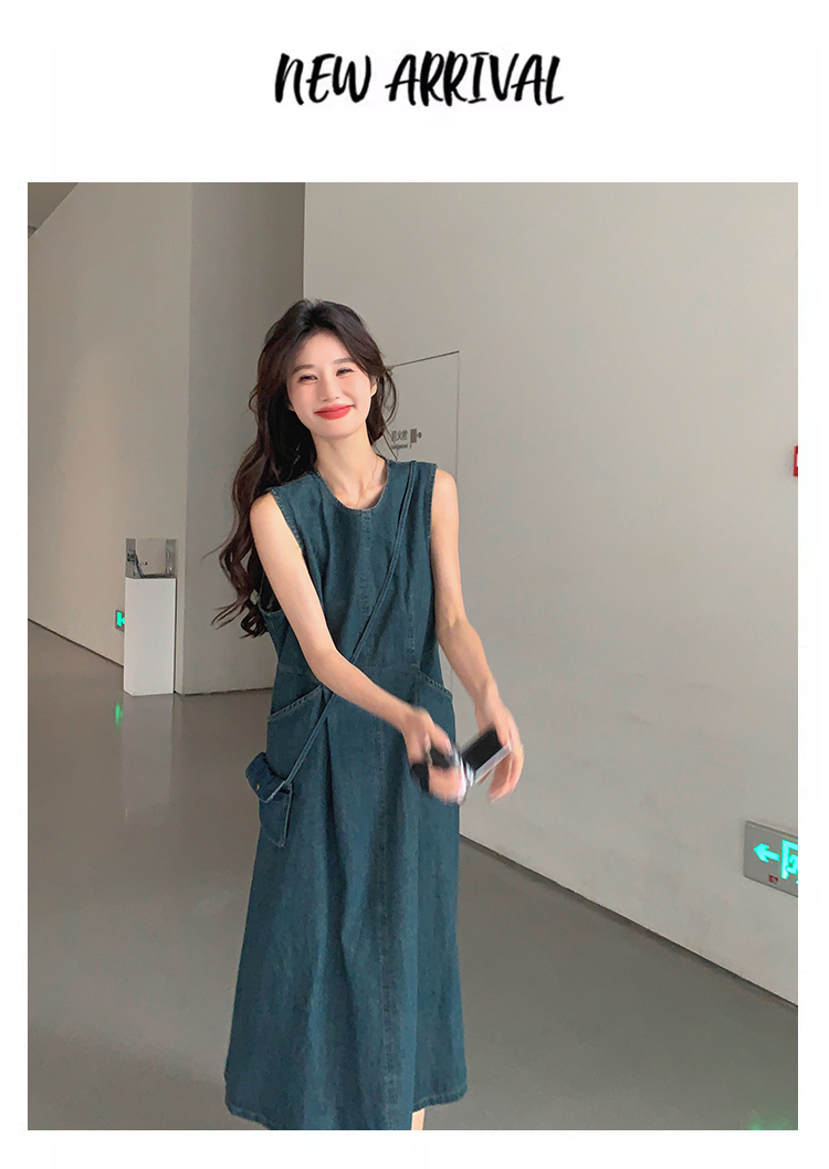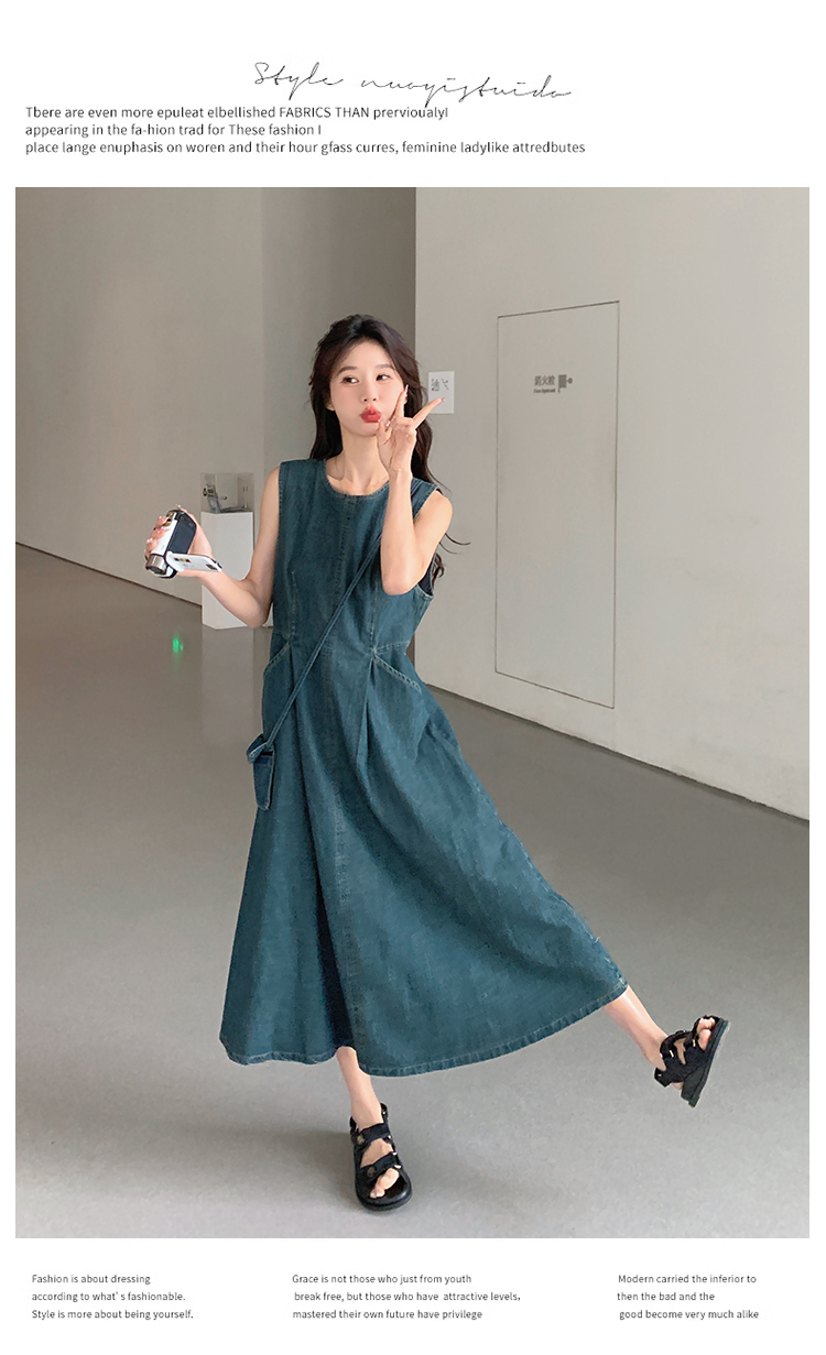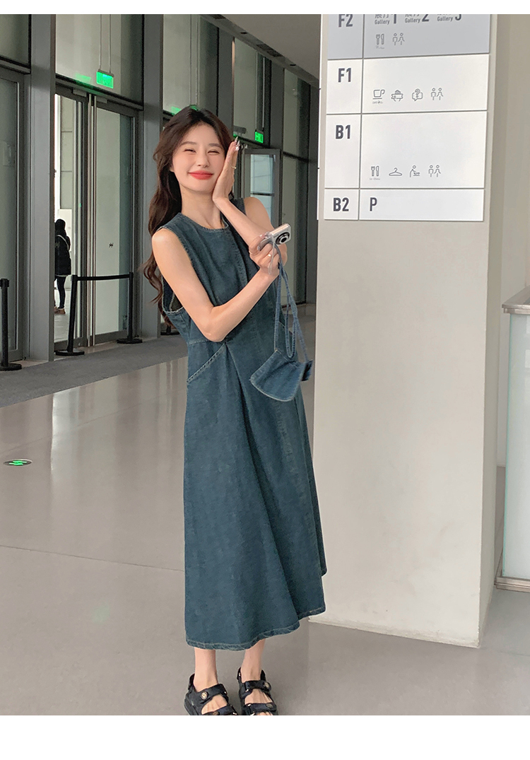 獨家訂製│韓系氣質感收腰抓褶牛仔連衣裙(06H6423)