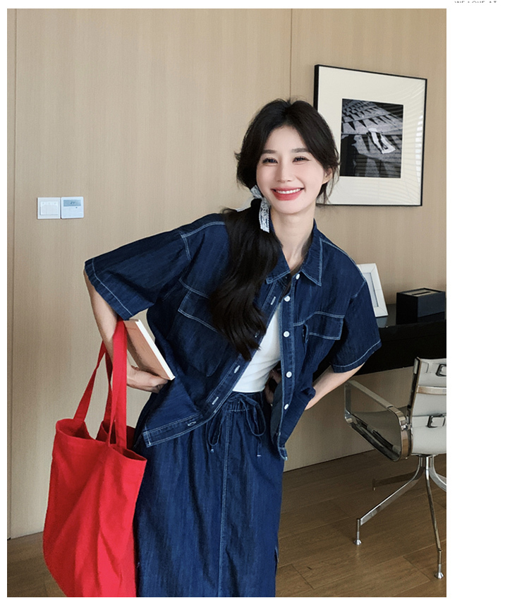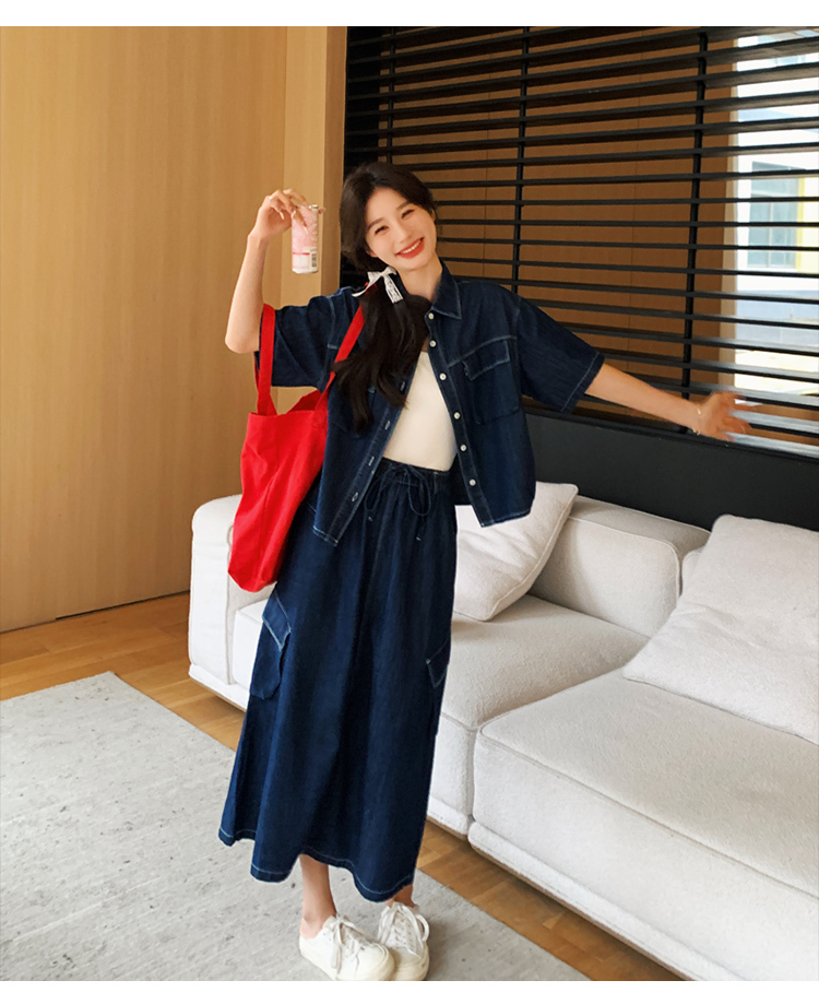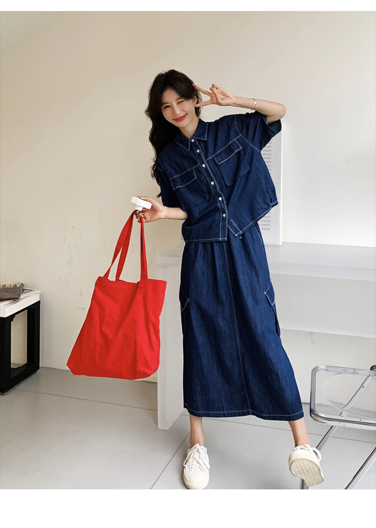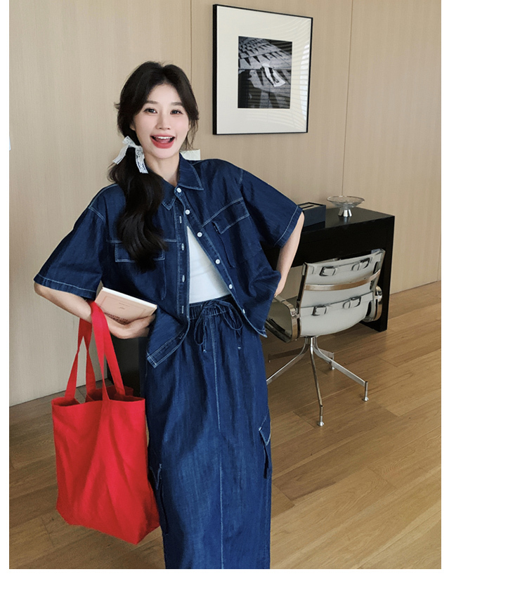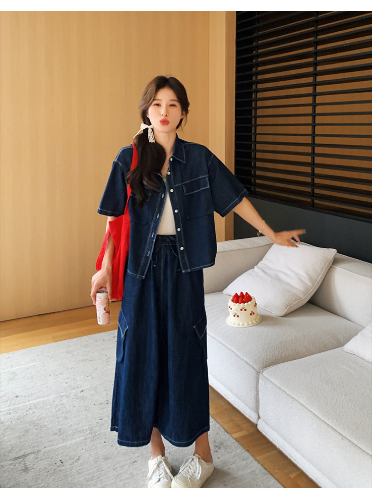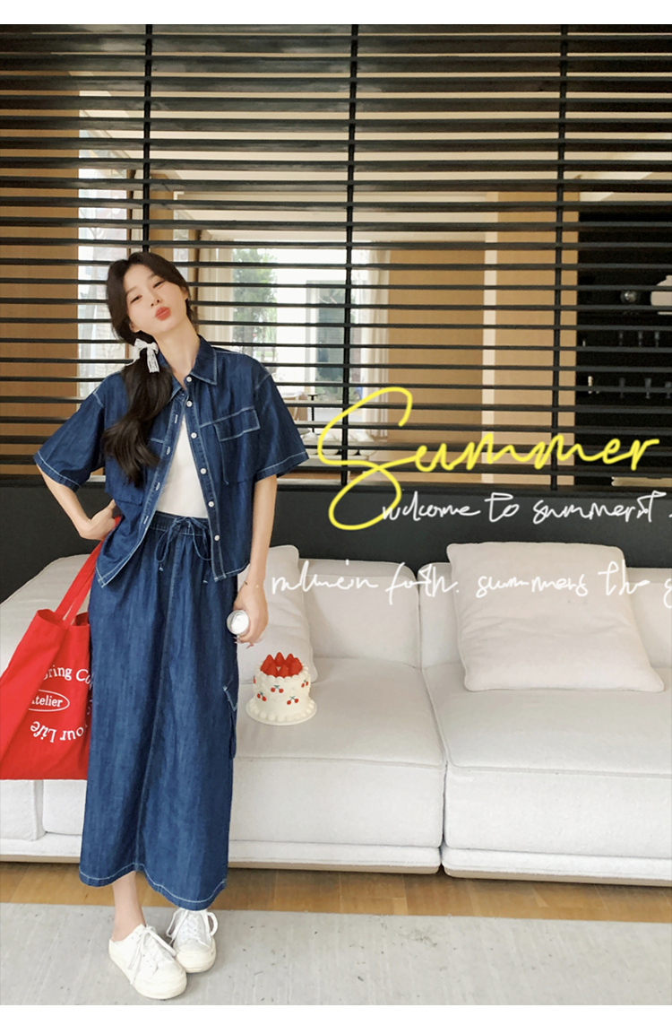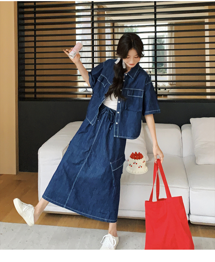 獨家訂製│韓系半糖感明線牛仔襯衫+抽繩A字長裙兩件式套裝組(06H6473)