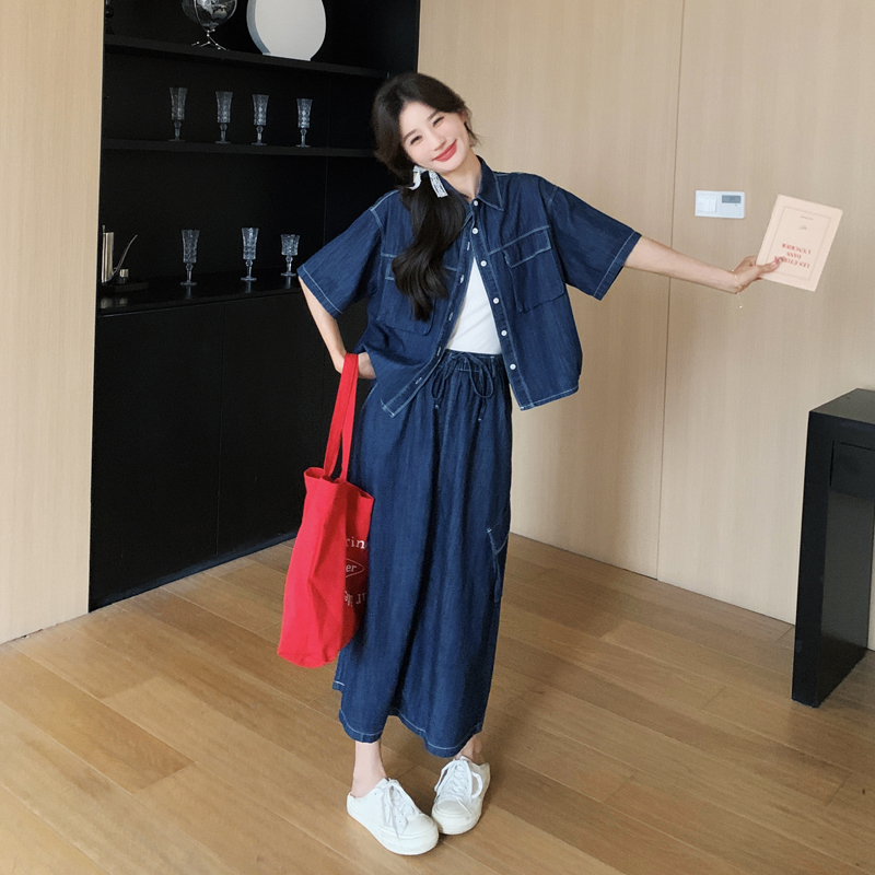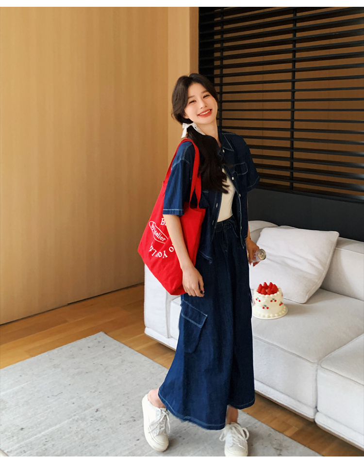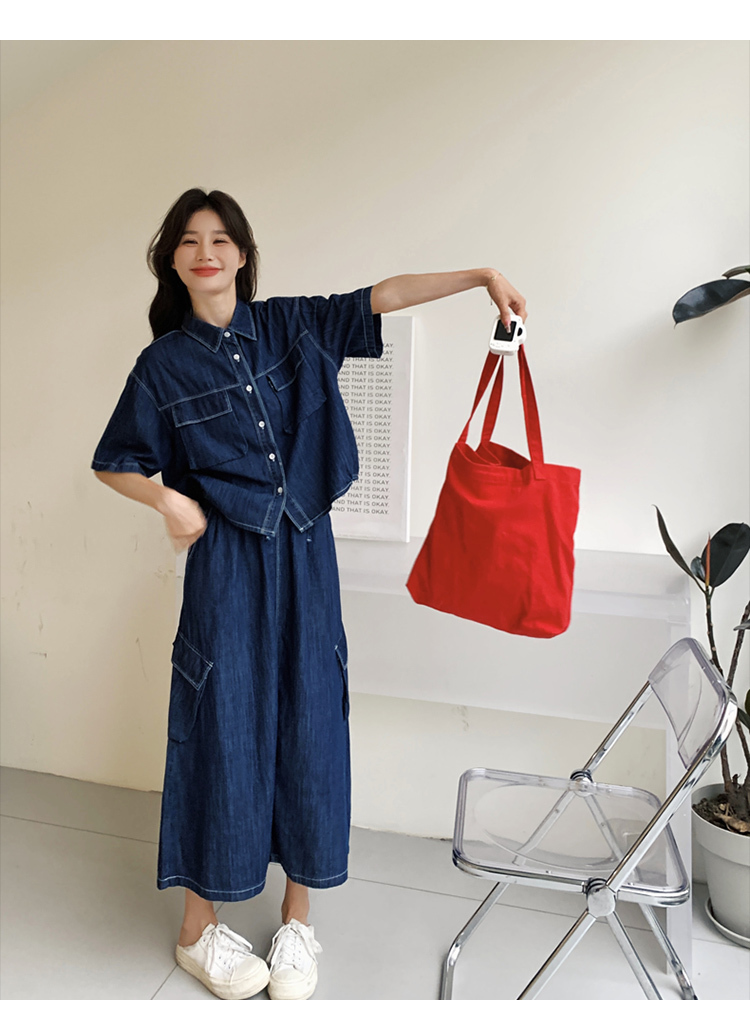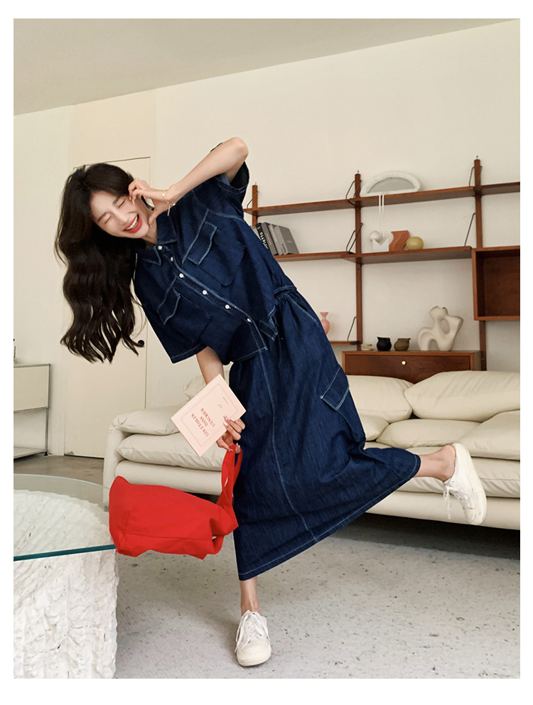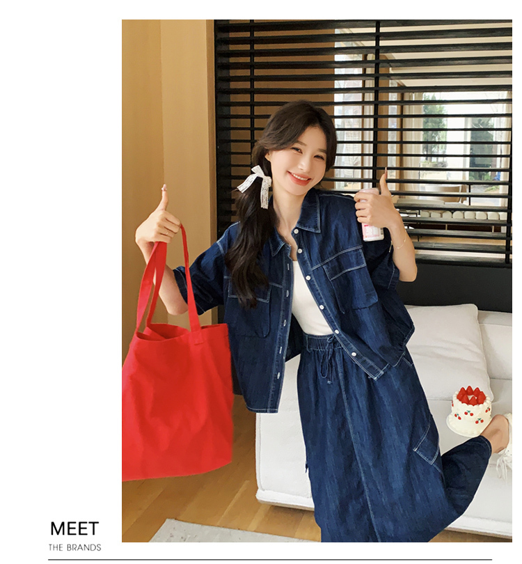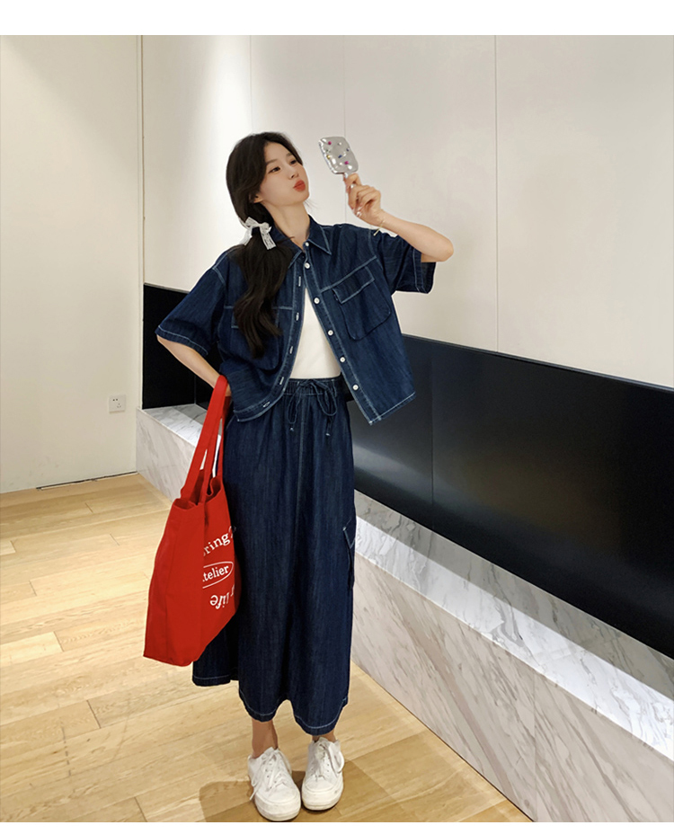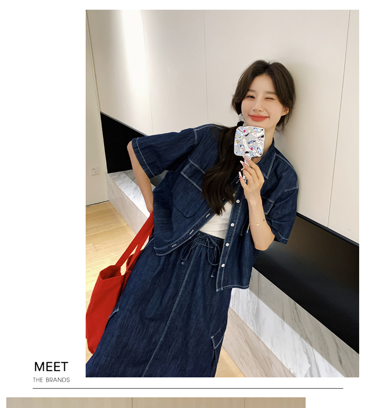 獨家訂製│韓系半糖感明線牛仔襯衫+抽繩A字長裙兩件式套裝組(06H6473)
