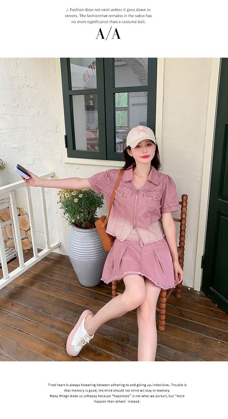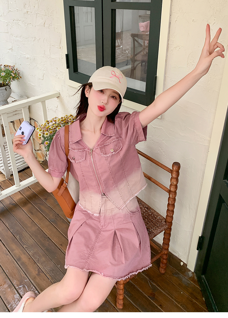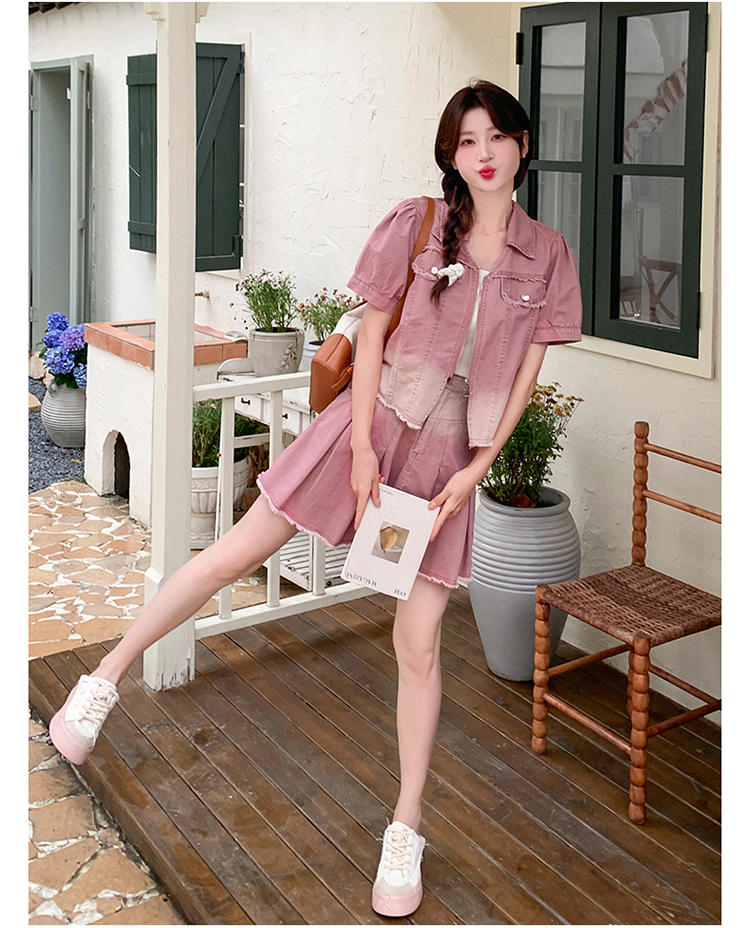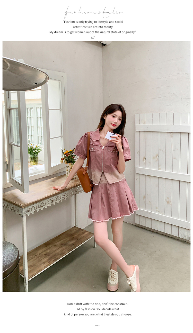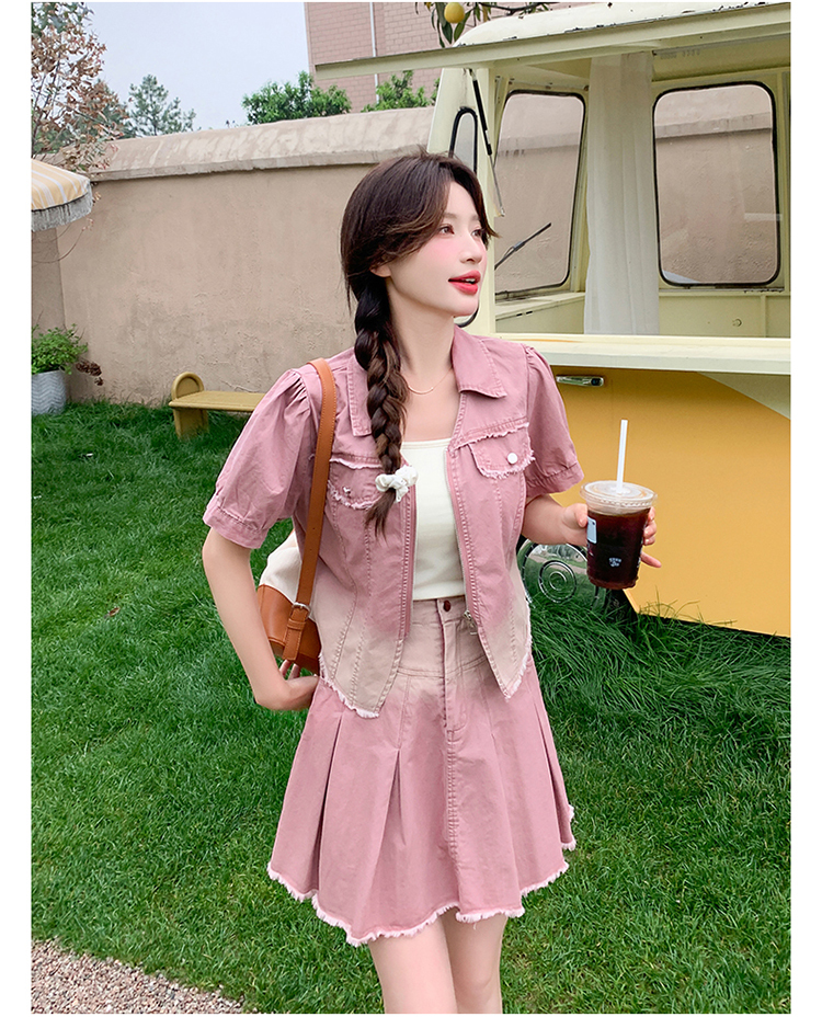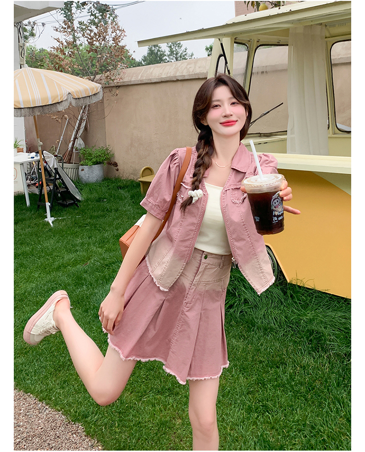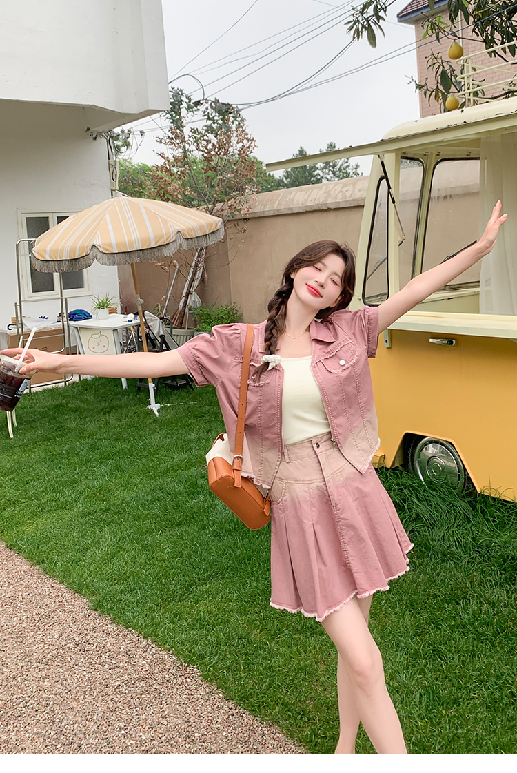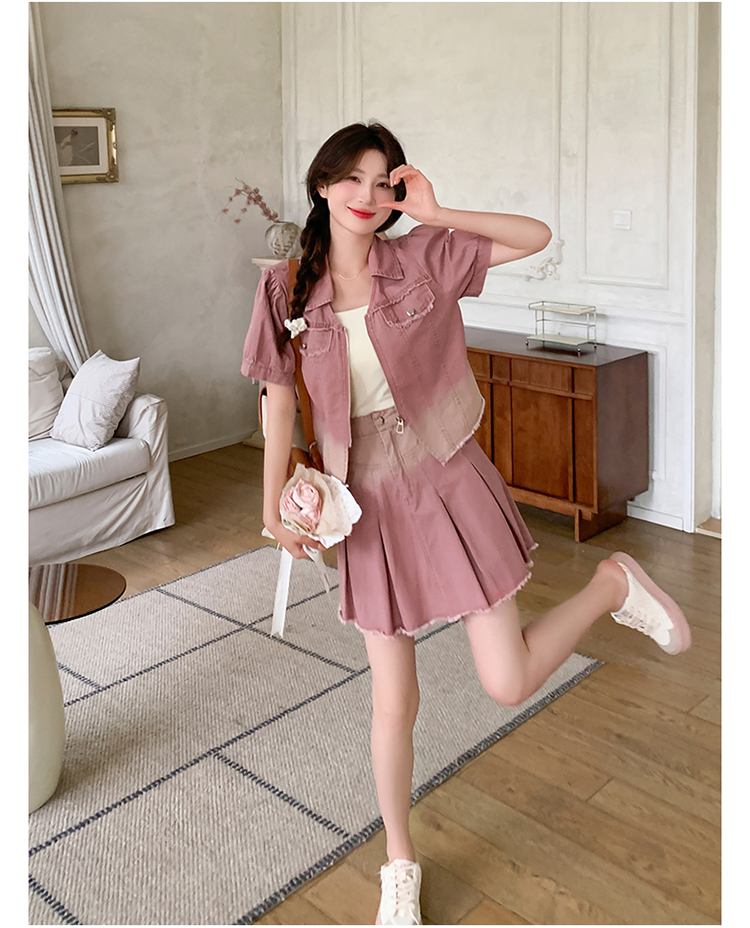 獨家訂製│韓系甜姐兒漸變色牛仔外套+百褶A字裙兩件式套裝組(06H6488)
