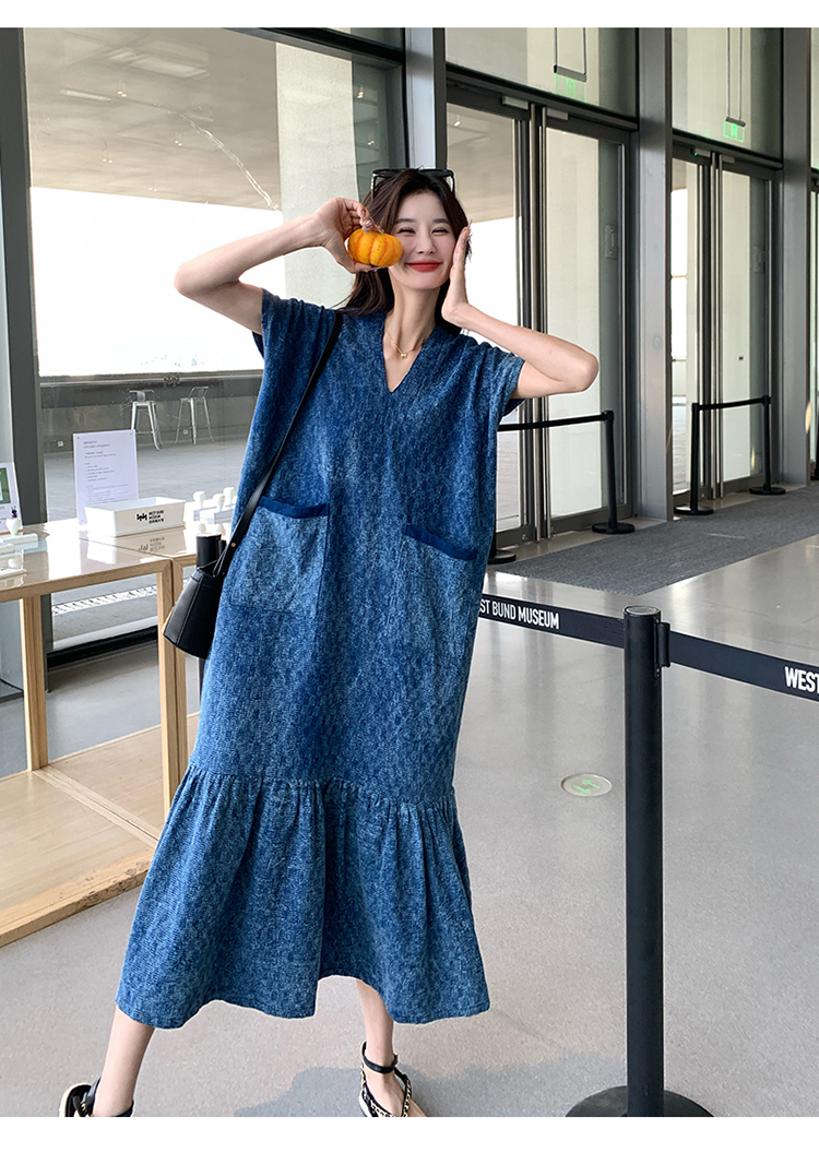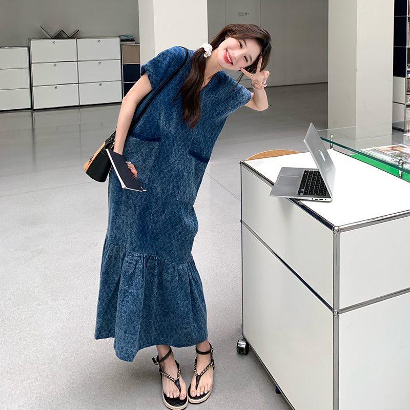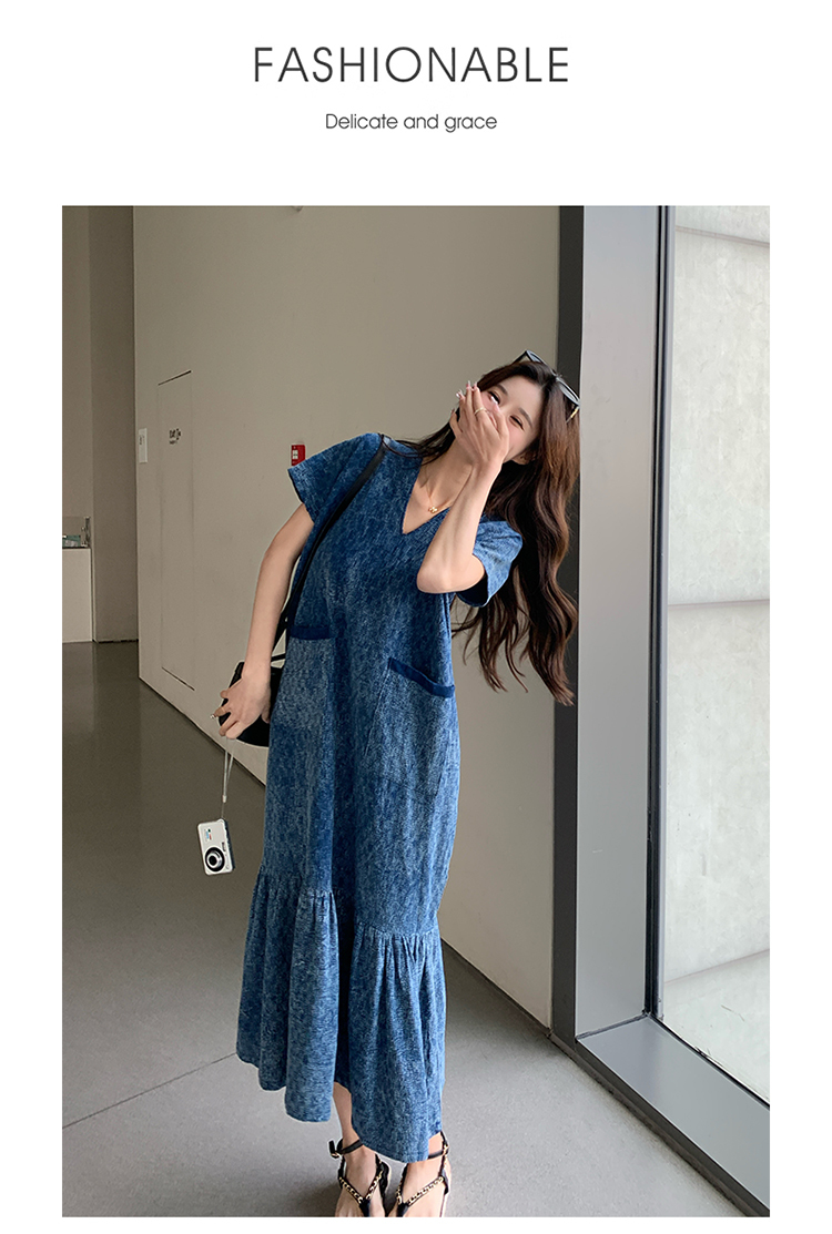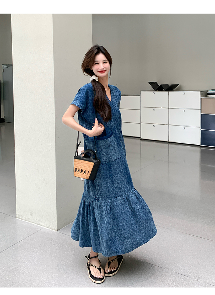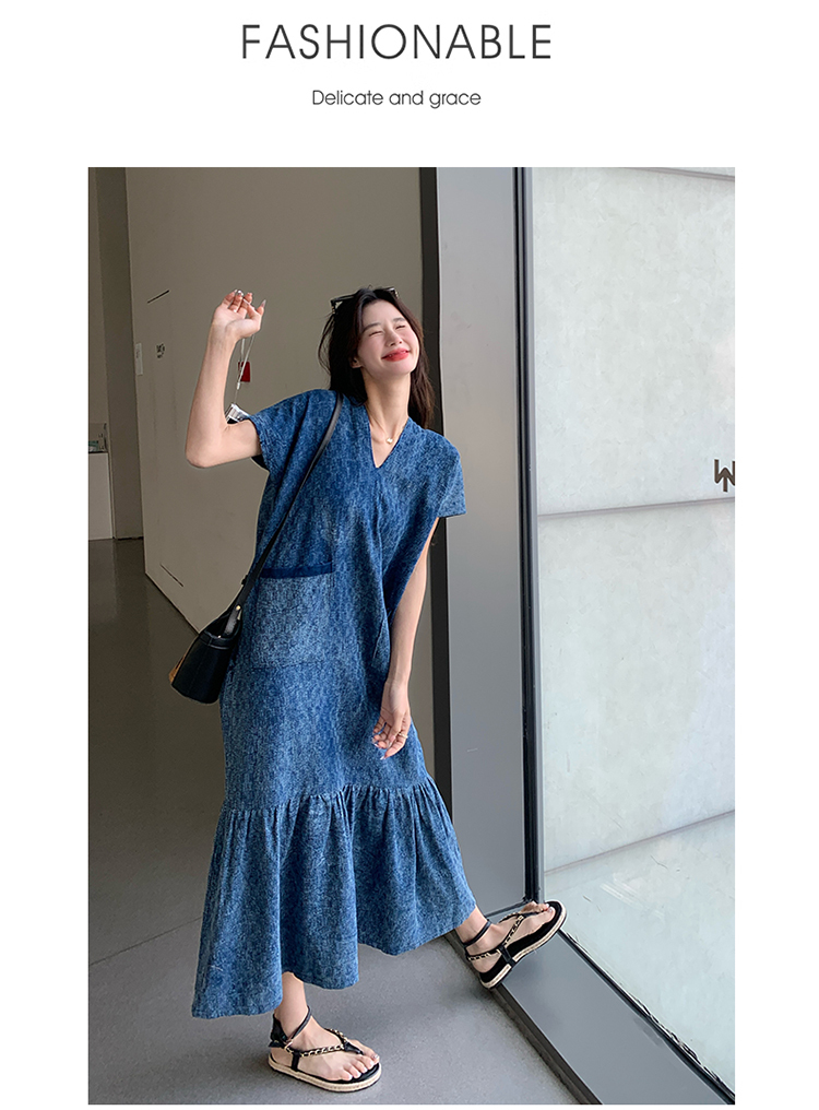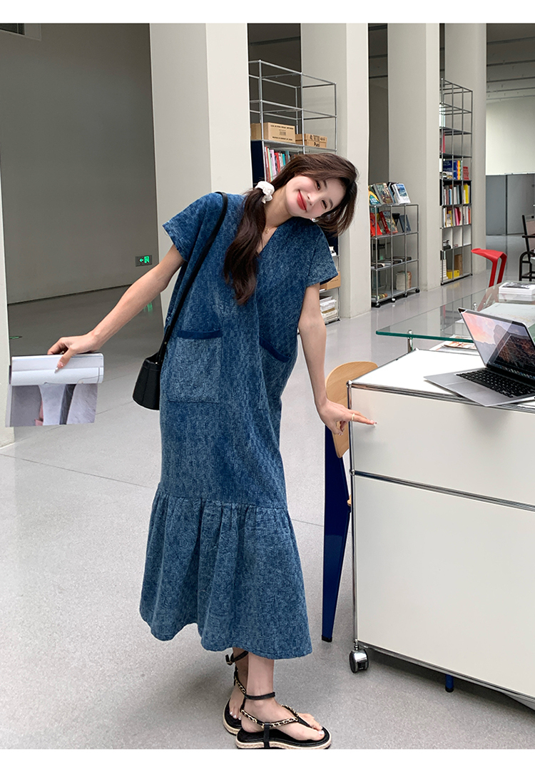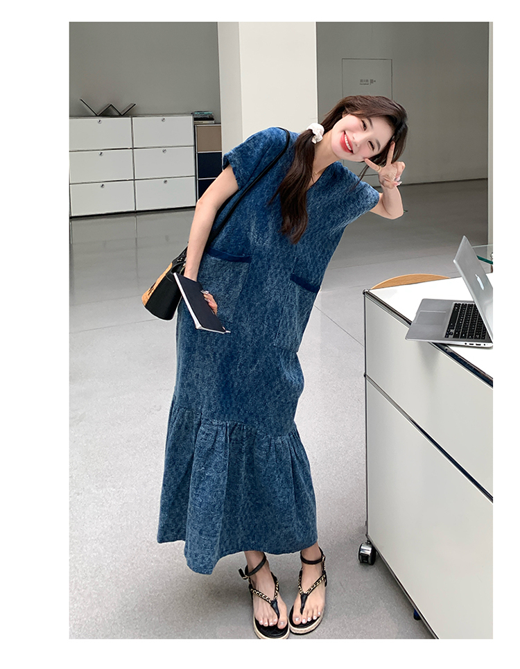 獨家訂製│韓系甜姊兒V領大口袋牛仔魚尾連衣裙(06H6631)