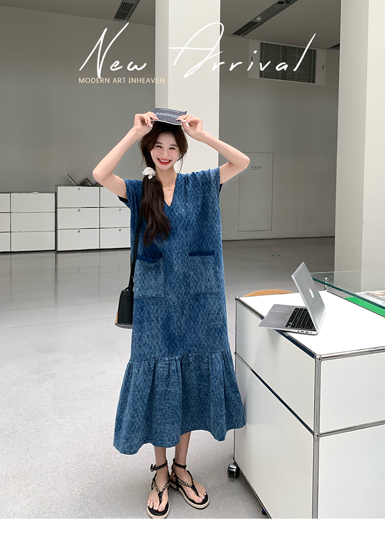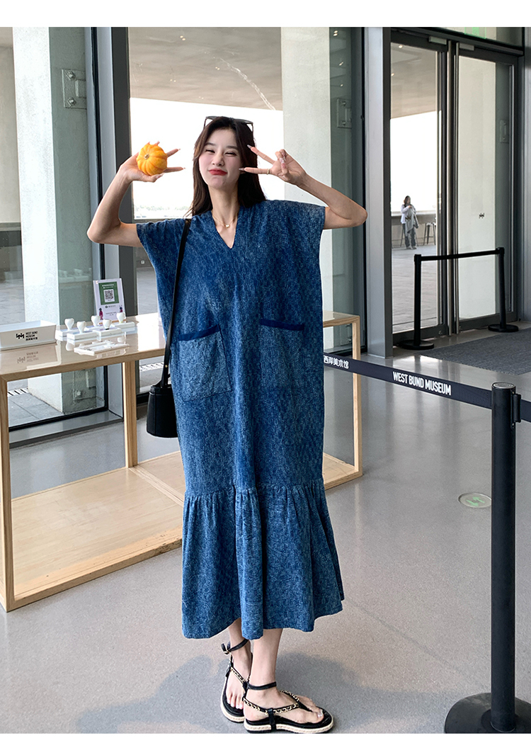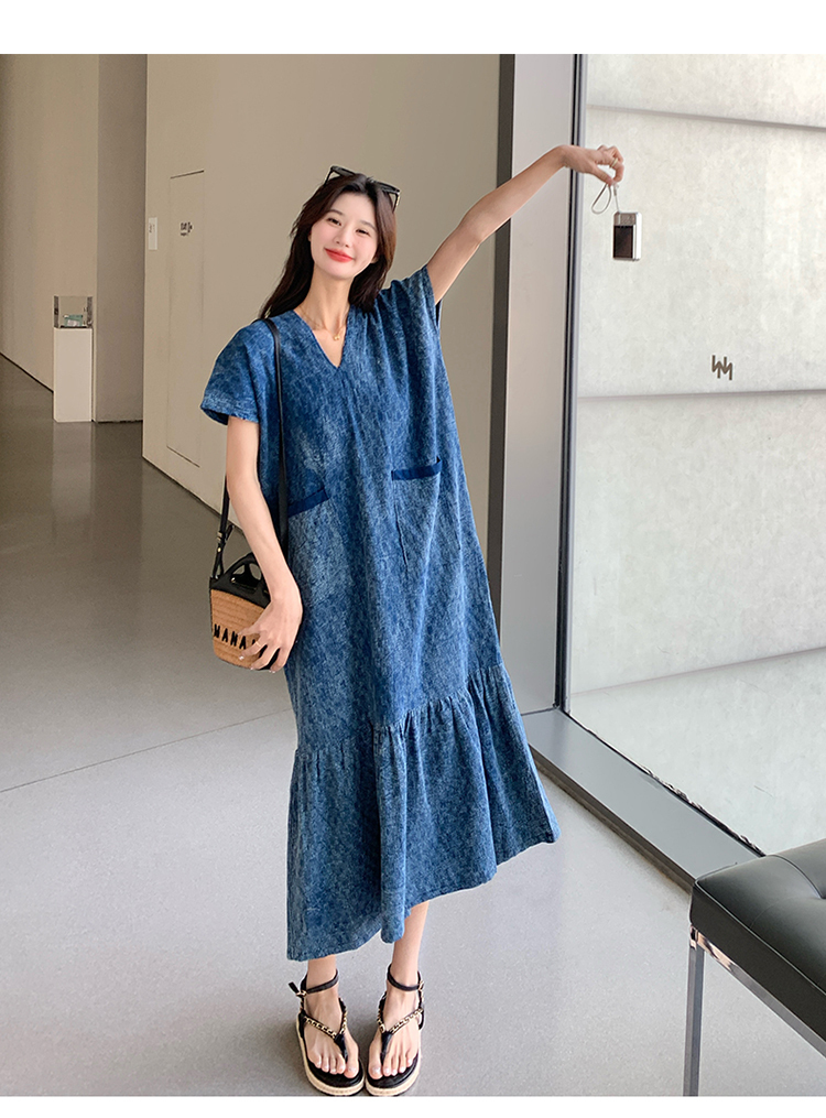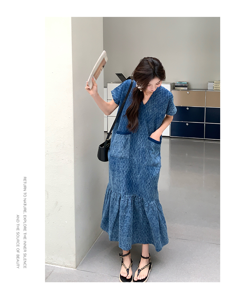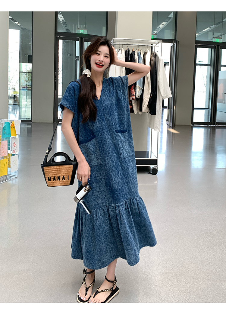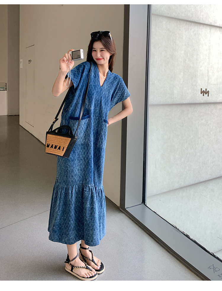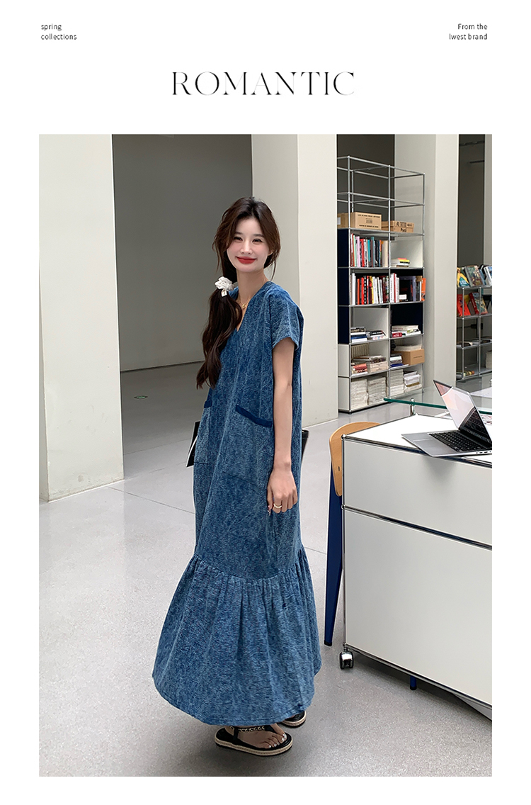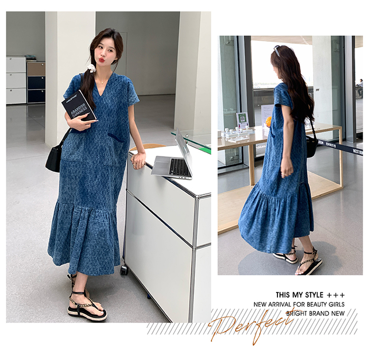 獨家訂製│韓系甜姊兒V領大口袋牛仔魚尾連衣裙(06H6631)