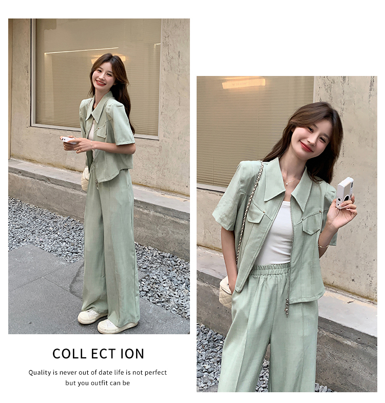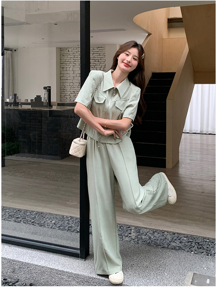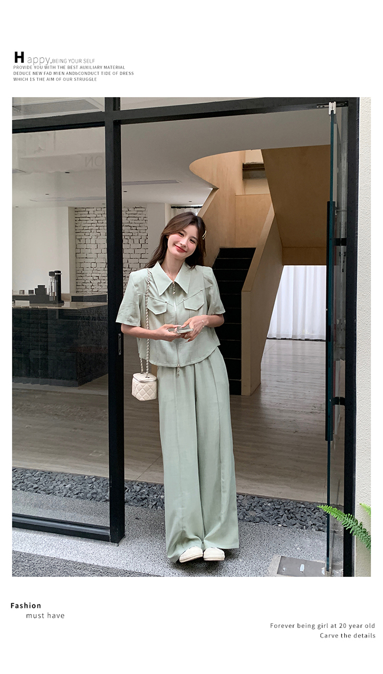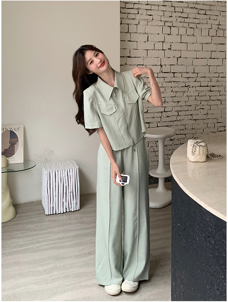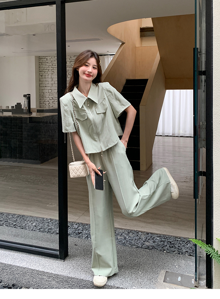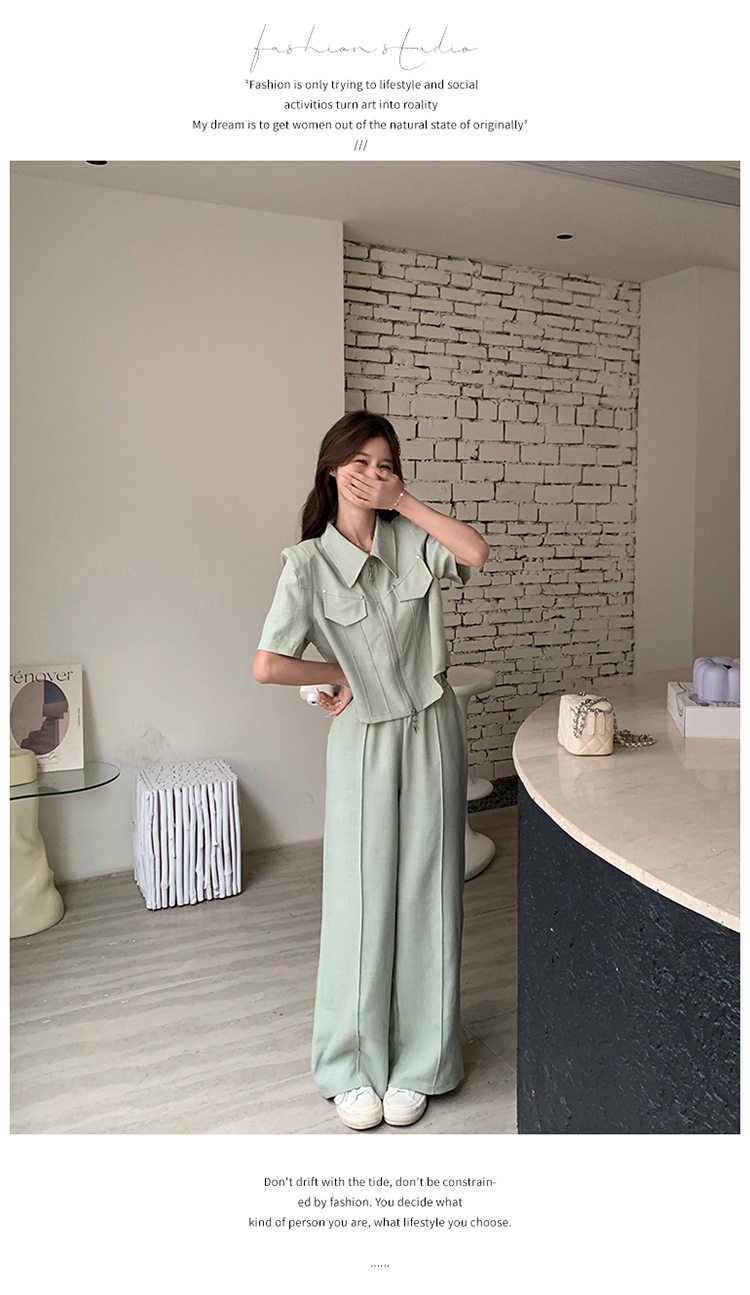 獨家訂製│韓系復古翻領拉鍊外套+闊腿褲兩件式套裝組(06H6770)