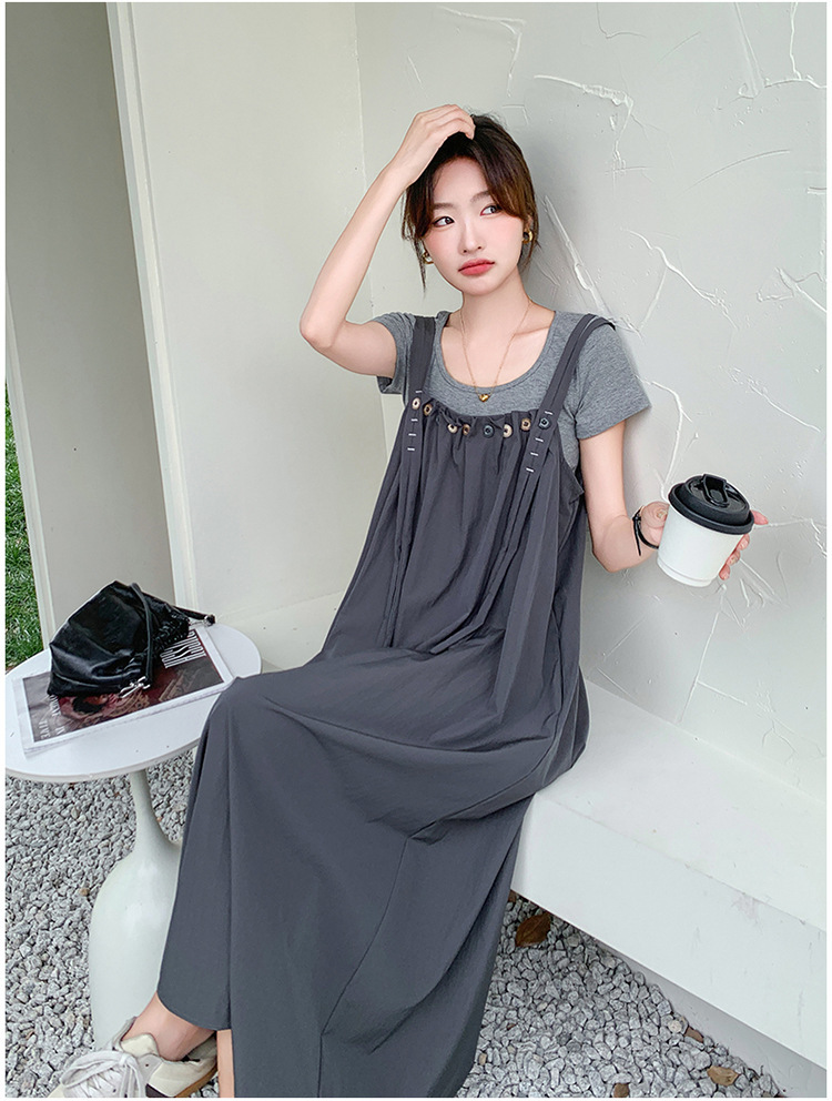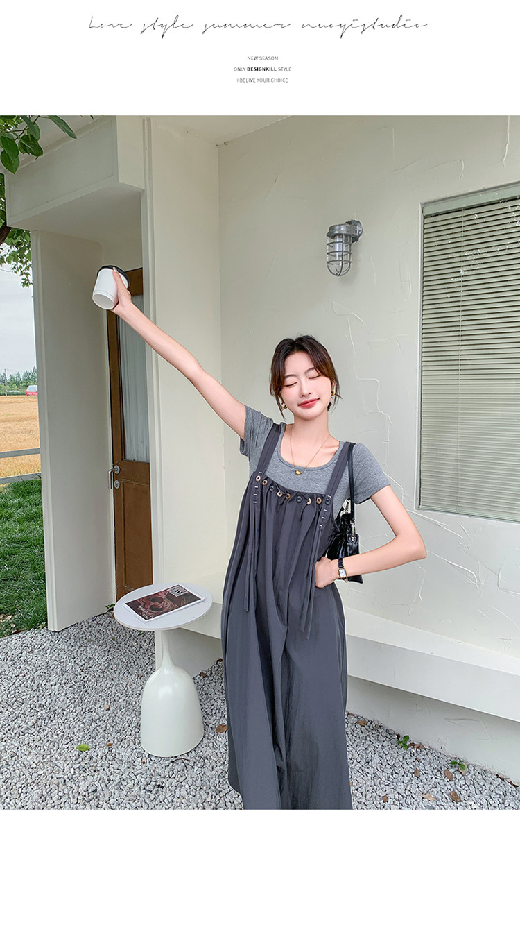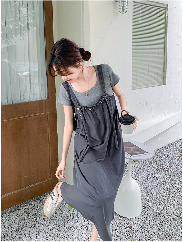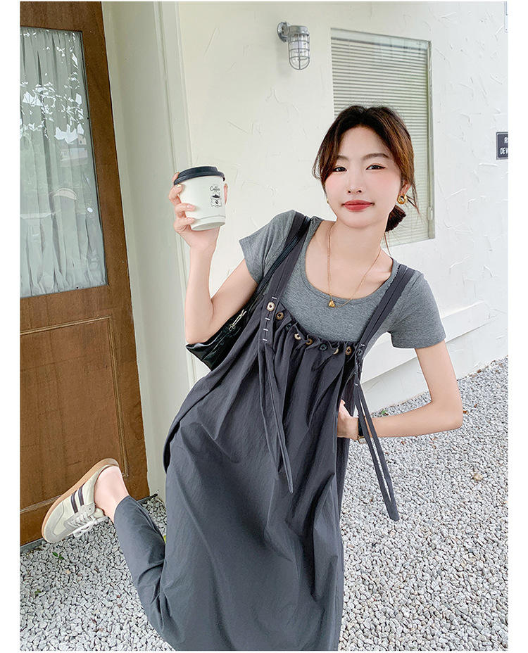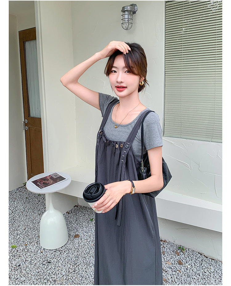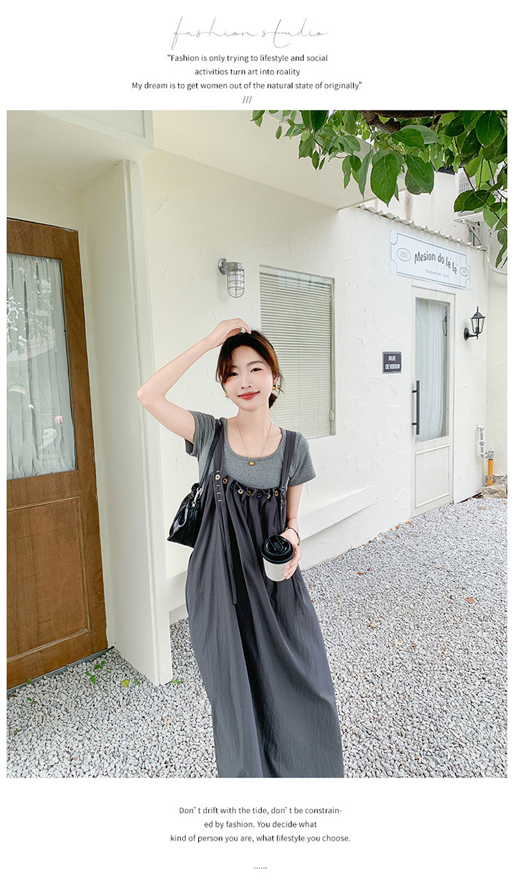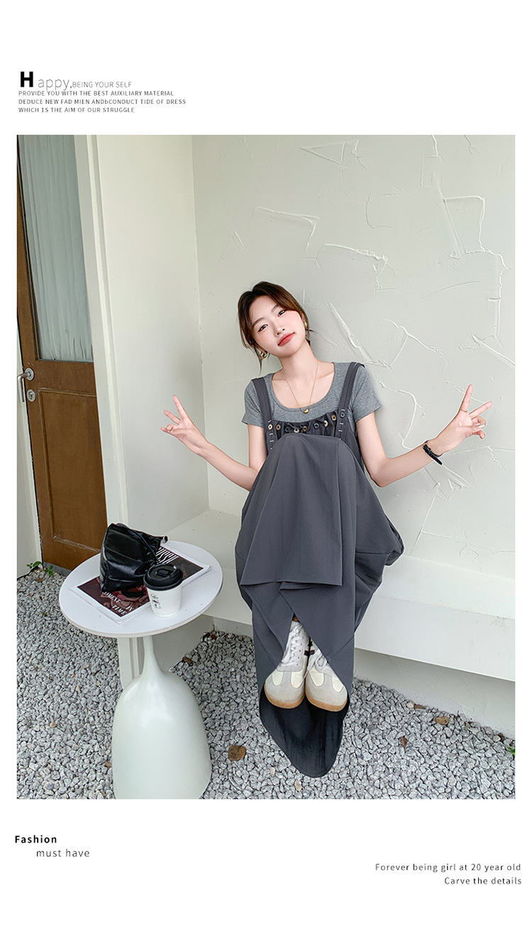 獨家訂製│韓系減齡感T恤+抓褶釘扣吊帶裙兩件式套裝組(06H6839)