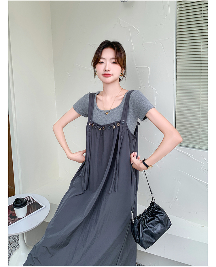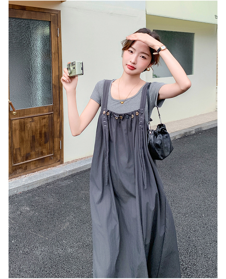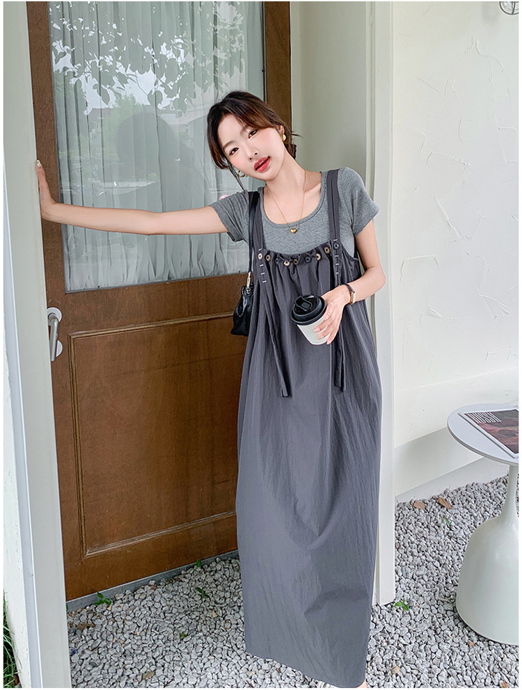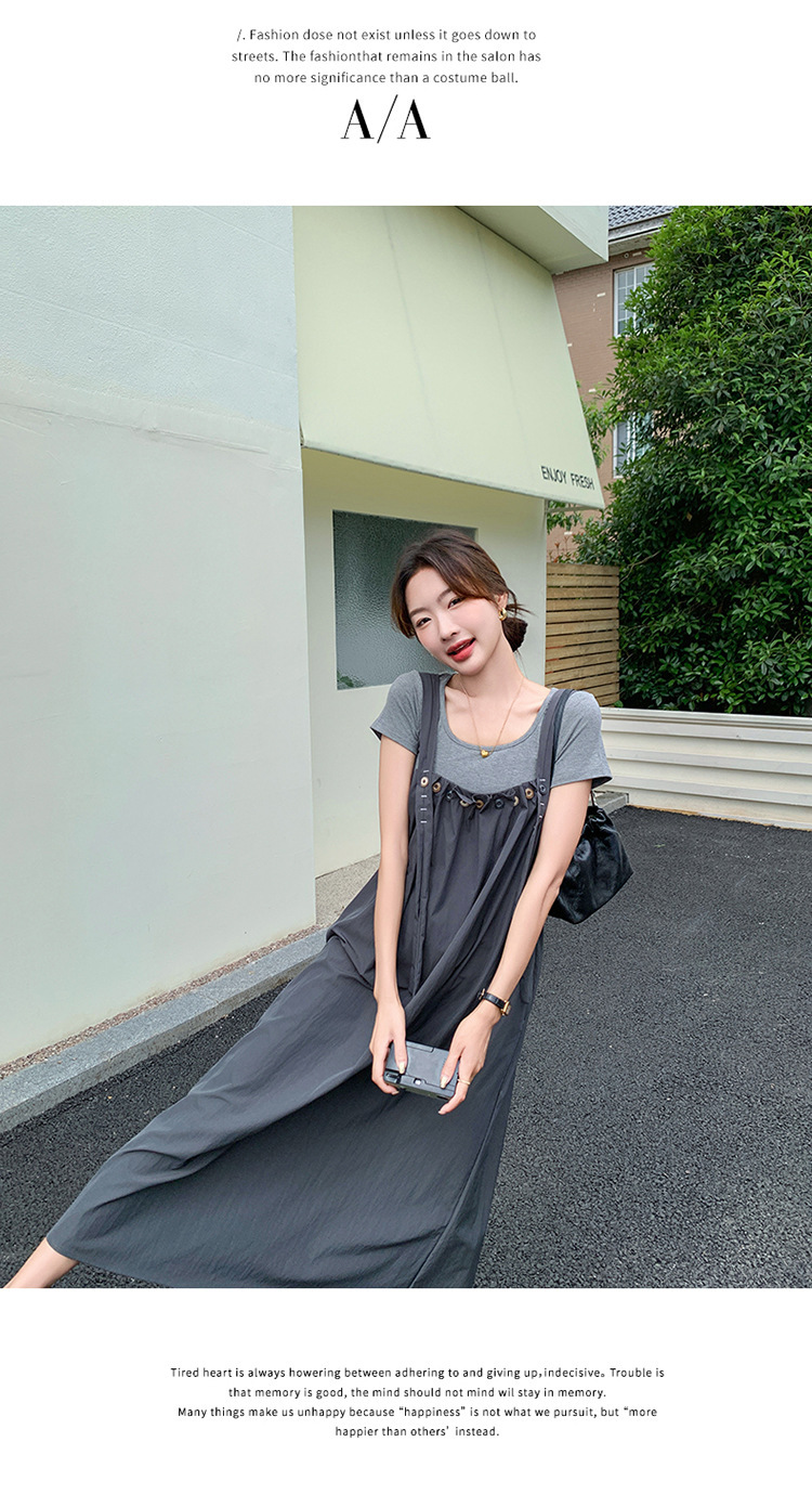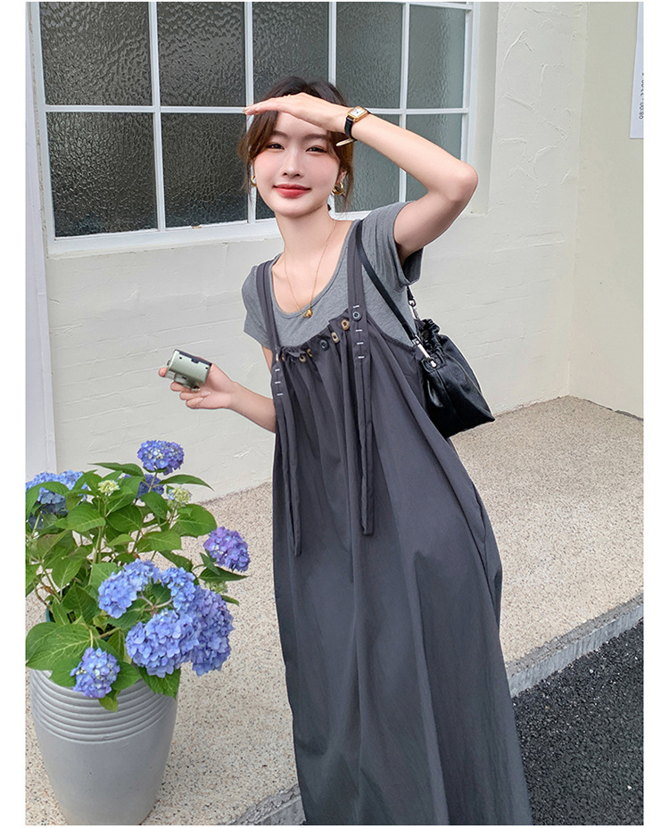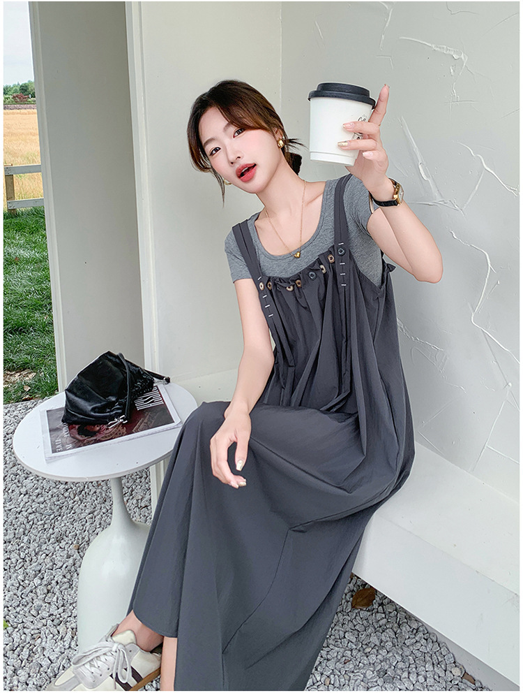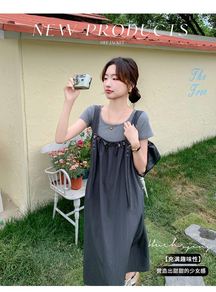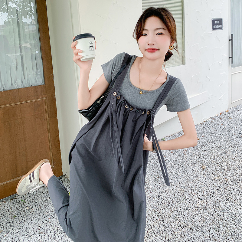 獨家訂製│韓系減齡感T恤+抓褶釘扣吊帶裙兩件式套裝組(06H6839)