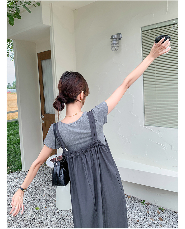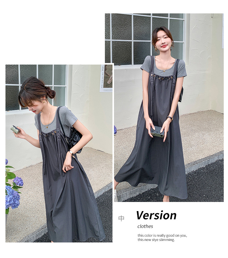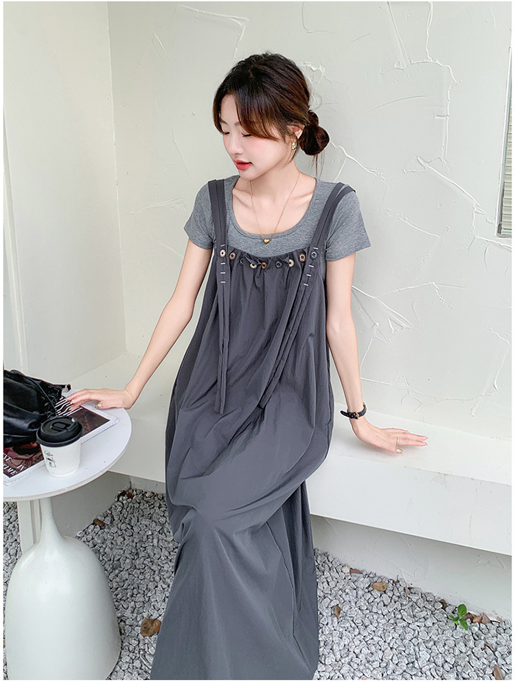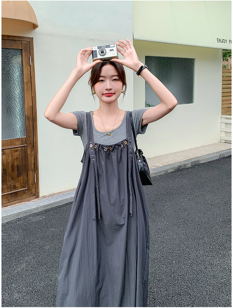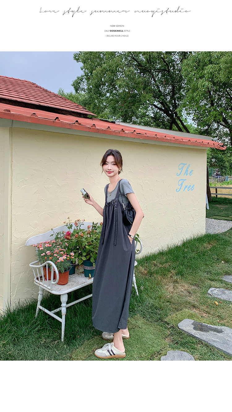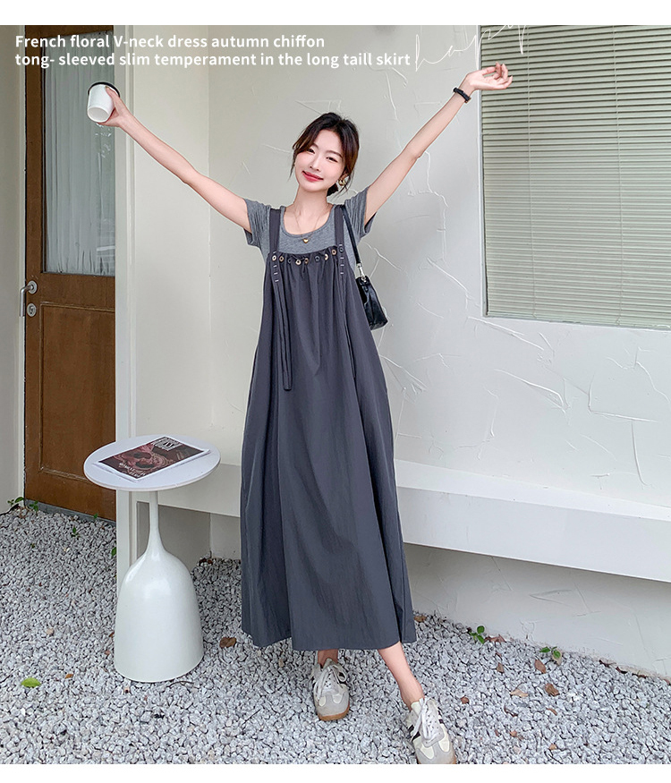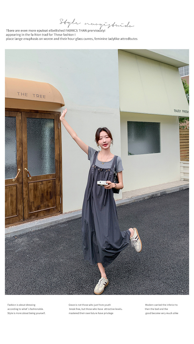 獨家訂製│韓系減齡感T恤+抓褶釘扣吊帶裙兩件式套裝組(06H6839)