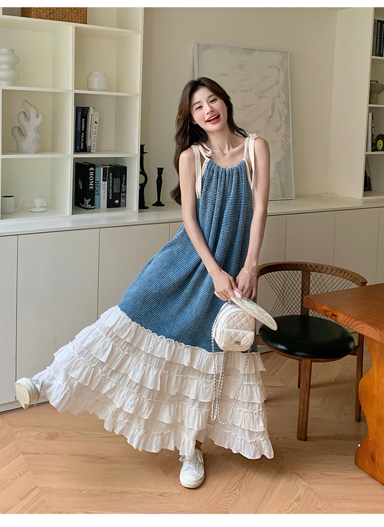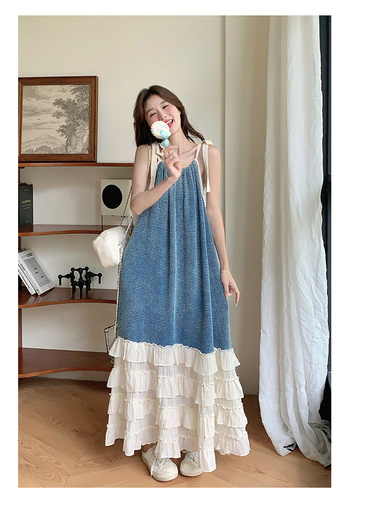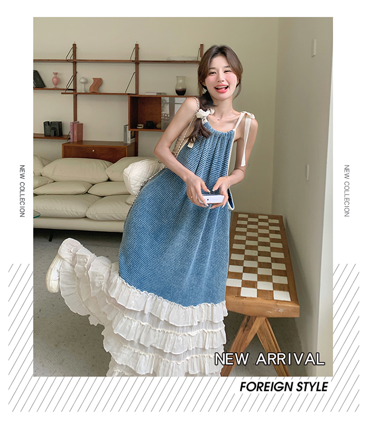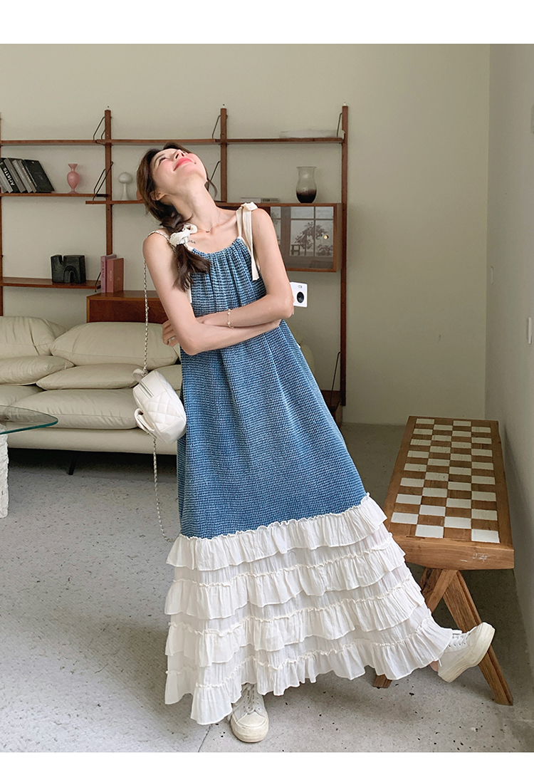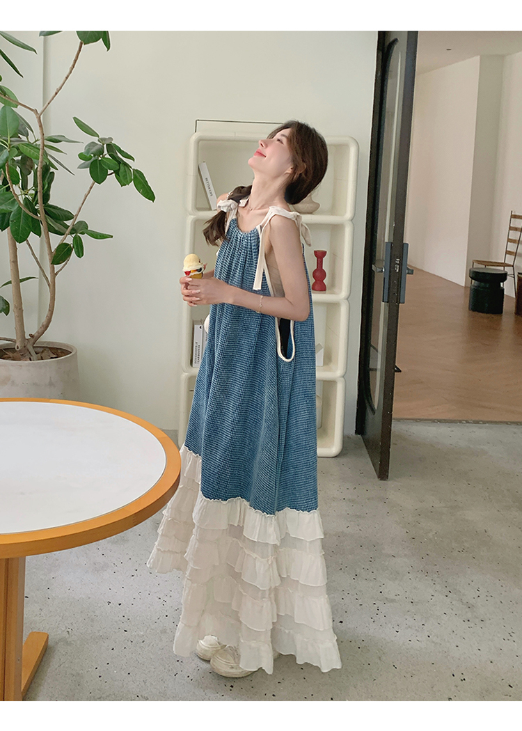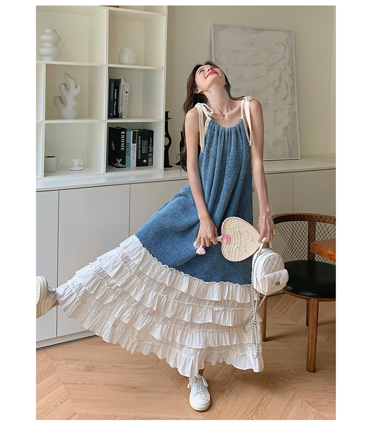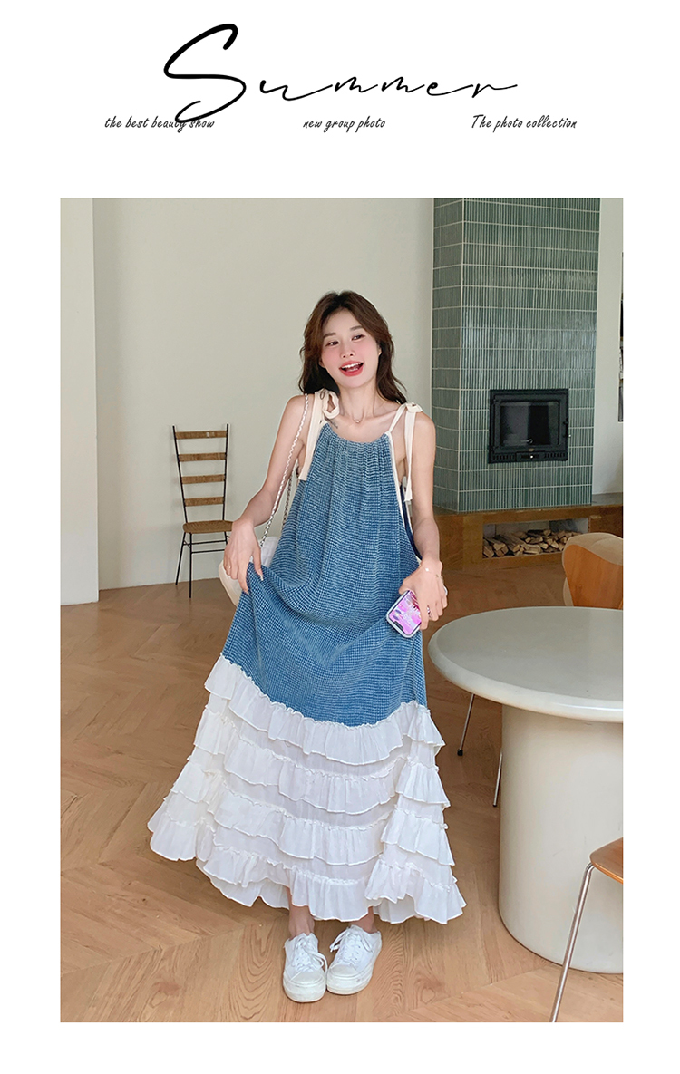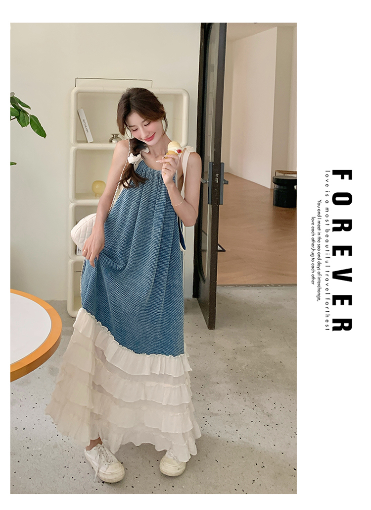 獨家訂製│韓系渡假風荷葉層裙襬拼接連身吊帶裙(06H6883)