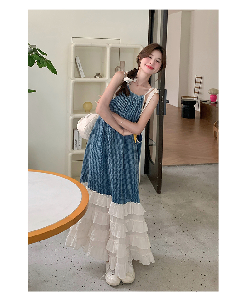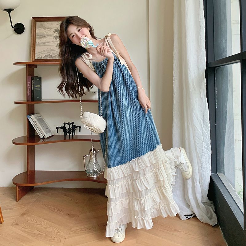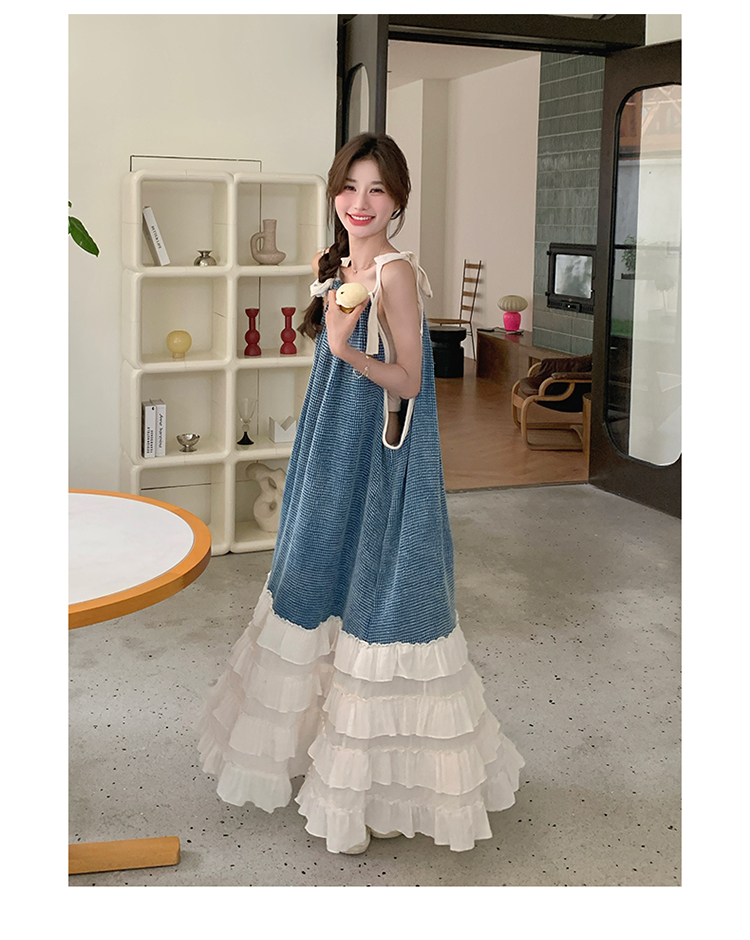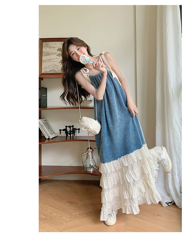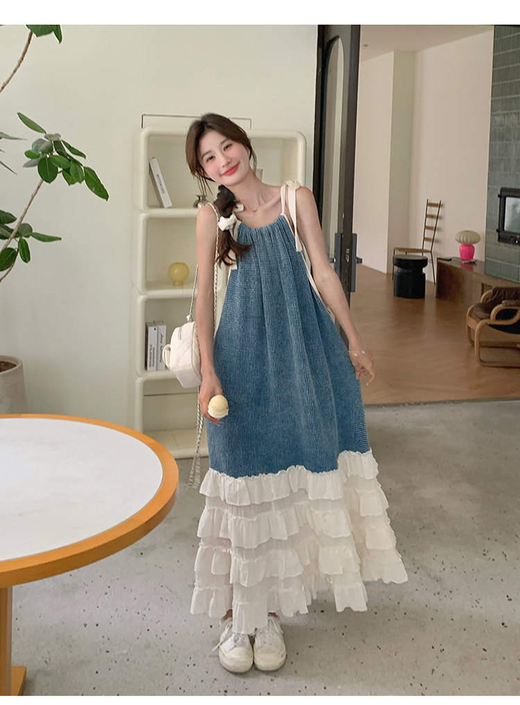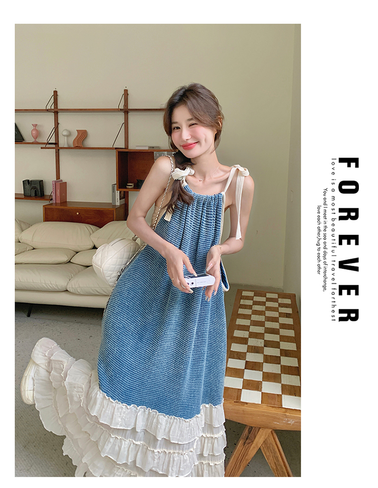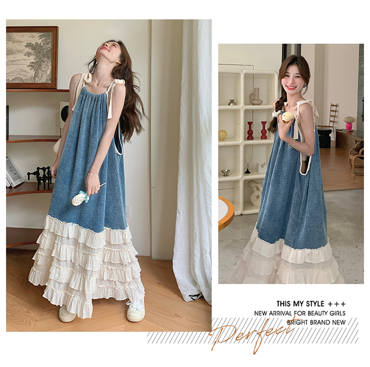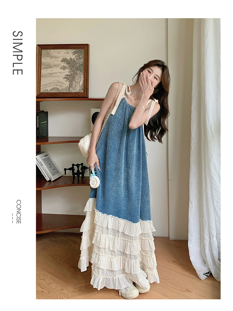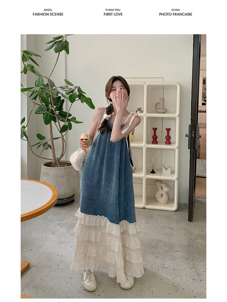 獨家訂製│韓系渡假風荷葉層裙襬拼接連身吊帶裙(06H6883)