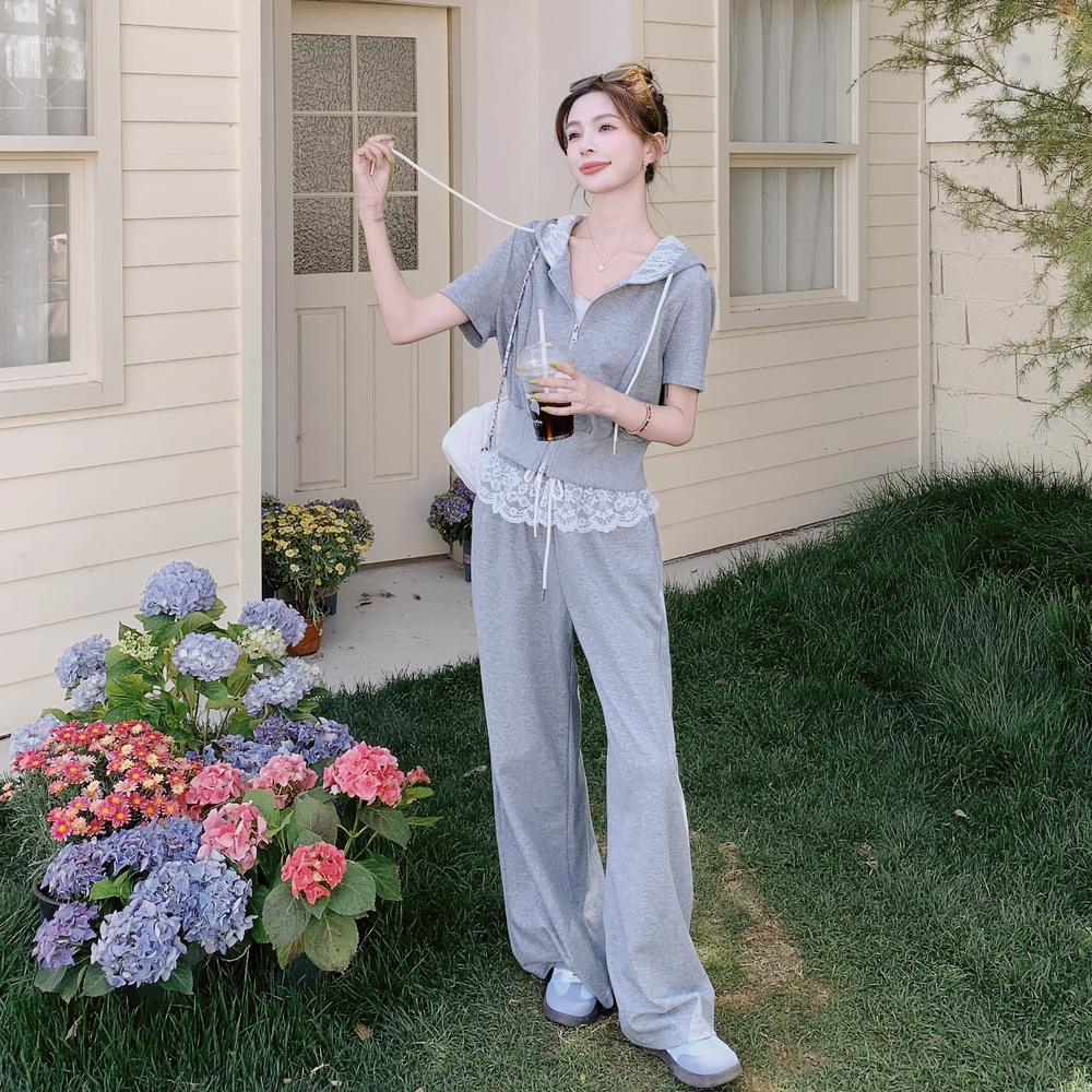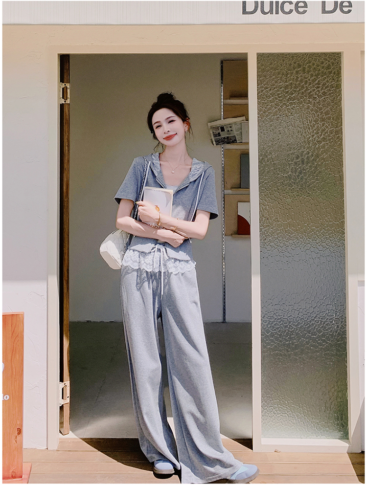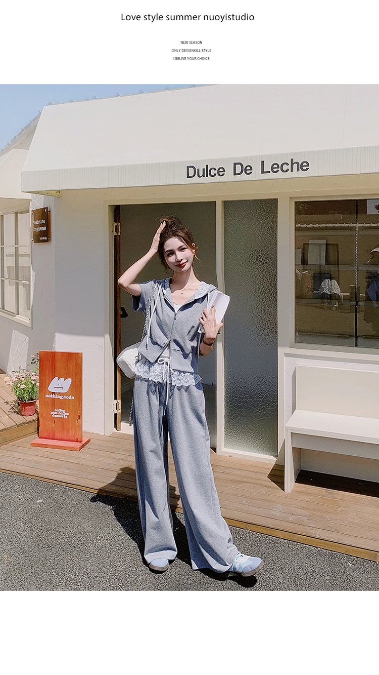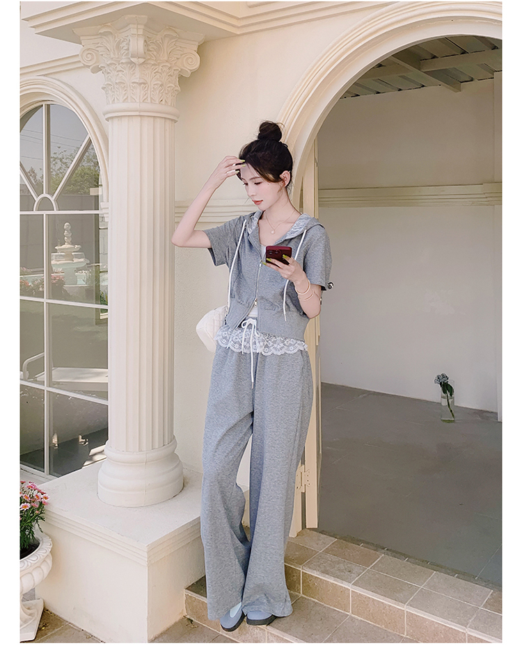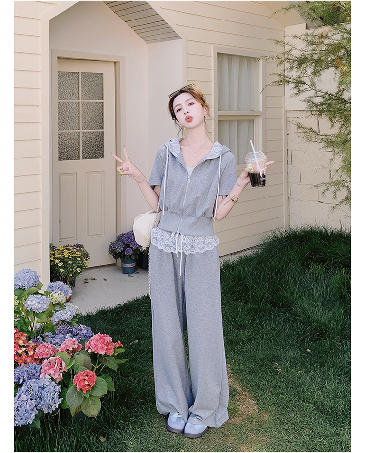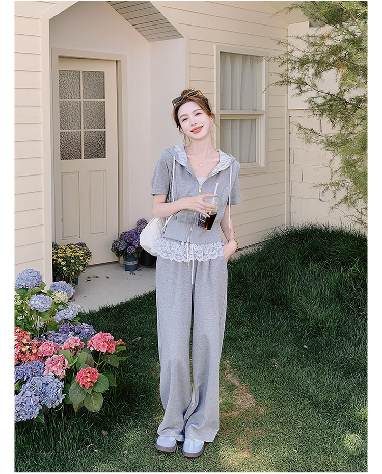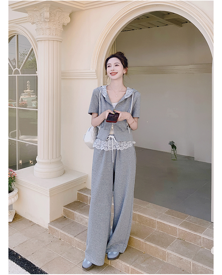 獨家訂製│2件式 連帽短袖外套+蕾絲拼接休閒褲(07A1404)