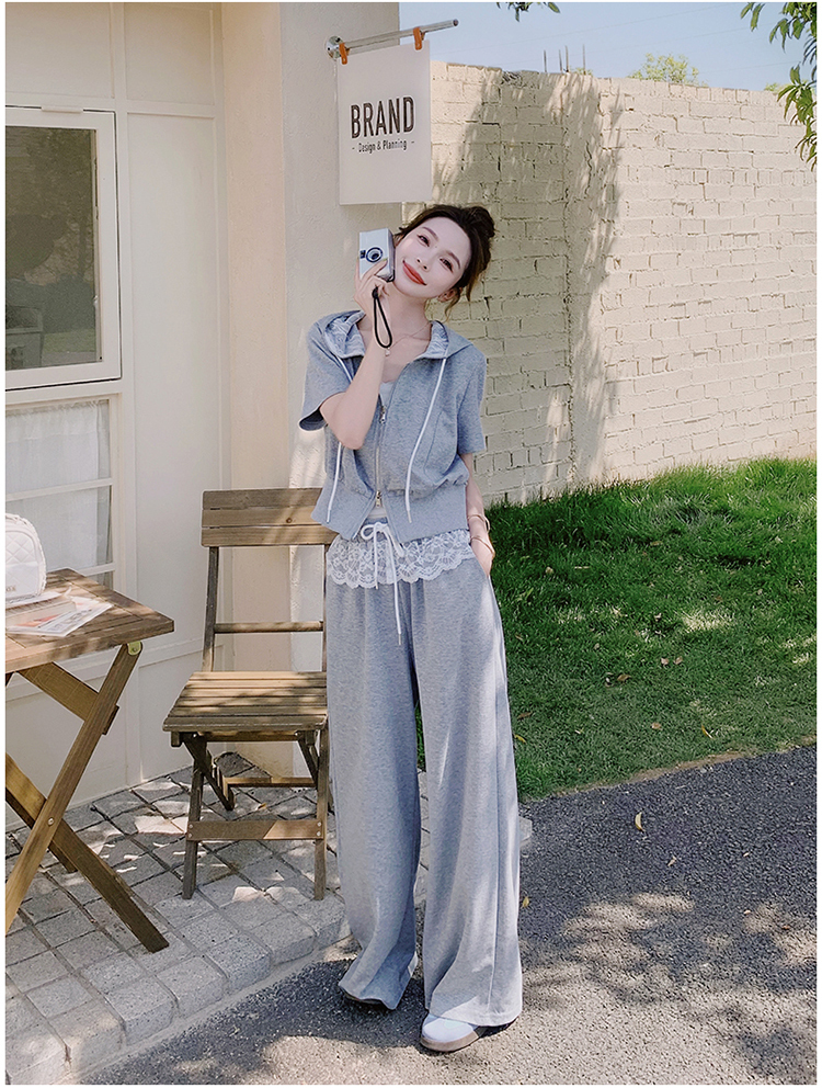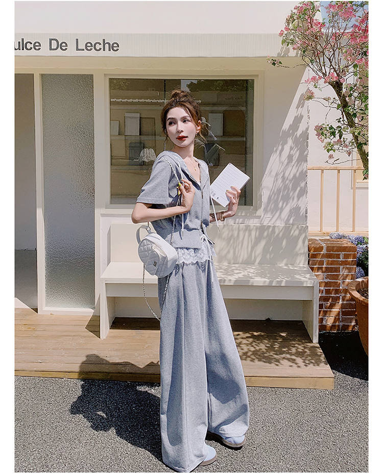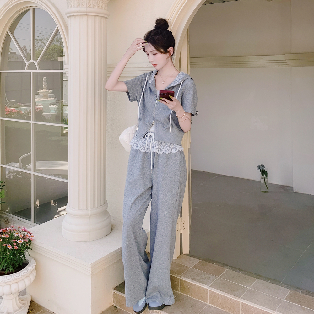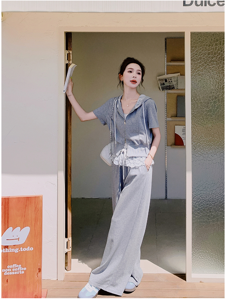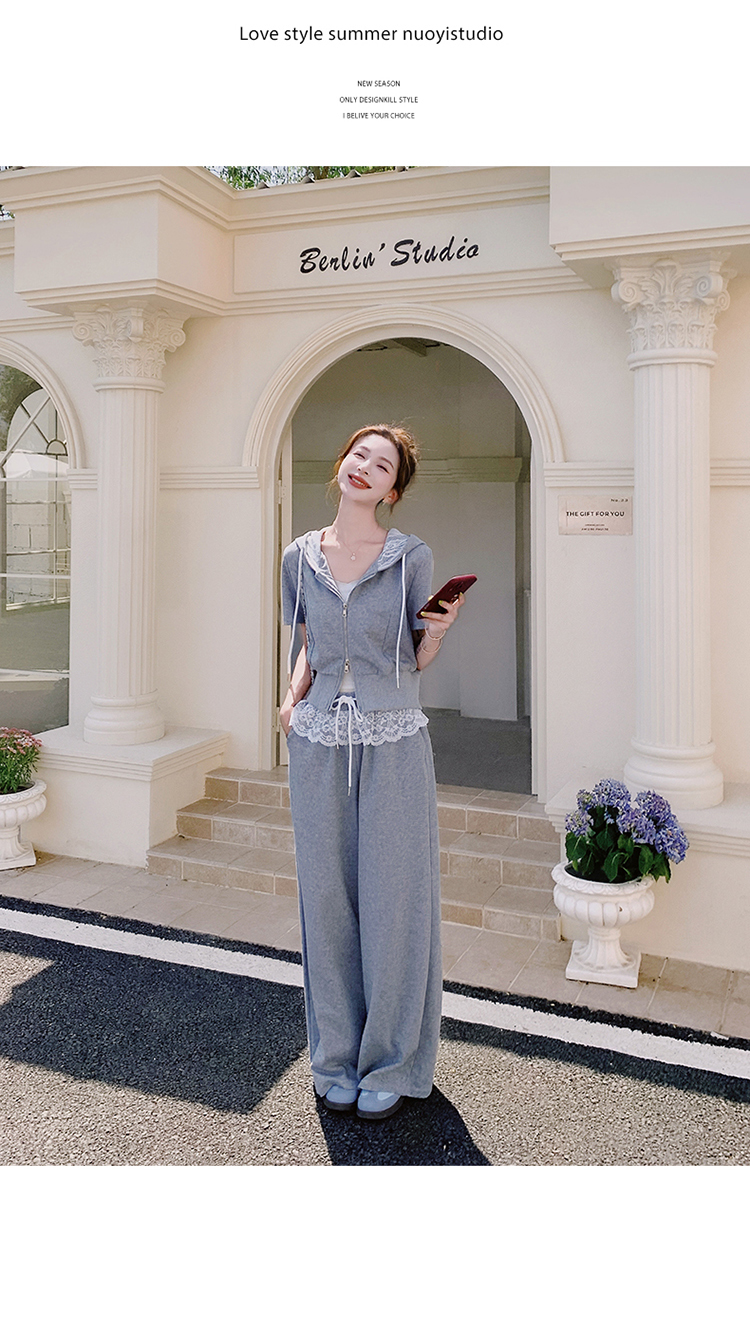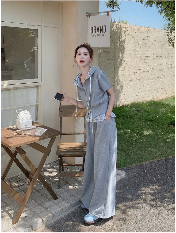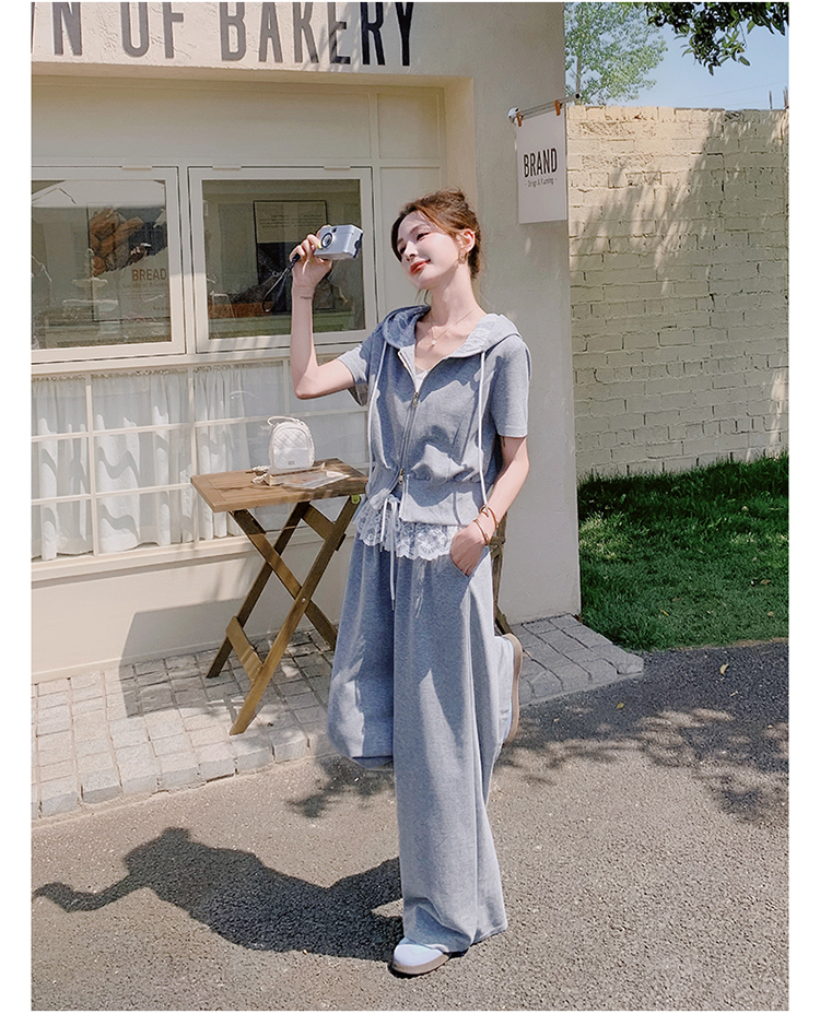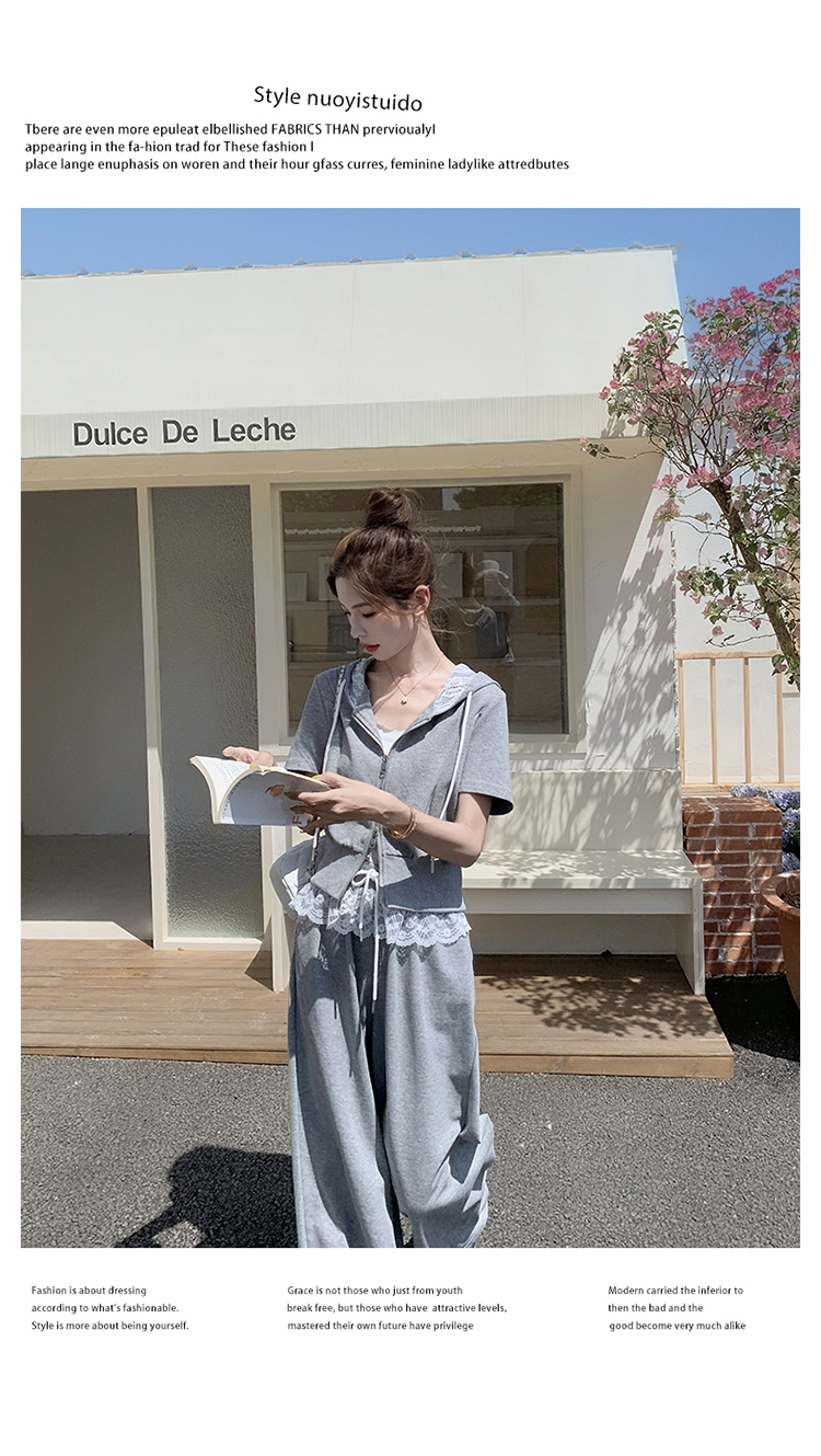 獨家訂製│2件式 連帽短袖外套+蕾絲拼接休閒褲(07A1404)