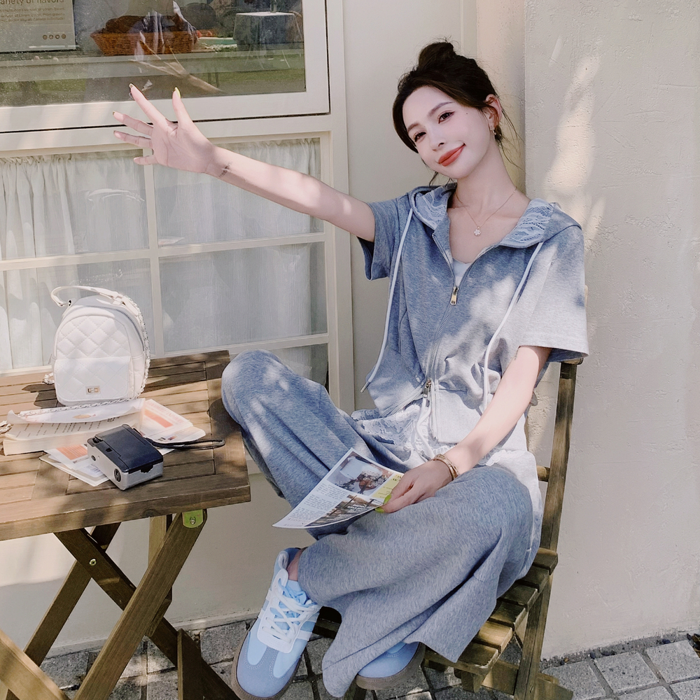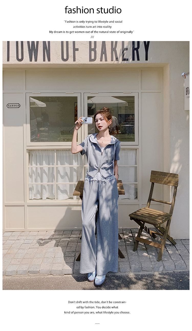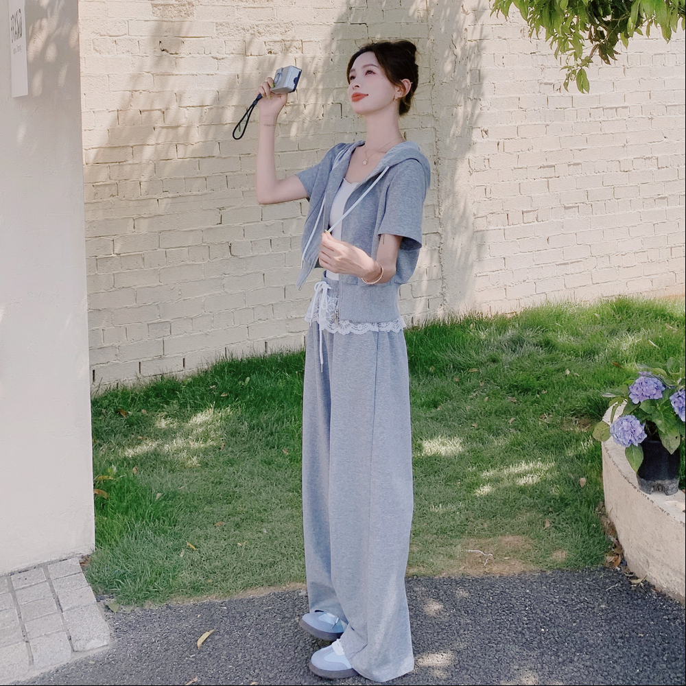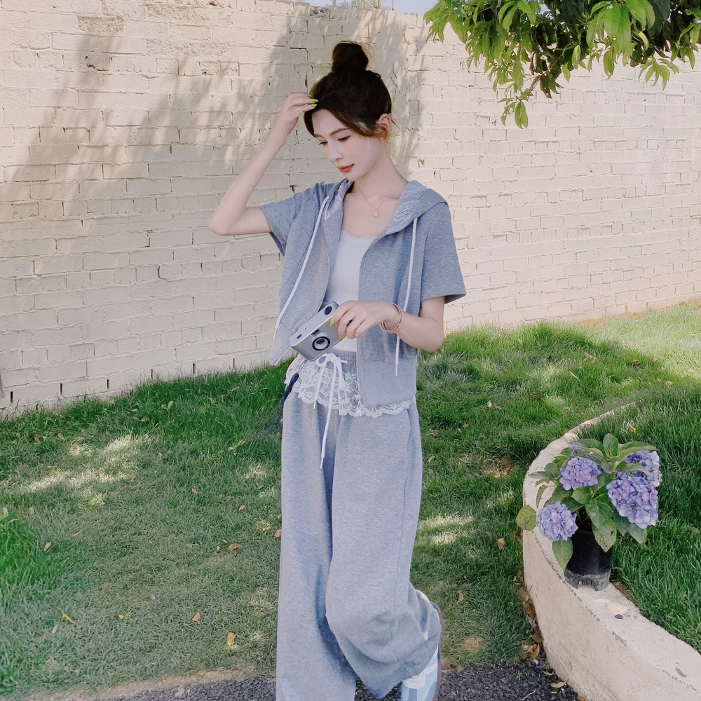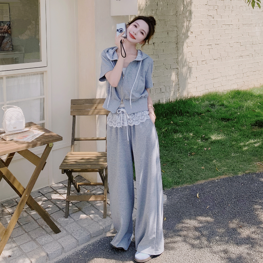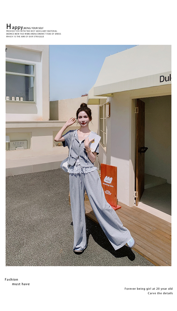 獨家訂製│2件式 連帽短袖外套+蕾絲拼接休閒褲(07A1404)