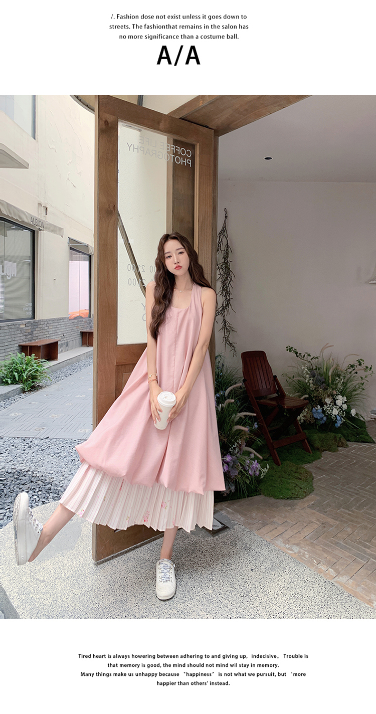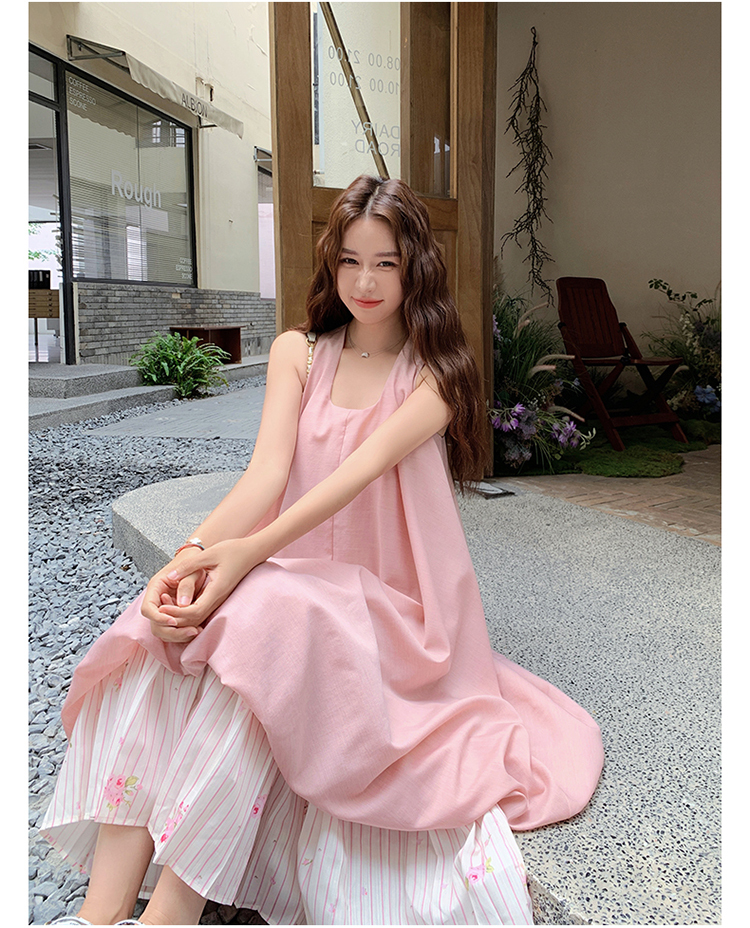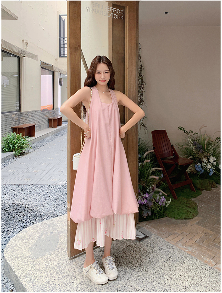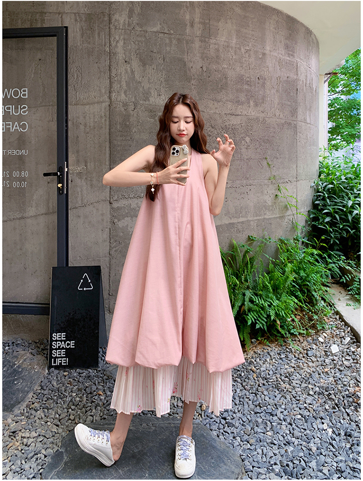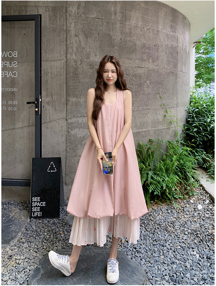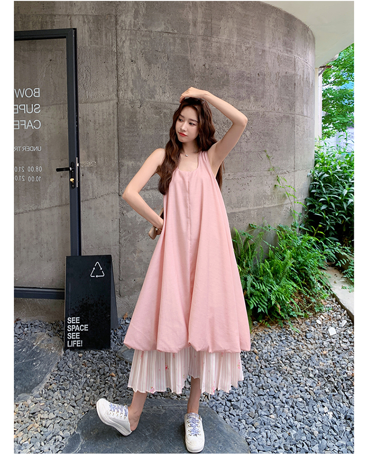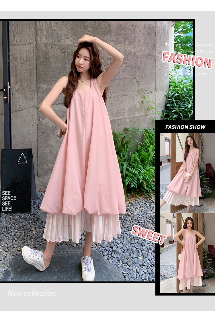 獨家訂製│假2件連衣裙 條紋百褶拼接背心洋裝(07A1589)