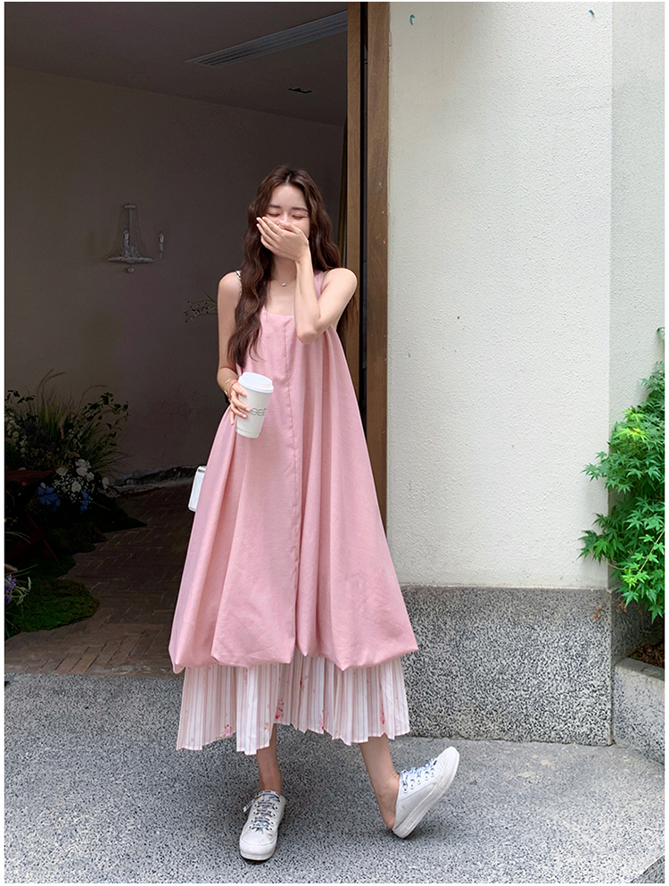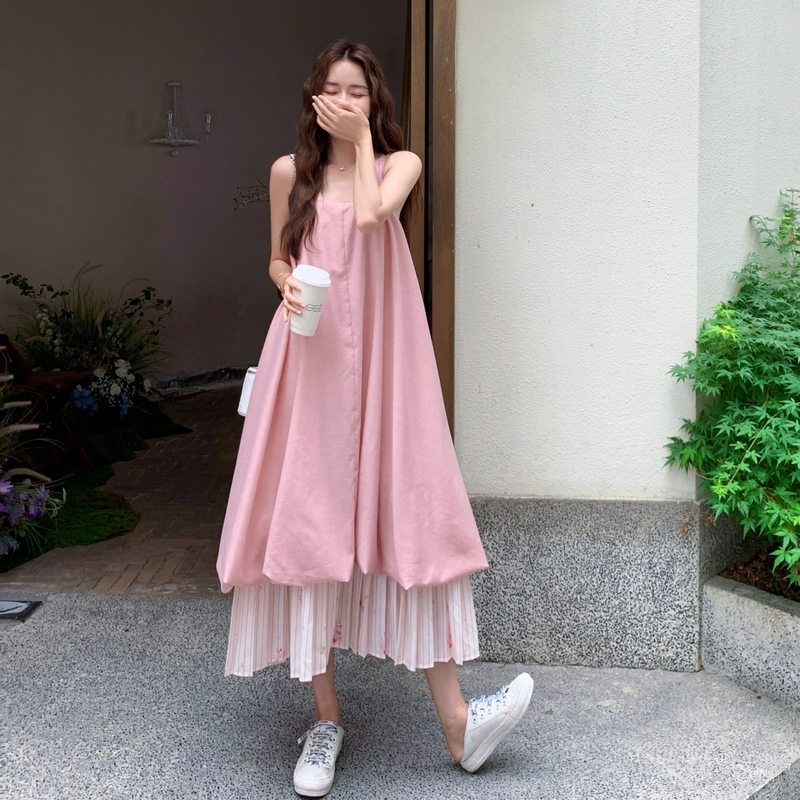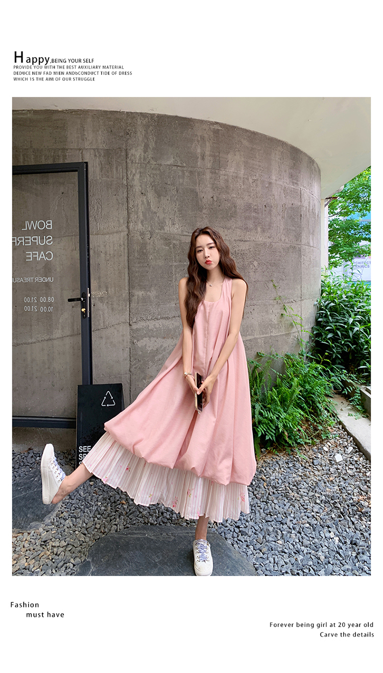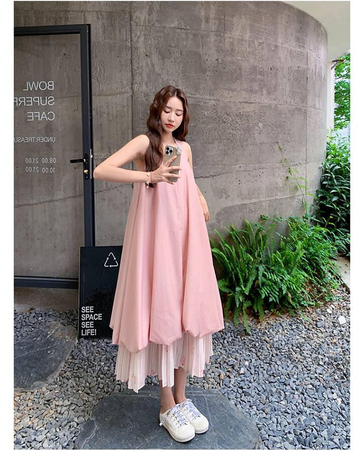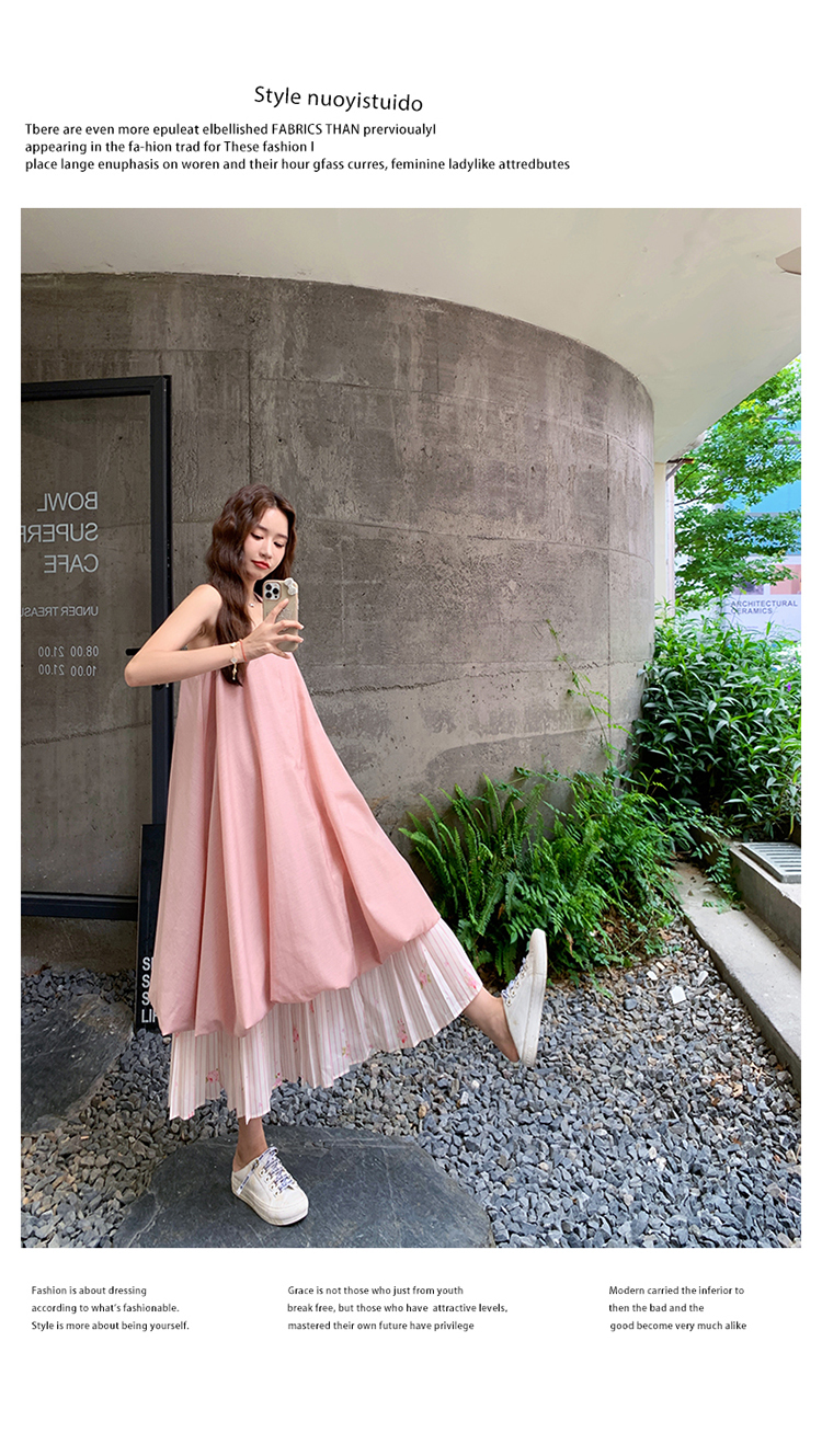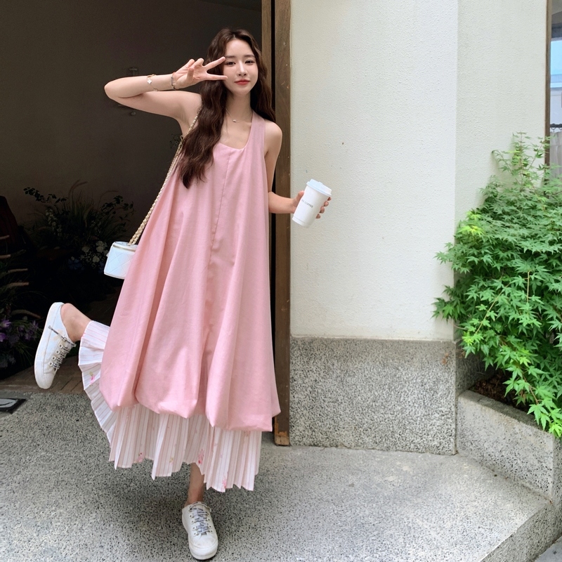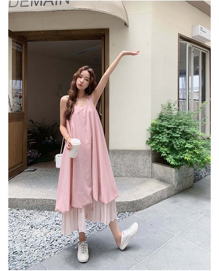 獨家訂製│假2件連衣裙 條紋百褶拼接背心洋裝(07A1589)