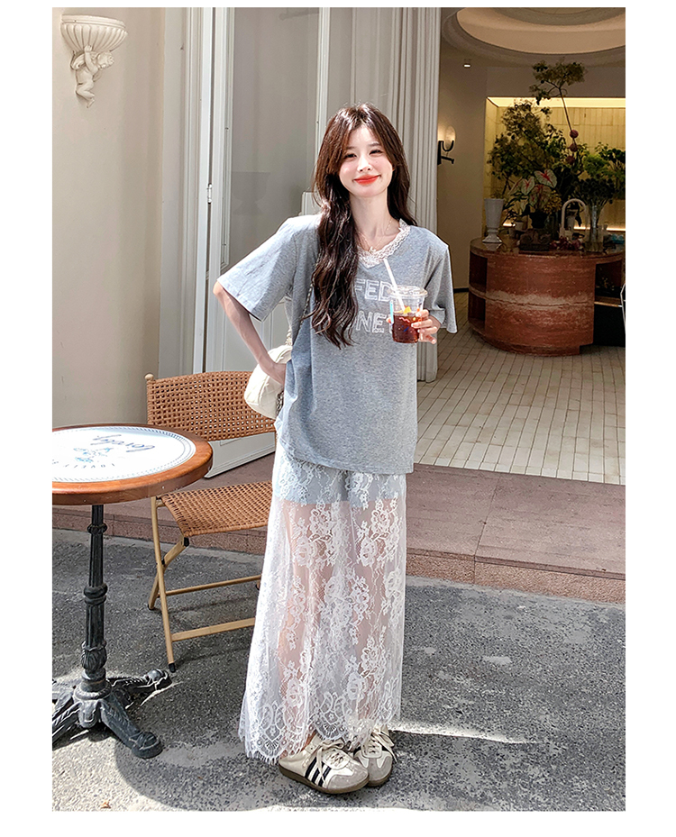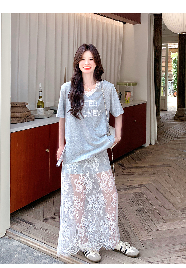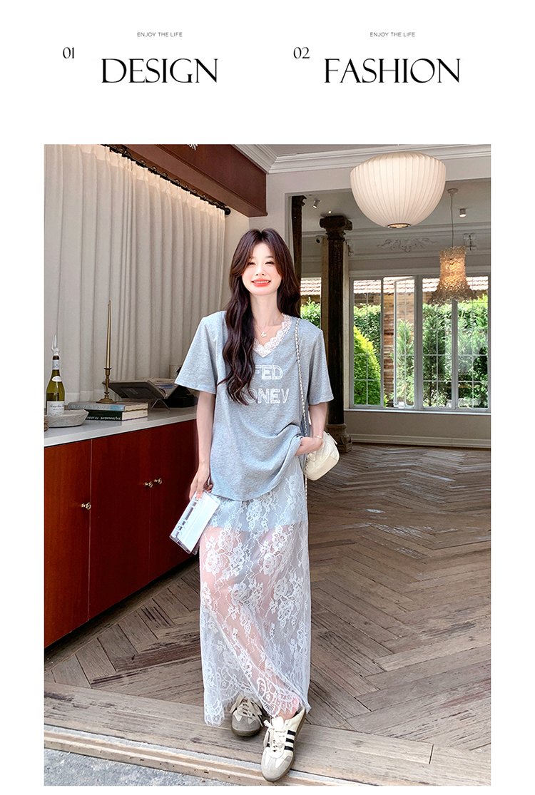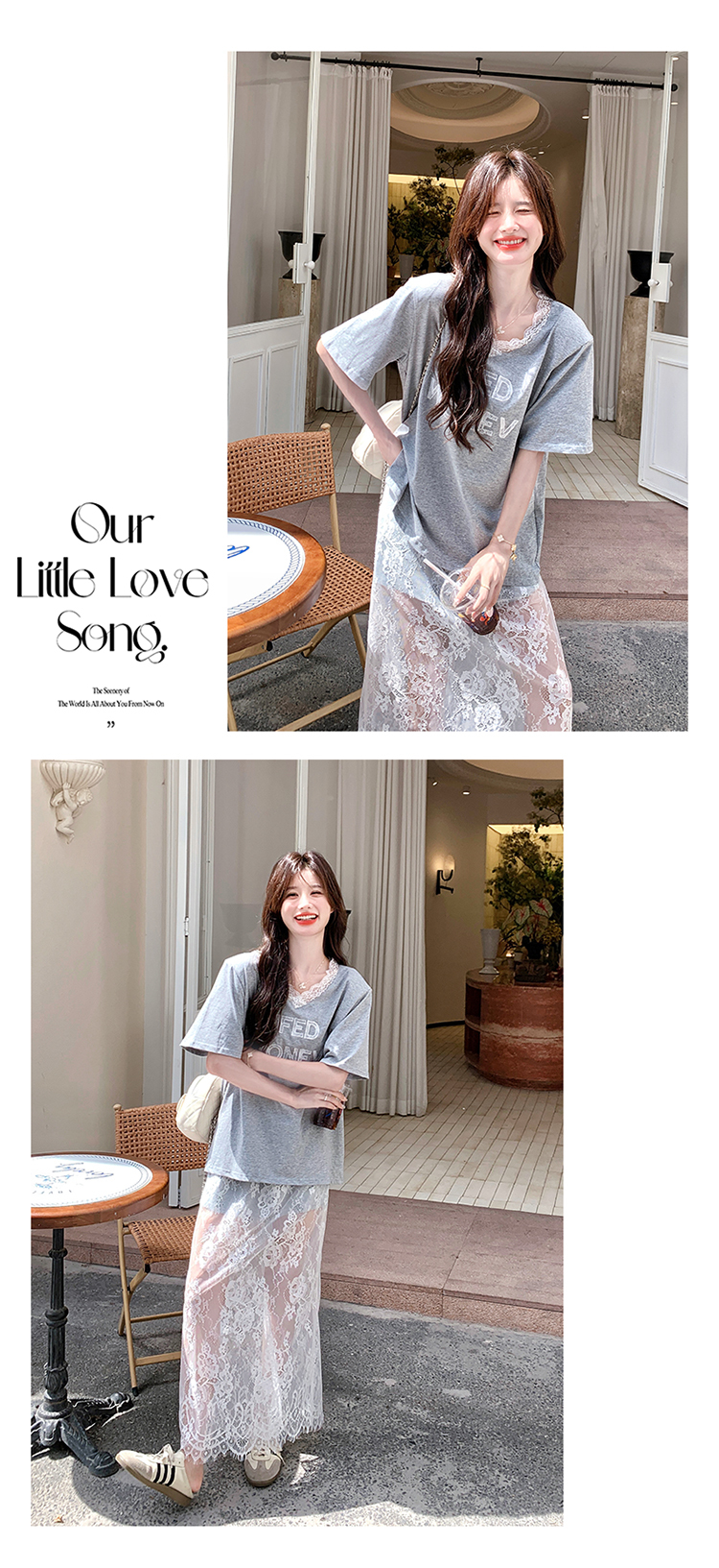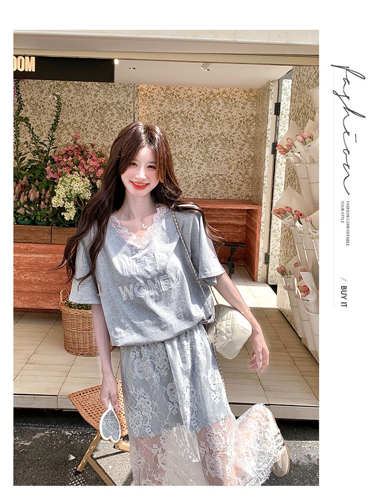 獨家訂製│2件式 V領蕾絲拼接T恤+蕾絲拼接假兩件A字裙(07A1592)